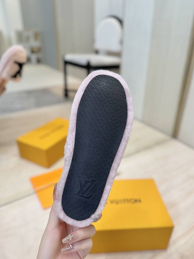 Factory Price: Top-tier Louis Vuitton 2025S New Wool Home Slippers. Elegant, simple, and luxurious, these slippers are a must-have. The simplicity belies the fact that you deserve them. The overall design features a minimalist logo on the upper, along with the LV brand image. Upper: Imported wool; Mid-sole: Imported wool; Sole thickness: 2.0cm; Outsole: Rubber; Sizes: 35-42 (Sizes 40, 41, and 42 are non-refundable); Packaging: Original drawer box.