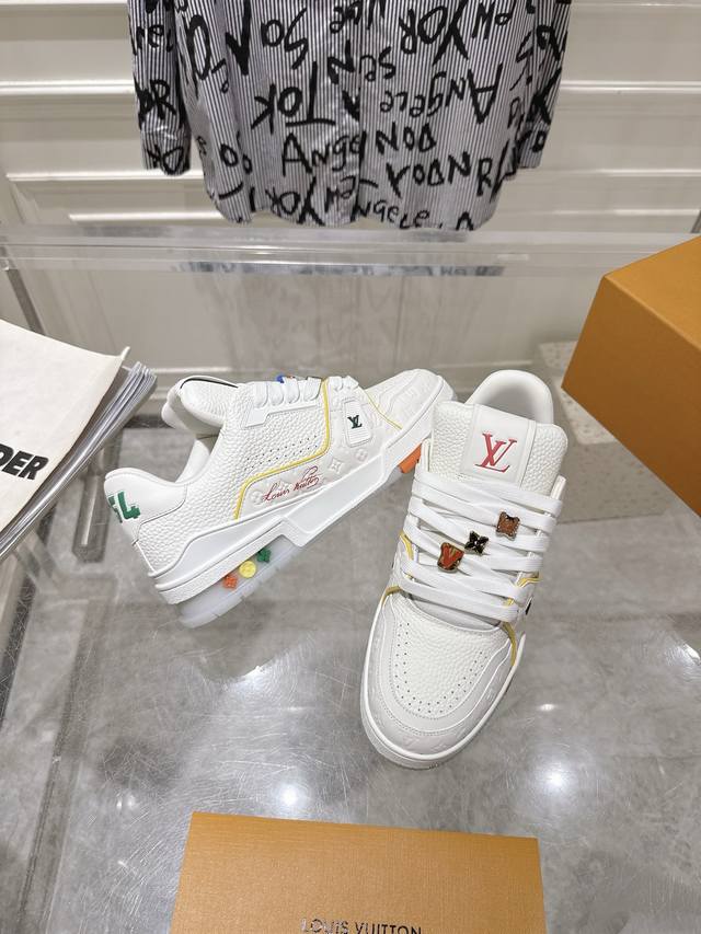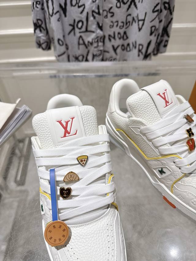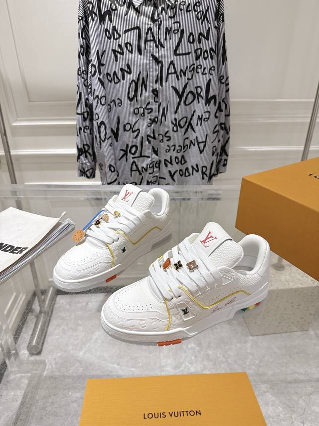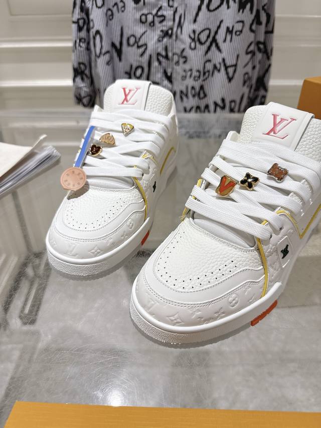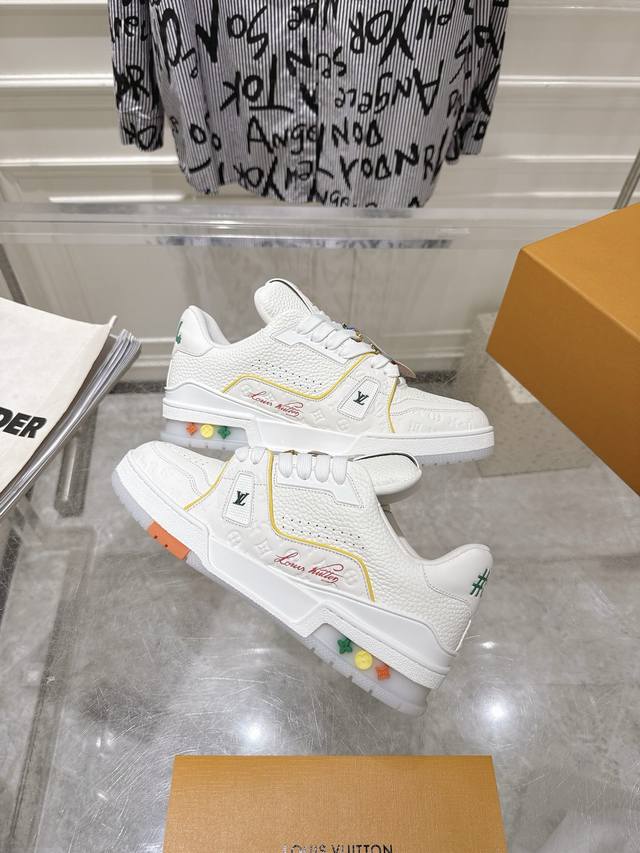 Factory-fitted, picture-matched, cruise-exclusive edition. Lv Tarine, a Louis Vuitton x Tyler collaboration, features embossed couples' casual sneakers and skateboard shoes. Originally purchased and developed, the Louis Vuitton x Tyler collaboration introduces the Lv Trainer sneaker, continuing Virgil Abloh's classic design inspired by retro basketball shoes. The cowhide leather upper incorporates embossed Craggy Monogram patterns and the Louis Vuitton logo, showcasing Tyler's playful interpretation of the Monogram pattern and brand elements. Fabric: Original custom-made top-grain cowhide. Lining: Original custom-made breathable mesh. Outsole: Original, two-tone TPU outsole. Sole thickness: 3cm. Sizes: Women's 35-40, Men's 38-46.