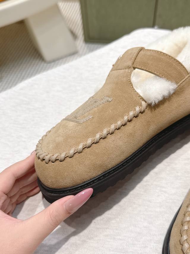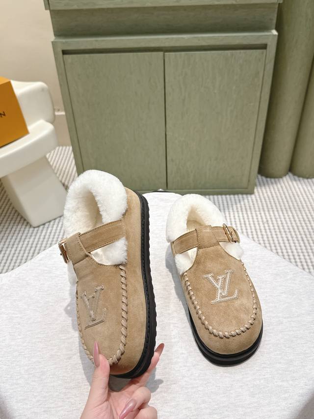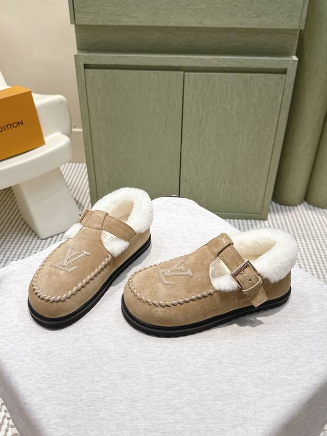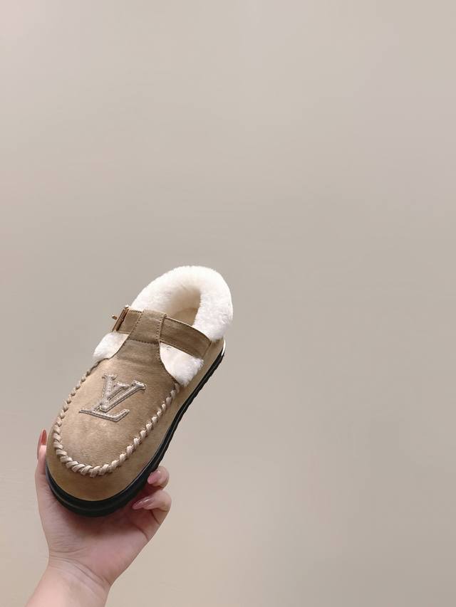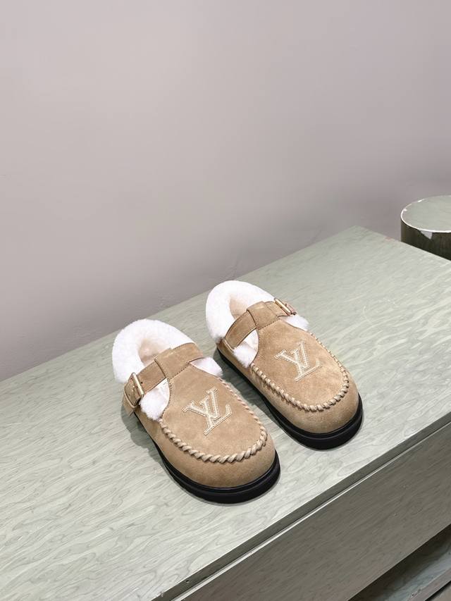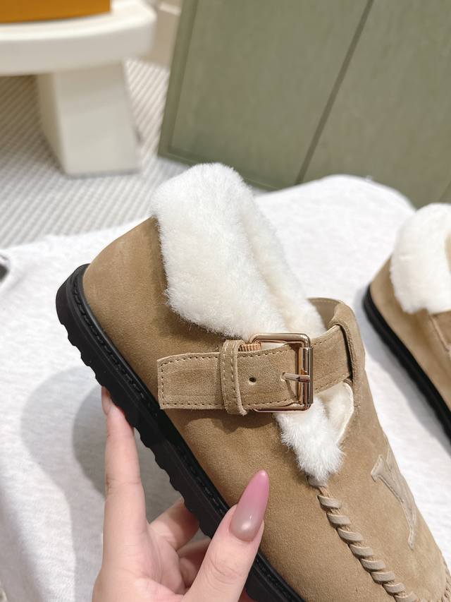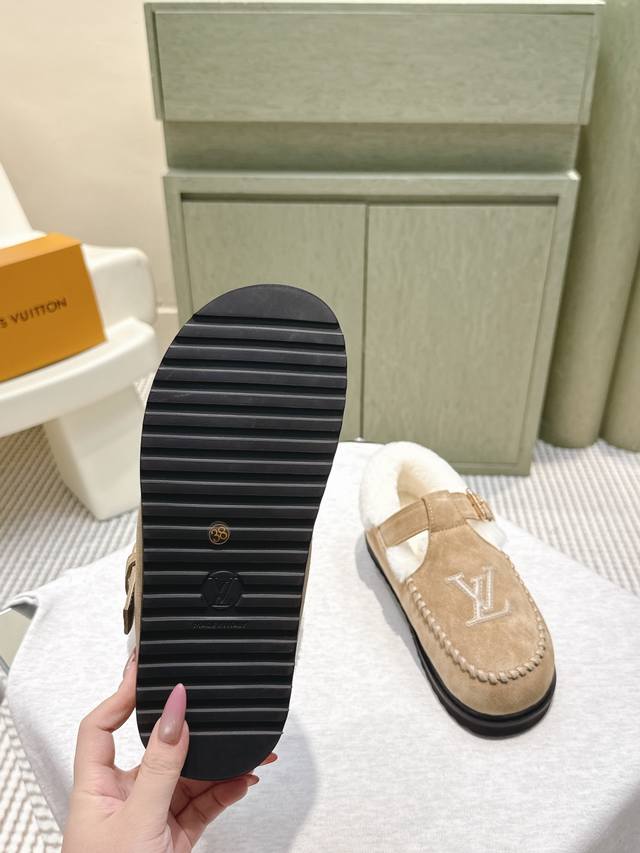 High-quality DDD 225 Lv Fw New Arrival ~ Cute furry shoes for autumn and winter, Birkenstock style, Mary Jane T-shirt design pending; incorporating all the elements you want to be fashionable! DDD The upper is hand-stitched with leather strips, showcasing the charm of handcrafted work. DDD The inner lining is made of one-piece fur, so comfortable to wear, and looks amazing with socks! DDD The sole is made of foam material, making it lightweight and comfortable! DDD A perfect autumn/winter piece! DDD Developed from authentic products, 99.99% accurate. Includes authentic purchase video. DDD Size 35-41. DDD Full set of boutique-compatible gift box packaging! DDD