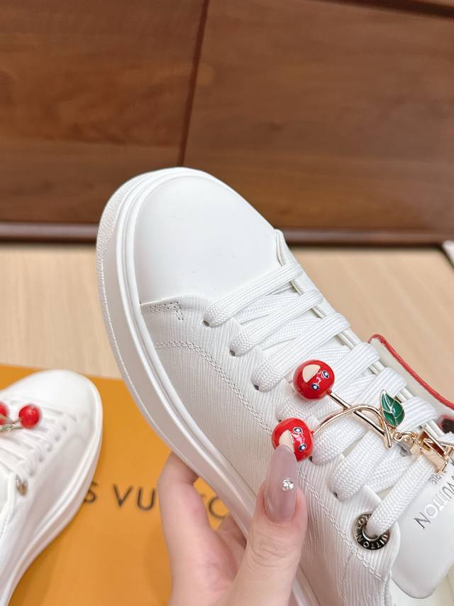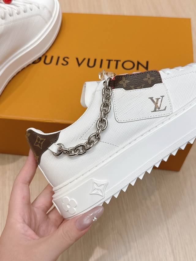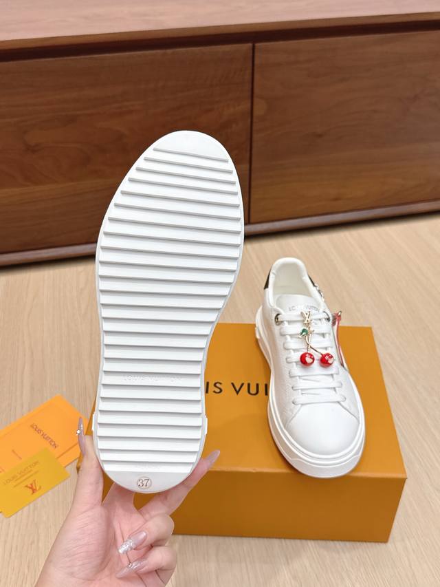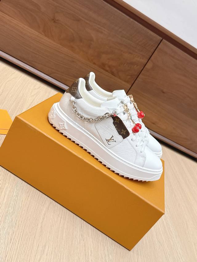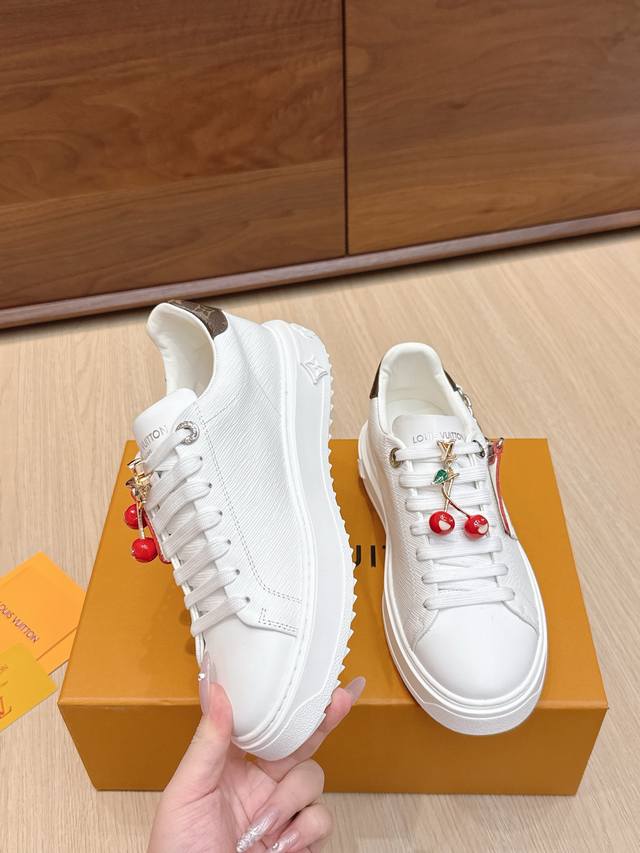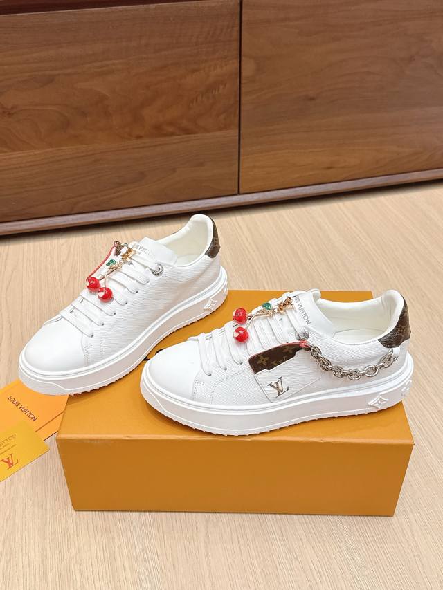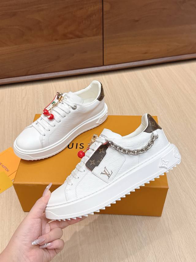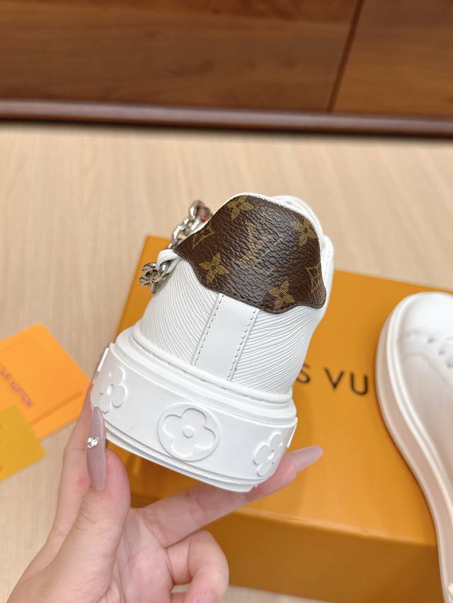 High-quality accessories (60 RMB) Louis Vuitton x Takashi Murakami collaboration Time Out sneakers with embossed pendant. These Time Out sneakers are made from original stock. The design conveys the dynamic style of the Louis Vuitton x Takashi Murakami reissue series, featuring a full-width Monogram embossed pattern on the upper, and colorful "Lv" lettering on the tongue and heel to express the artist's "ultra-flat" aesthetic. The laces feature detachable leather patches. Comes with exquisite boutique packaging. Material: Original imported top-grain cowhide. Lining: Original custom soft sheepskin. Sole: Original molded TPU anti-slip outsole. Sole thickness: 4cm. Size: Women's 35-40, Custom 41.
