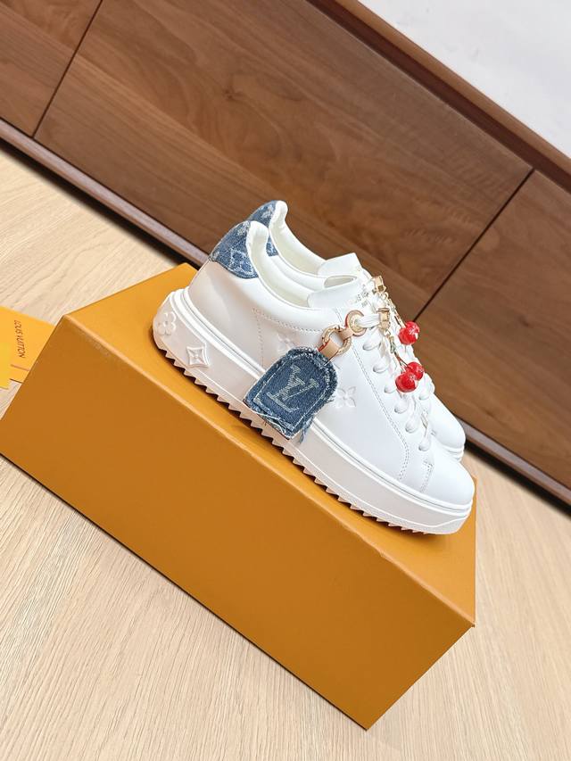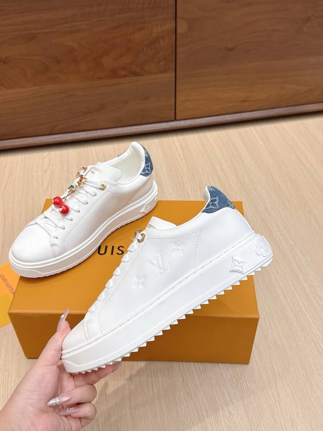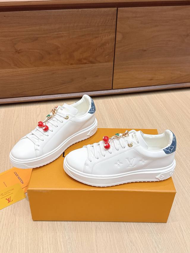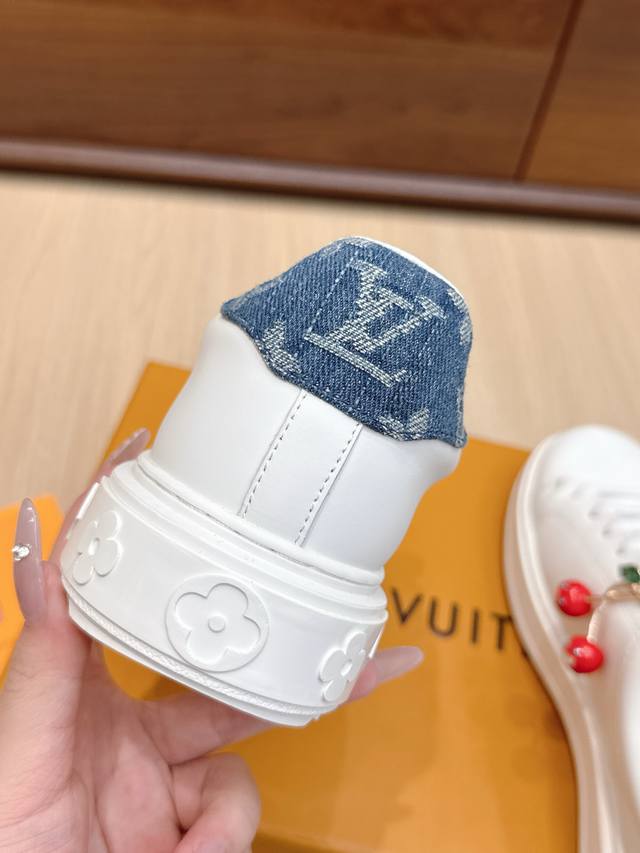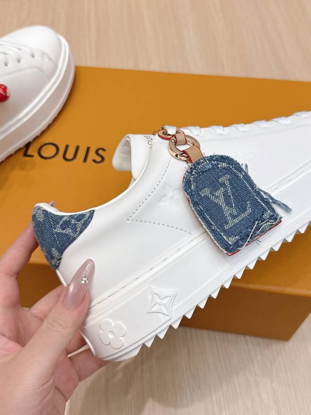 High-quality accessories (60 RMB) Louis Vuitton x Takashi Murakami collaboration Time Out sneakers, embossed pendant, casual white sneakers. Original purchase and production. This Time Out sneaker conveys the dynamic style of the Louis Vuitton x Takashi Murakami reissue series, featuring a full-width Monogram embossed pattern on the upper, and colorful Lv letters on the tongue and heel expressing the artist's "ultra-flat" aesthetic. The laces feature detachable leather patches. Comes with exquisite boutique packaging. Material: Original imported top-grain cowhide. Lining: Original custom soft sheepskin. Sole: Original molded TPU anti-slip outsole. Sole thickness: 4cm. Size: Women's 35-40, custom 41.