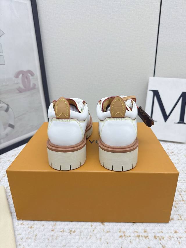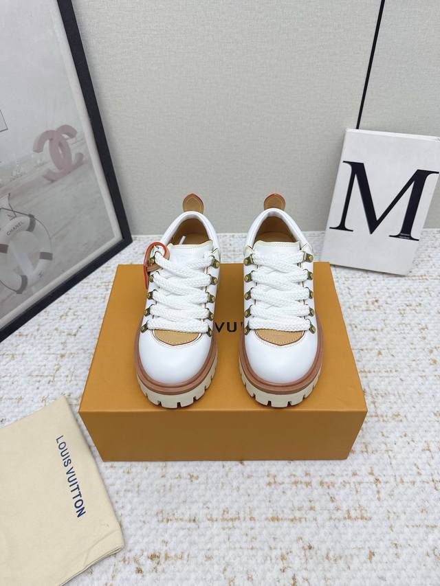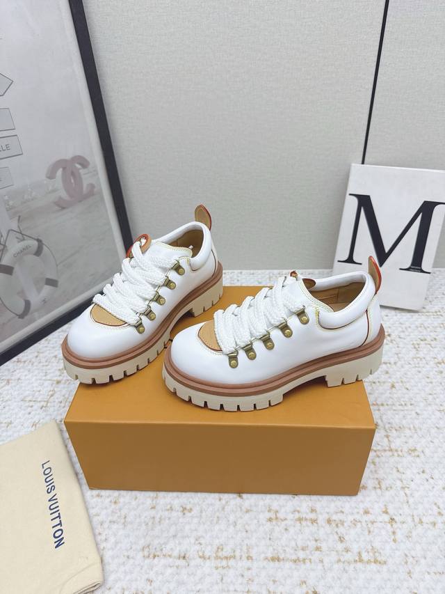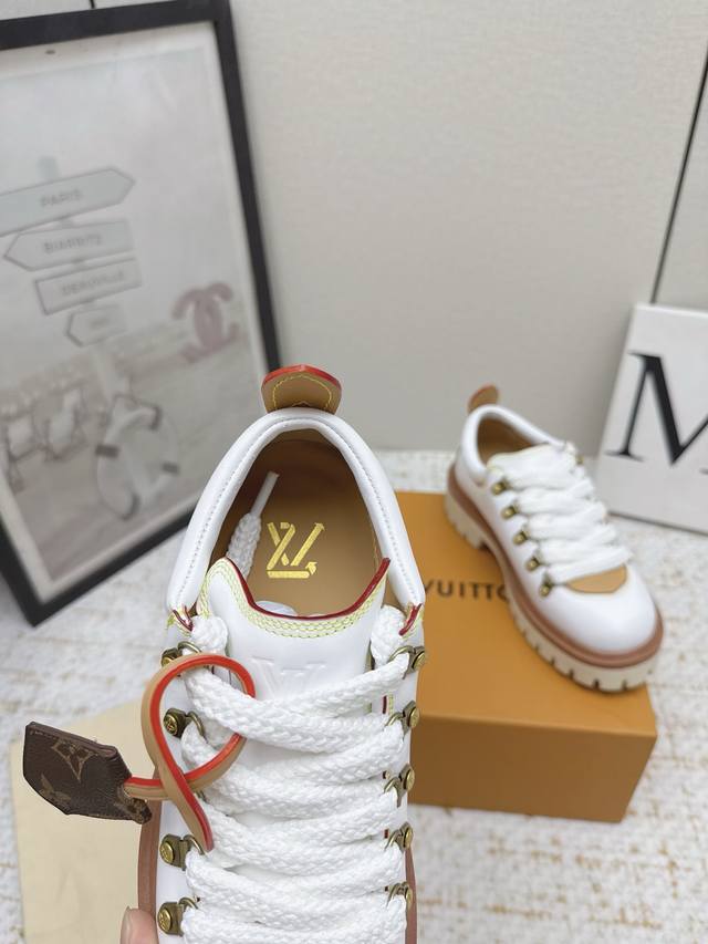 Lv Remix Derby shoes. Inspired by classic hiking boots, these new Louis Vuitton Derby shoes reimagine proportions for a stylish and edgy silhouette. The upper combines thick laces and a Swoosh engraved with a monogram pattern, with details sourced from Louis Vuitton leather goods, notably the monogram canvas keybell and the natural leather heel tag with yellow stitching. The shoes feature a thick rubber outsole. Size: 35-46 (Men's 45/46, custom