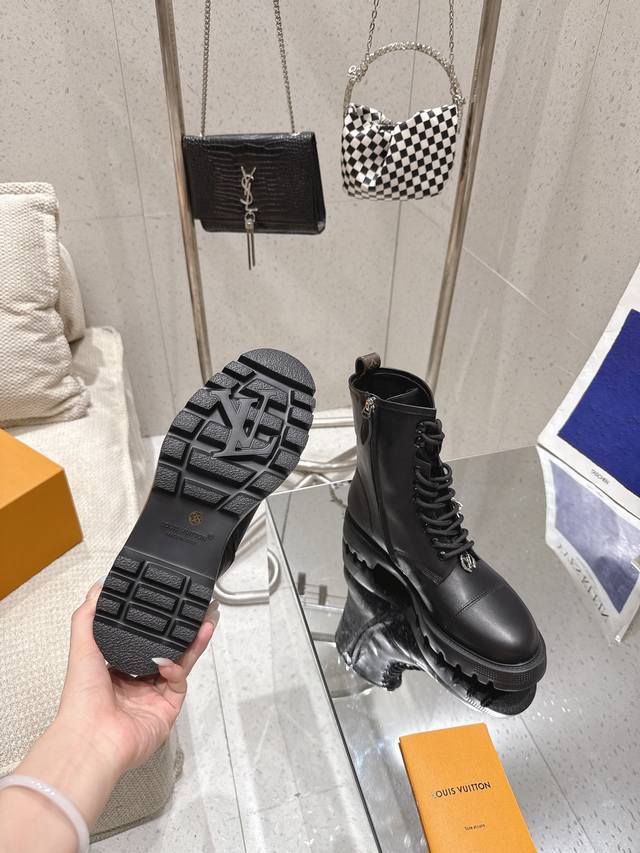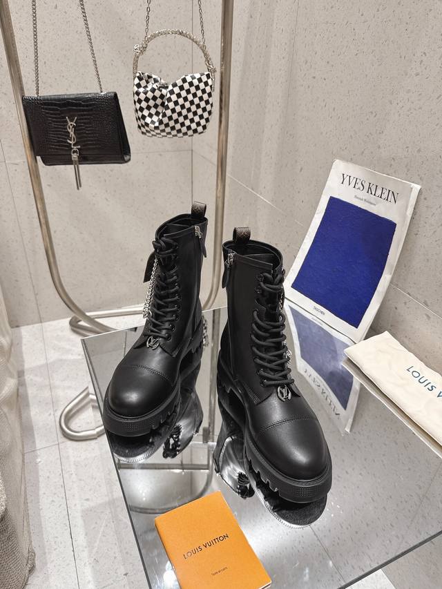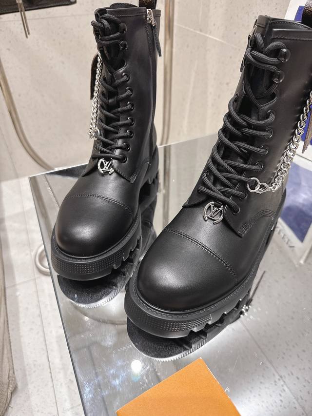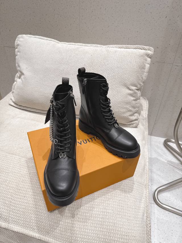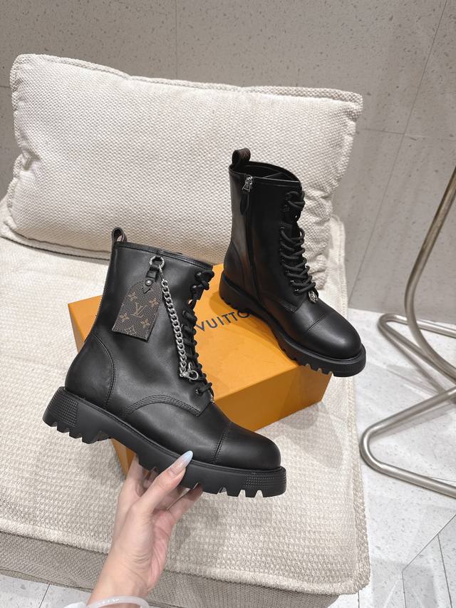 High-quality import! Full packaging included. This District Ranger ankle boot embodies military inspiration and Louis Vuitton's travel heritage, featuring a supple calfskin upper adorned with metal chains and a Monogram canvas luggage tag-shaped charm. The Eva outsole boasts a finely textured pattern, offering a substantial yet lightweight feel. Materials: Calfskin; Lining: Imported sheepskin; Insole: Sheepskin; Outsole: Eva outsole; Heel height: 4cm; Sizes: 35-41 (40, 41). Custom orders are non-refundable.