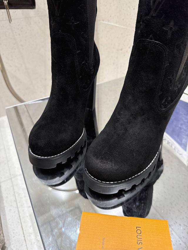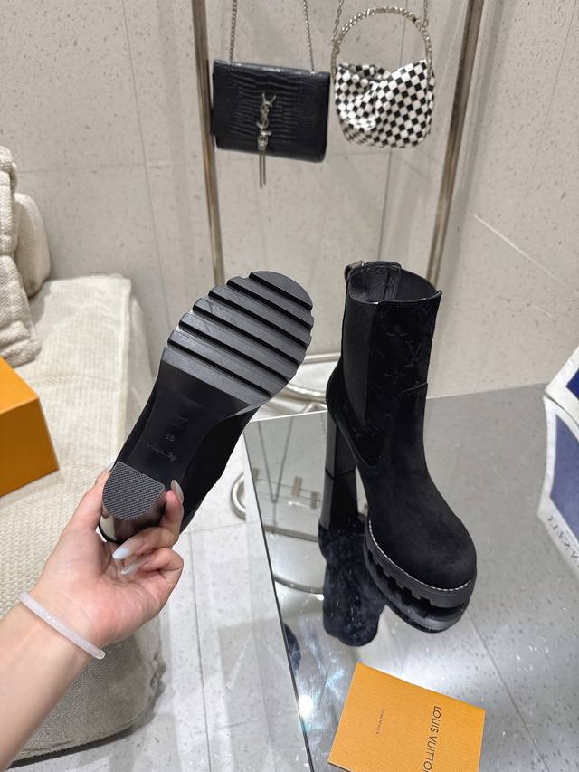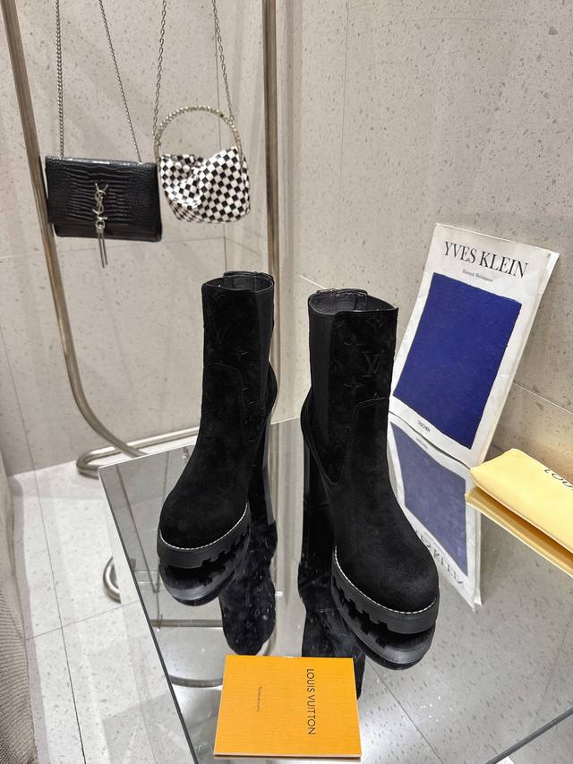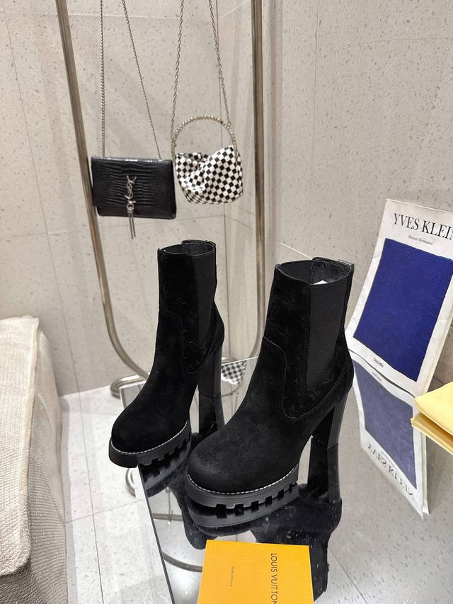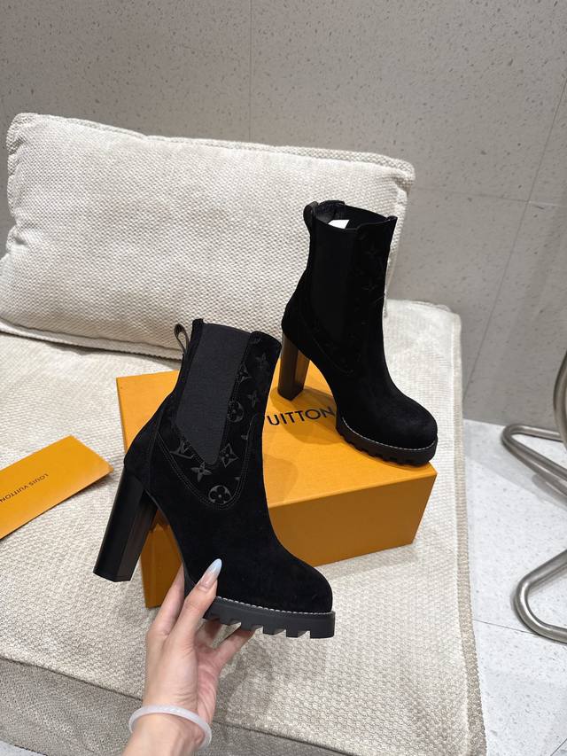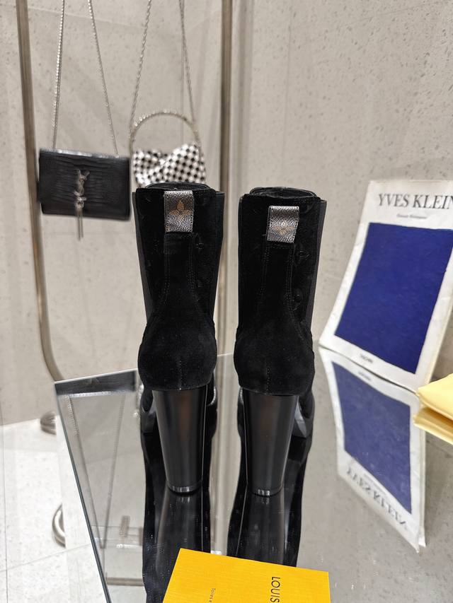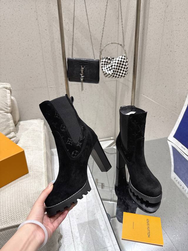High-quality import! Full packaging. This Louis Vuitto Silhouette ankle boot features soft suede leather with partial Monogram embossing, and a high-elasticity elastic band on the upper, showcasing the classic Louis Vuitton design. Materials: Imported sheepskin; Lining: Imported sheepskin; Insole: Sheepskin; Outsole: Italian genuine leather; Heel height: 10cm; Sizes: 35-41 (40, 41). Custom orders are non-refundable.