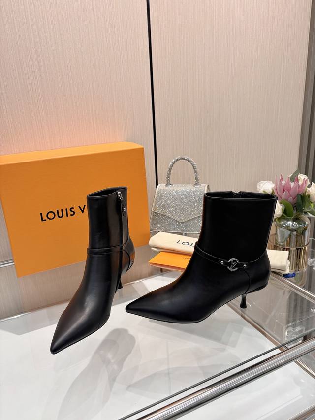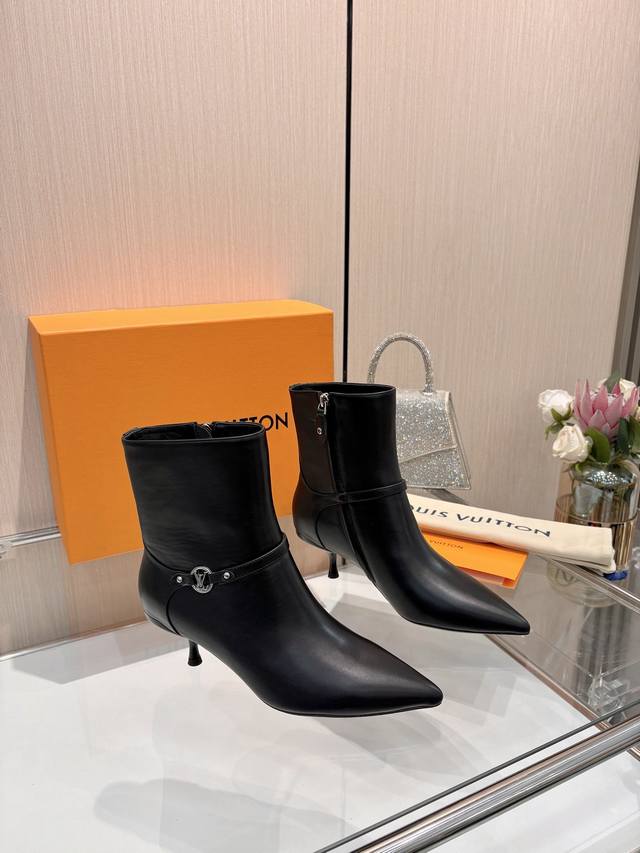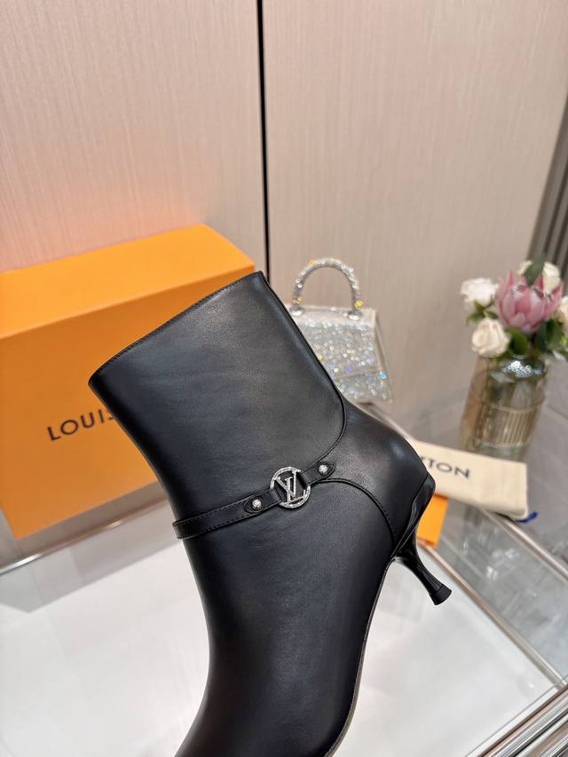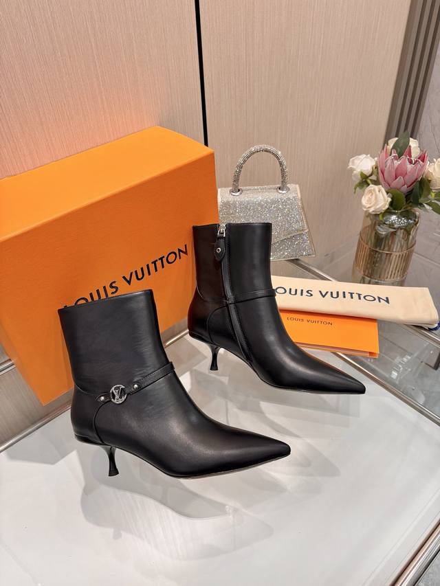 High-quality Louis Vuitton 2025 Autumn/Winter ankle boots! Perfect last, factory direct wholesale: New pointed toe style, updated simultaneously with the official website. The Lv hardware "Logo" adds a touch of sophistication, creating a visually stunning effect that perfectly embodies Lv's elegant style. Comfortable to wear and incredibly feminine. New original molded last, perfectly 1:1 shape, exquisite workmanship, imported high-end fabrics for a refined texture! Fabric: Calfskin monogram denim; Lining: High-quality soft sheepskin; Insole: Imported goatskin; Outsole: Italian genuine leather; 5.5 painted heel. Sizes: 34-41 (34.40, 41). Custom orders are non-refundable and non-exchangeable.