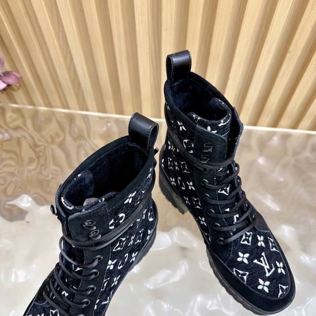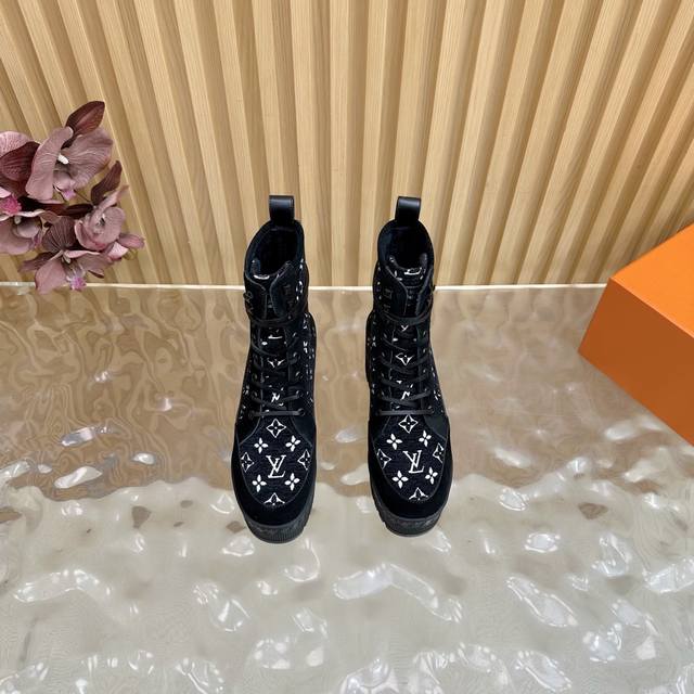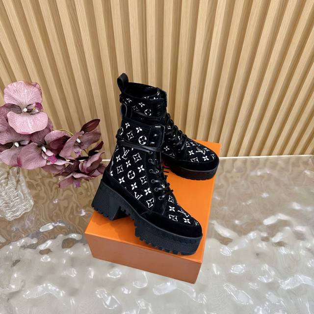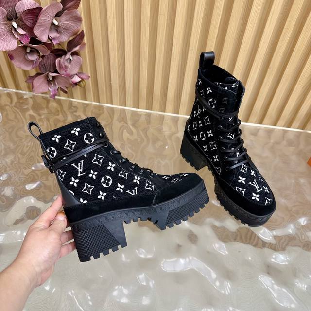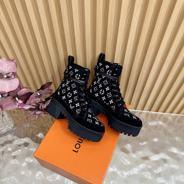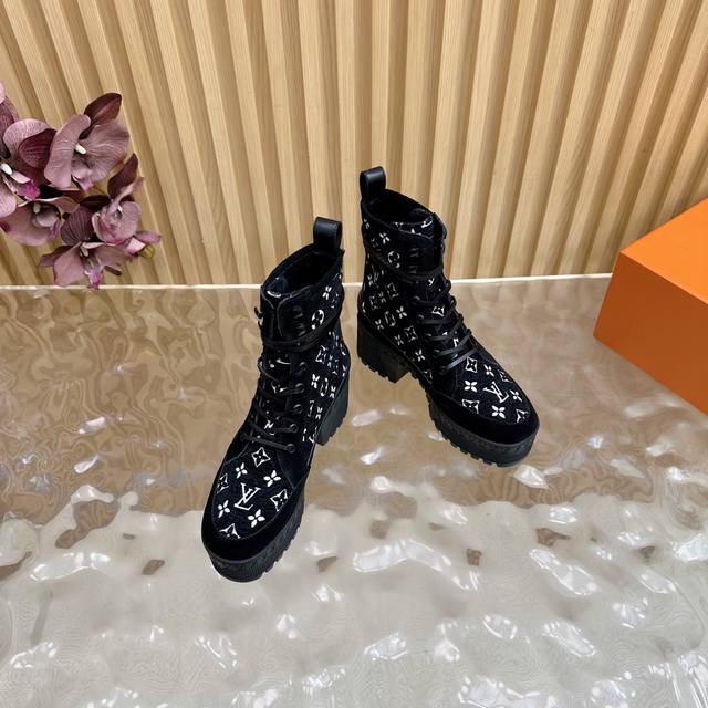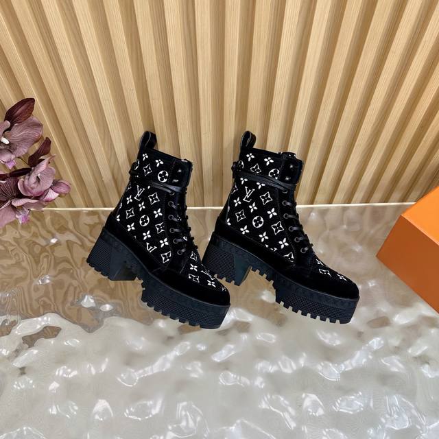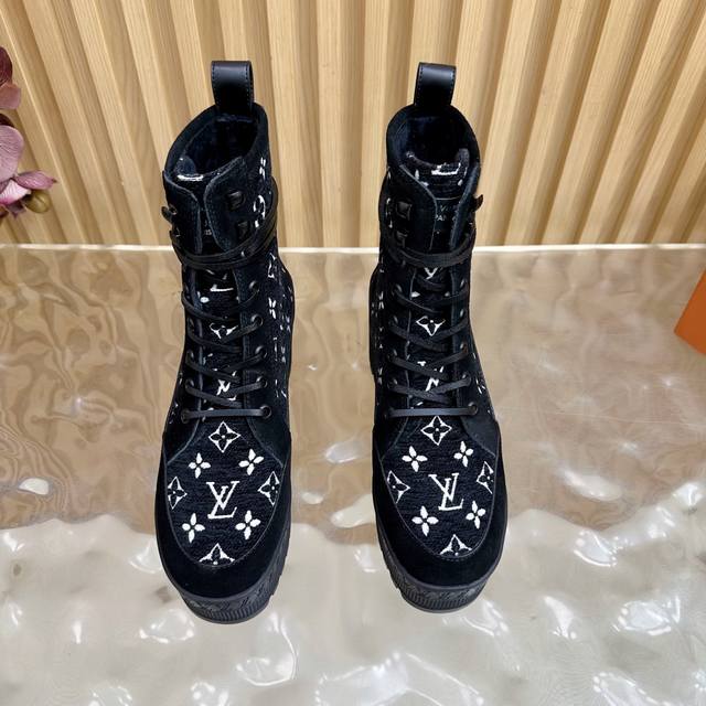 High-quality replica Louis Vuitton classic high-heeled Martin boots, sand boot series. Made with fleece lining. 1:1 replica of the original, with comparable details including last, material, outsole, upper (cowhide monogram leather, stitched cowhide), lining, and genuine leather laces. 7cm heel height, 3.5cm platform. Stylish, slimming, height-increasing, comfortable to walk in. Sizes: 35-40, 40, 41 (custom sizes available).