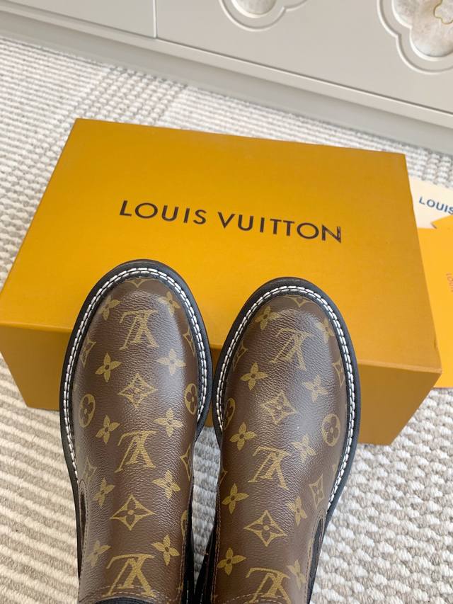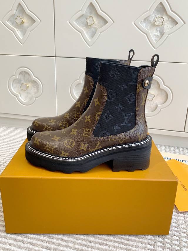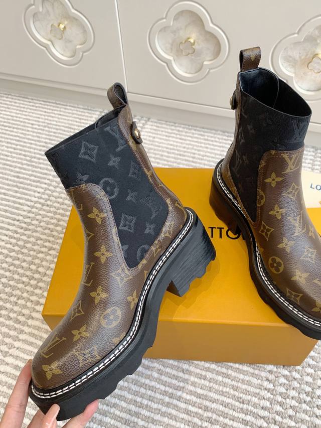L Louis Vuitton Beaubourg Ankle Boots, Platform Chelsea Boots DDD Top Quality DDD The Louis Vuitton Beaubourg ankle boots combine a sleek cowhide upper with a touch of elegance, featuring a Monogram patterned elastic side panel for a Chelsea boot look. They are paired with a thick yet lightweight micro-outsole. Studded details, a Louis Vuitton embossed leather tag, and solid-color stitching around the welt highlight meticulous craftsmanship. DDD Cowhide upper, sheepskin lining, original outsole DDD Size: 35-39 40 41 Custom orders are non-refundable DDD
