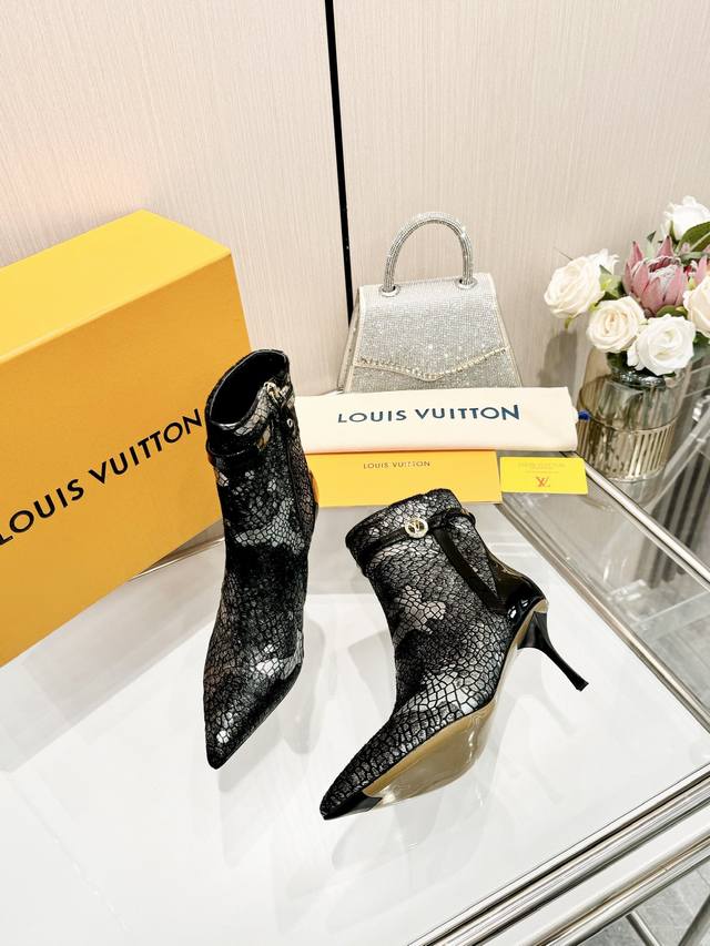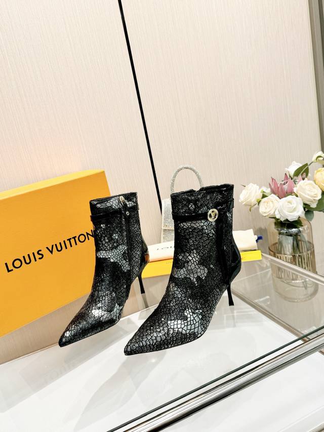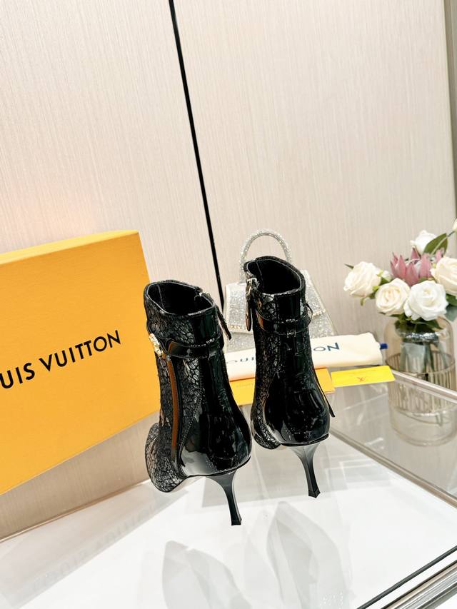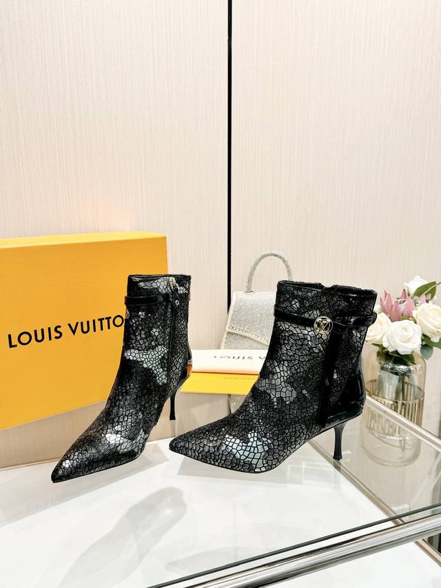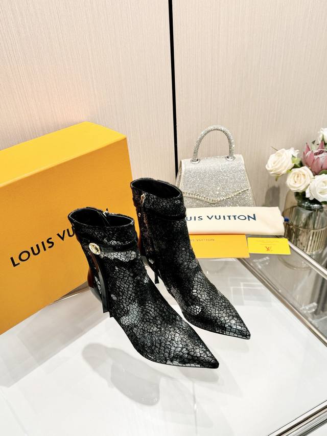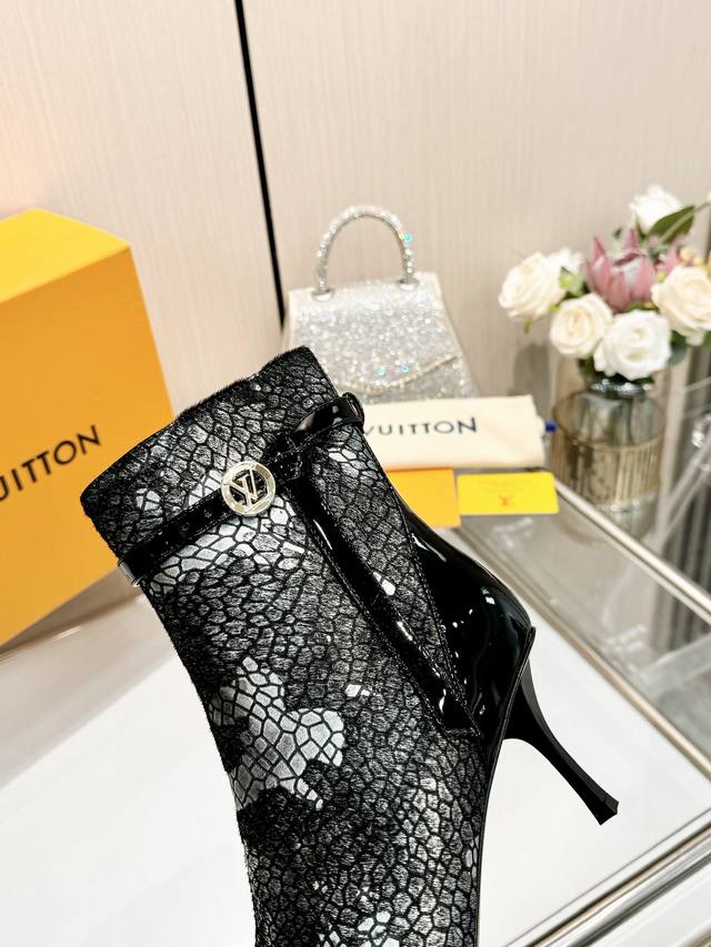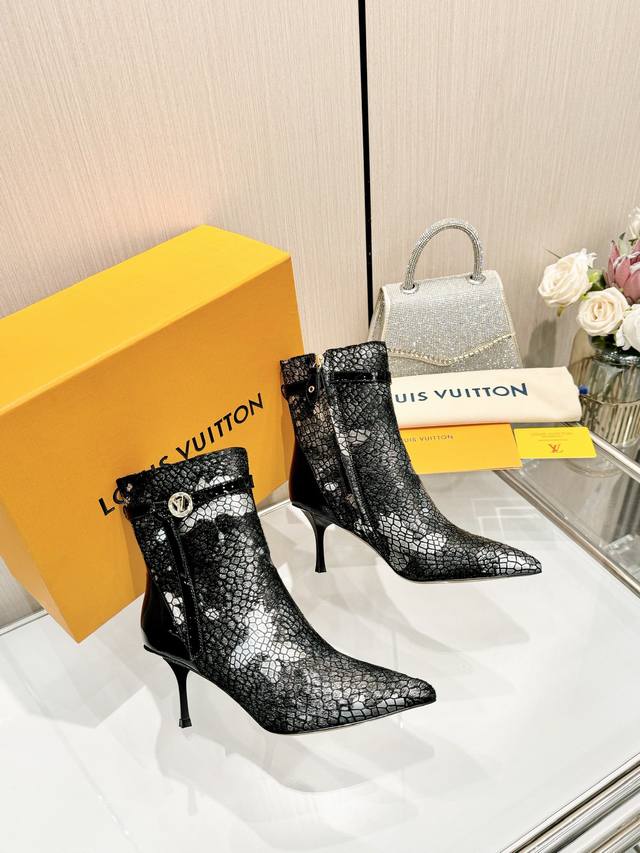 Latest Louis Vuitton Fall/Winter runway ankle boots, updated simultaneously with the official website series, factory direct wholesale: Perfect last + Louis Vuitton's new element button design, full of femininity, noble temperament, original mold last, perfect 1:1 shape, high-end quality, imported high-end fabric presents exquisite texture! Material: calfskin, imported patent leather, monogrammed leather, denim, horsehair. Lining: High-quality soft sheepskin lining. Insole: Imported goatskin. Custom-made A-grade high-density private mold sole, luxurious packaging! 7cm painted heel. Sizes: 35-40, 34, 40, 41. Custom orders are non-refundable and non-exchangeable.