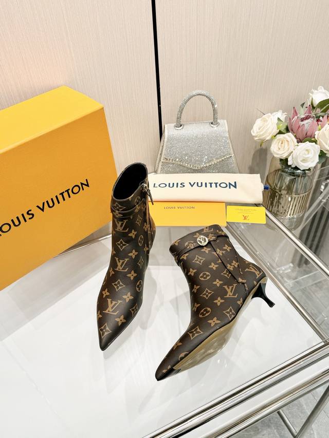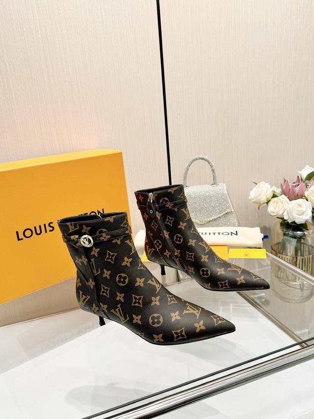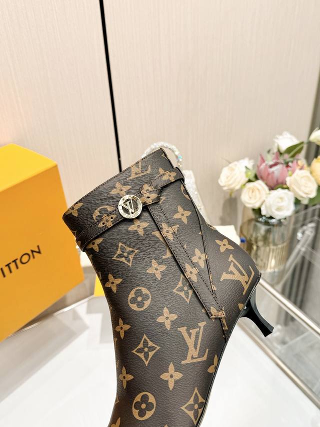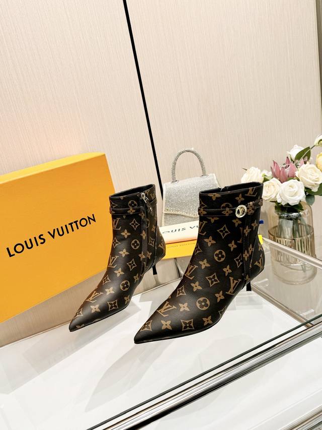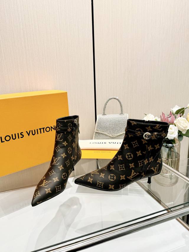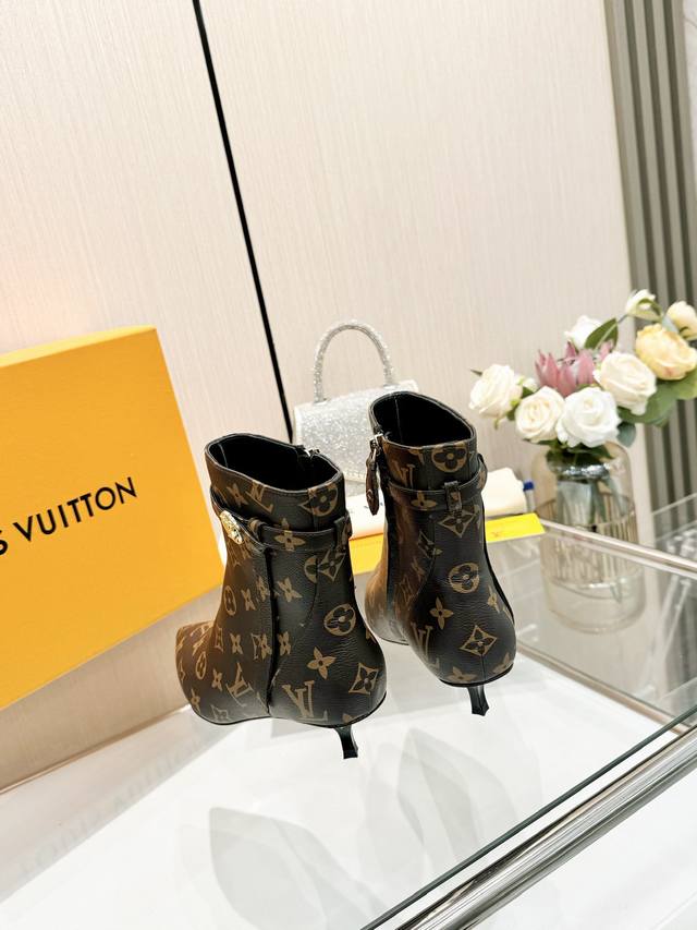 Latest Louis Vuitton Fall/Winter runway ankle boots, updated simultaneously with the official website series, factory direct wholesale: Perfect last + Louis Vuitton's new element button design, full of femininity, noble temperament, original mold last, perfect 1:1 shape, high-end quality, imported high-end fabric presents exquisite texture! Material: calfskin, imported patent leather, monogrammed leather, denim, horsehair. Lining: High-quality soft sheepskin lining. Insole: Imported goatskin. Custom-made A-grade high-density private mold sole, luxurious packaging! 4cm painted heel. Sizes: 35-40, 34, 40, 41 (custom orders, no returns or exchanges).