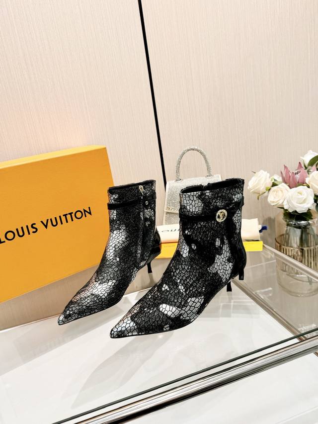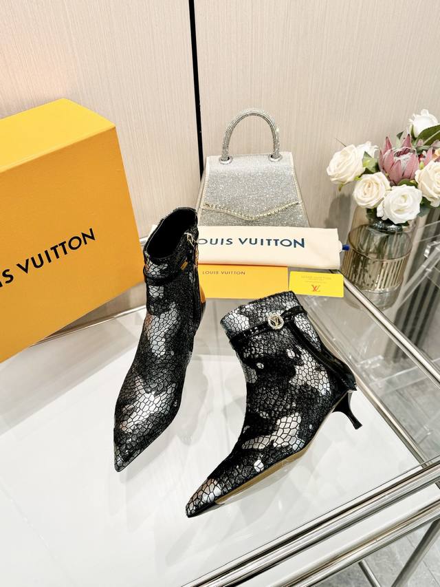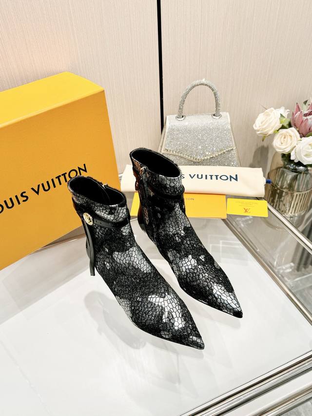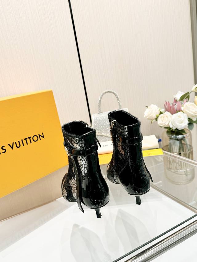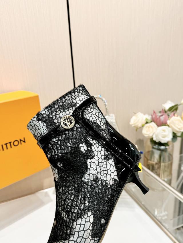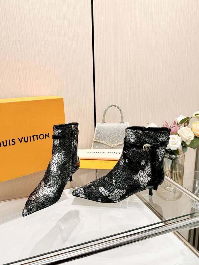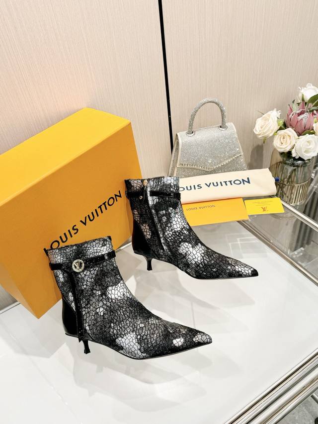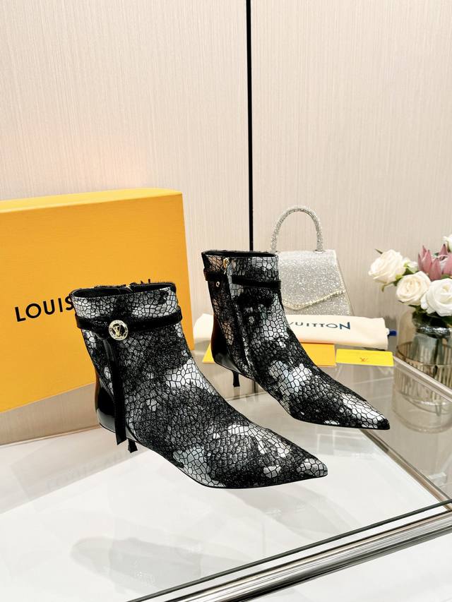 Latest Louis Vuitton Fall/Winter runway ankle boots, updated simultaneously with the official website series, factory direct wholesale: Perfect last + Louis Vuitton's new element button design, full of femininity, noble temperament, original mold last, perfect 1:1 shape, high-end quality, imported high-end fabric presents exquisite texture! Material: calfskin, imported patent leather, monogrammed leather, denim, horsehair. Lining: High-quality soft sheepskin lining. Insole: Imported goatskin. Custom-made A-grade high-density private mold sole, luxurious packaging! 4cm painted heel. Sizes: 35-40, 34, 40, 41 (custom orders, no returns or exchanges).