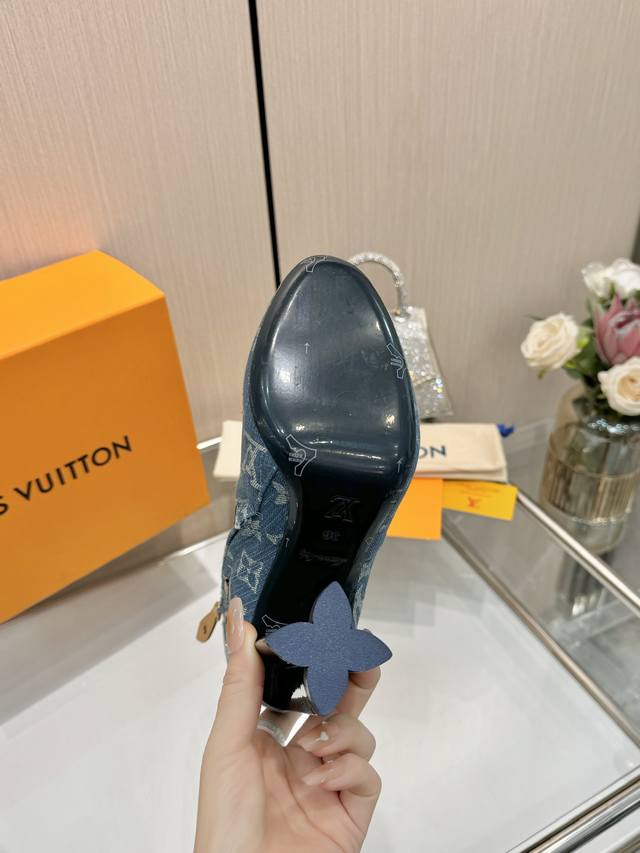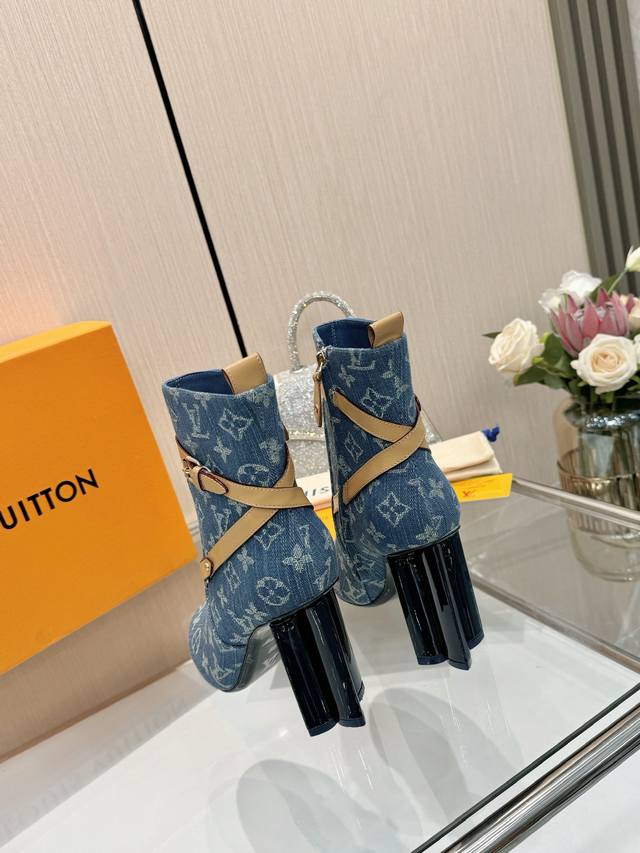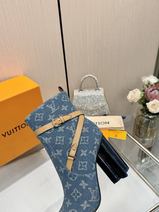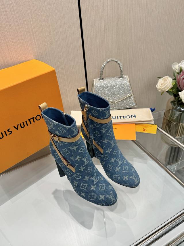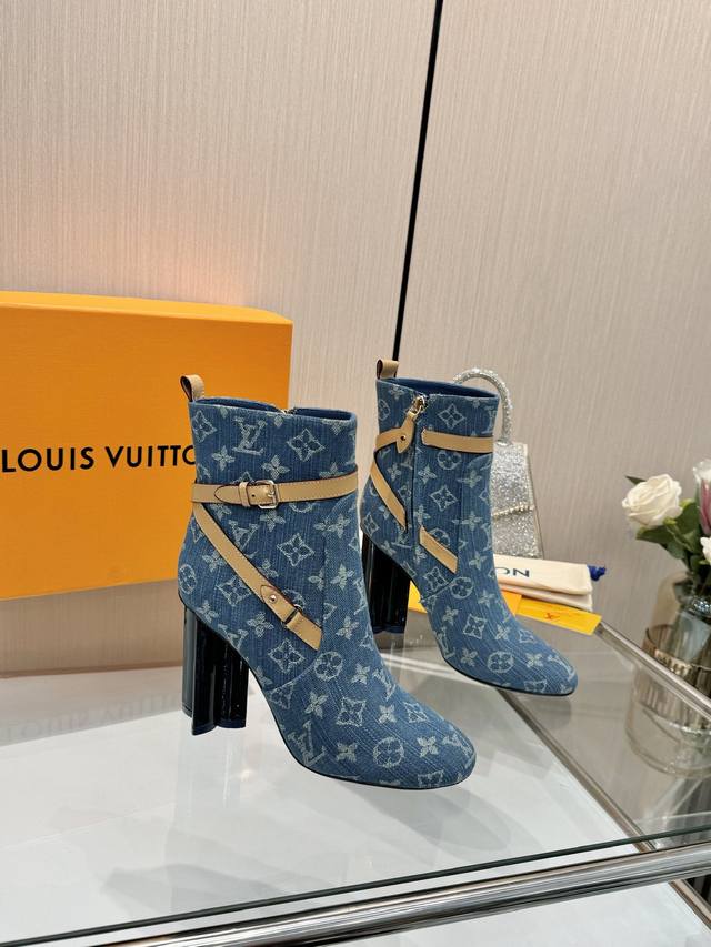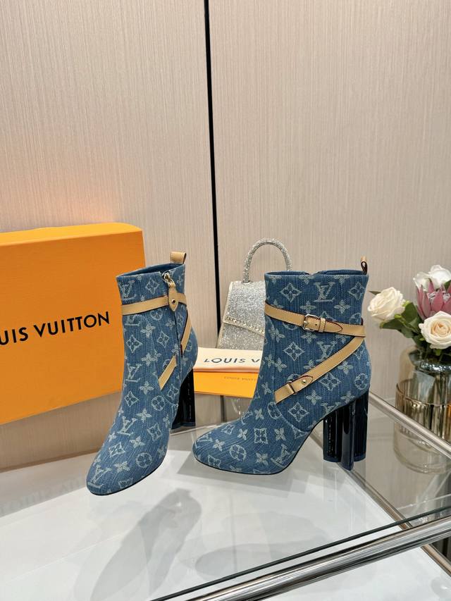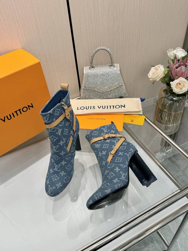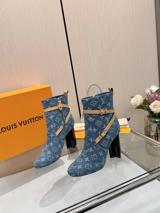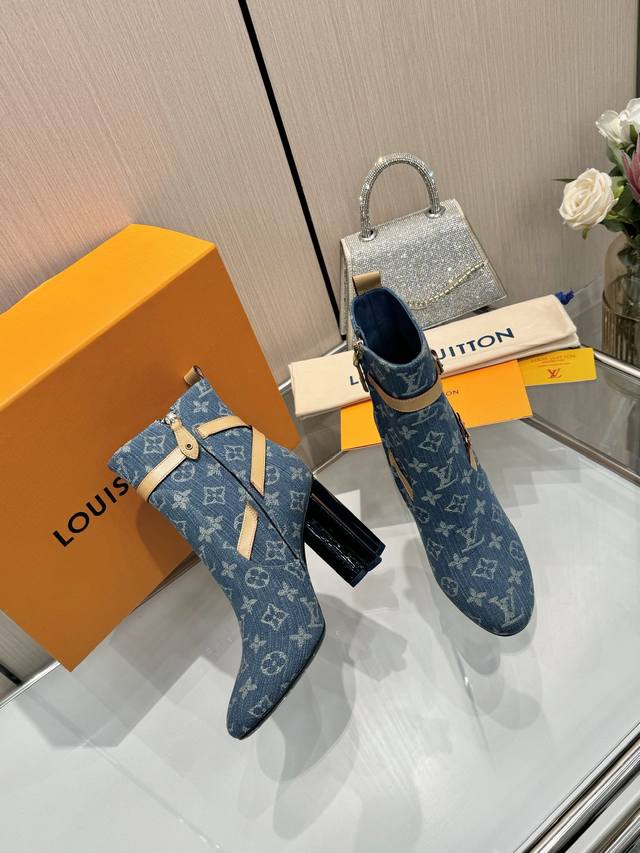 Latest LV Fall/Winter Official Collection Runway Style 6-inch Ankle Boots, Updated Simultaneously, Factory Direct, Perfect Last, LV New Elements Straps, Buckles, Edge Finishing, Complex Craftsmanship, Plum Blossom Heel Design, Exuding Noble Temperament, Original Molded Last, Ultimate 1:1 Shape, High-End Quality, Imported High-End Fabrics Present Exquisite Texture! Material: Imported Calfskin Monogram Leather Denim; Lining: High-Quality Soft Sheepskin; Insole: Imported Sheepskin; Custom-Made A-Grade High-Density Private Mold Outsole, Luxurious Packaging! 9.5 Plum Blossom Heel, Leather-Packed Heel; Sizes: 35-40, 34, 40, 41 (Custom orders are non-refundable/non-exchangeable).