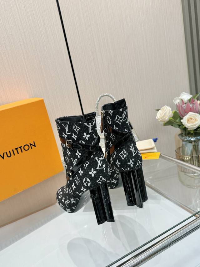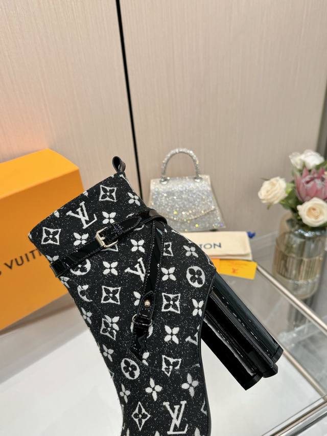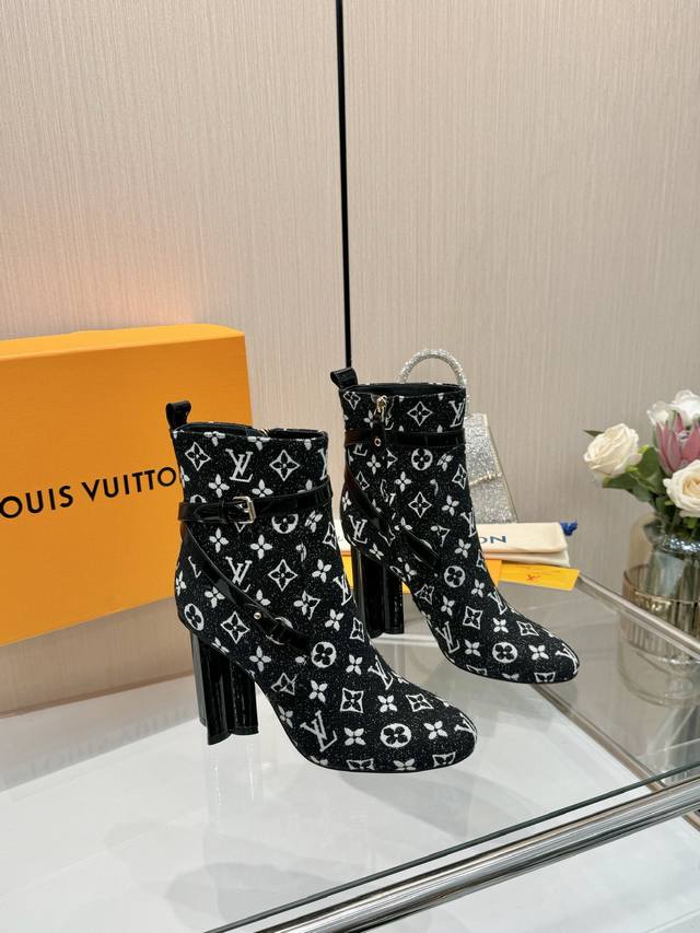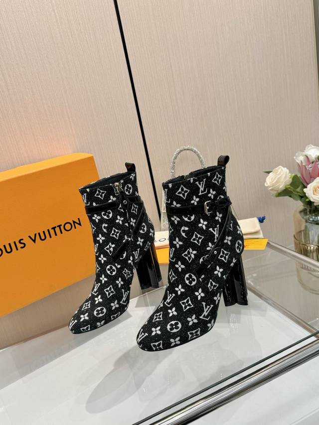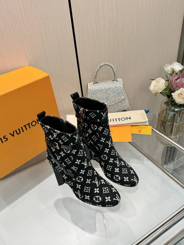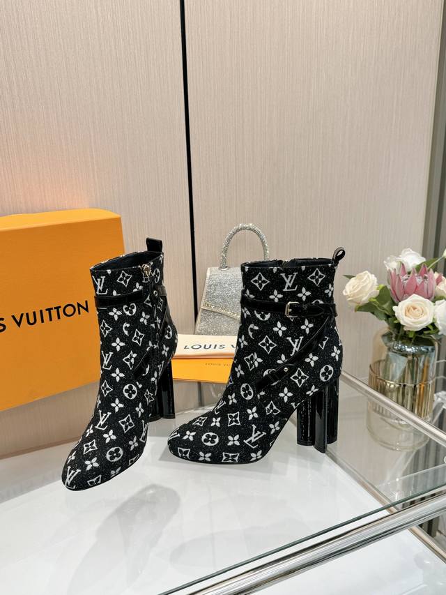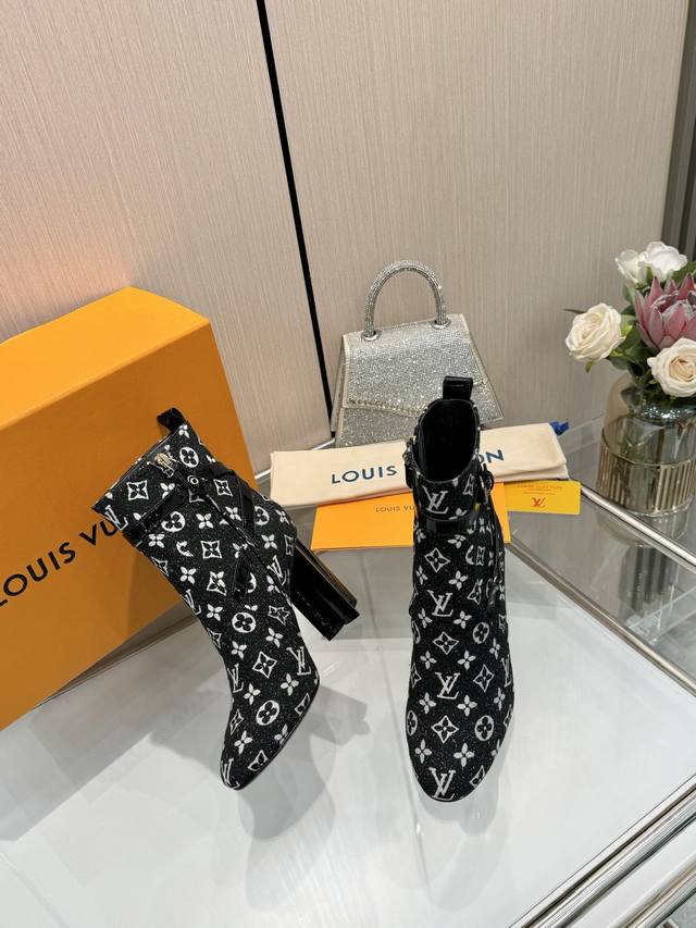 Latest LV Fall/Winter Official Collection Runway Style 6-inch Ankle Boots, Updated Simultaneously, Factory Wholesale: Perfect Last, LV New Elements Straps, Buckles, and Edge Finishing, Complex Craftsmanship, Plum Blossom Heel Design, Exuding Noble Temperament, Original Molded Last, Ultimate 1:1 Shape, High-End Quality, Imported High-End Fabrics Present Exquisite Texture! Material: Imported Calfskin Monogram Leather Denim; Lining: High-Quality Soft Sheepskin; Insole: Imported Sheepskin; Custom-Made A-Grade High-Density Private Mold Outsole, Luxurious Packaging! 9.5 Plum Blossom Heel, Leather-Packed Heel; Sizes: 35-40, 34, 40, 41 (Custom orders are non-refundable/non-exchangeable).