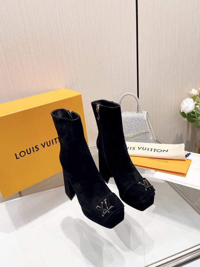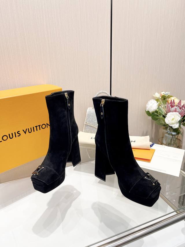 Latest LV official website series runway style 6-inch ankle boots, updated simultaneously, factory wholesale: Perfect last + heel buckle design, LV new element buckle, noble temperament, high platform design, comfortable to walk in, original molded last, ultimate 1:1 shape, high-end quality, imported high-end fabric presents exquisite texture! Material: Imported calfskin, imported sheepskin monogram leather. Lining: High-quality soft sheepskin lining. Insole: Imported sheepskin lining. Custom-made A-grade high-density private mold outsole, luxurious packaging! 12cm heel with upper leather covering, 3cm platform with upper leather covering. Sizes: 35-40, 34, 40, 41 ( custom orders are non-refundable ).