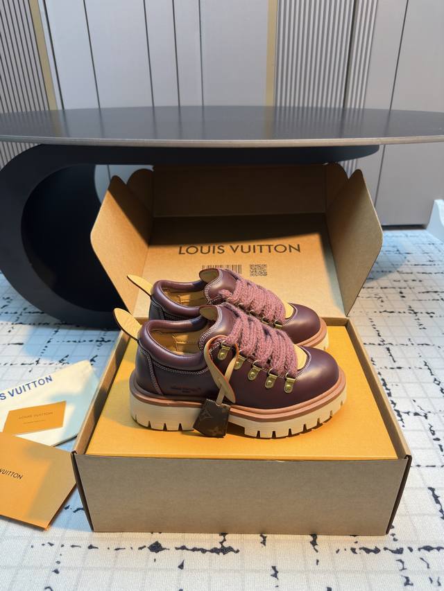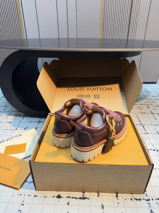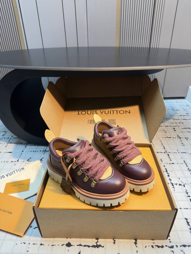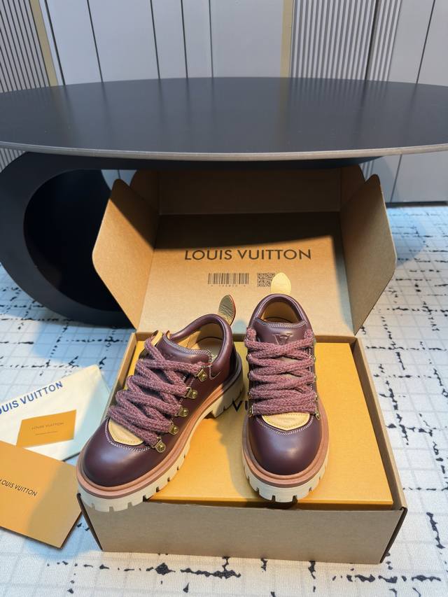 louis Vuiteeo* Louis Vuitton's latest lace-up platform loafers, the Derby, are a couple's choice for both men and women. This platform-style platform shoe has been a hit this year, offering a truly stunning look and a stylish edge. The calfskin Lv Remix Derby draws inspiration from classic hiking boots, reimagining their proportions for a sleek, fashion-forward silhouette. The upper features thick laces and a monogrammed hook. Details are taken from Louis Vuitton leather goods, particularly the monogrammed canvas key ring and the natural leather back label with yellow stitching. The shoe rests on a thick rubber outsole.