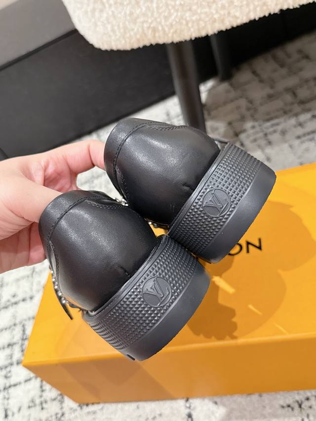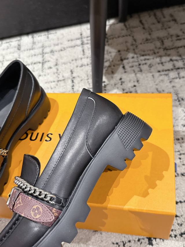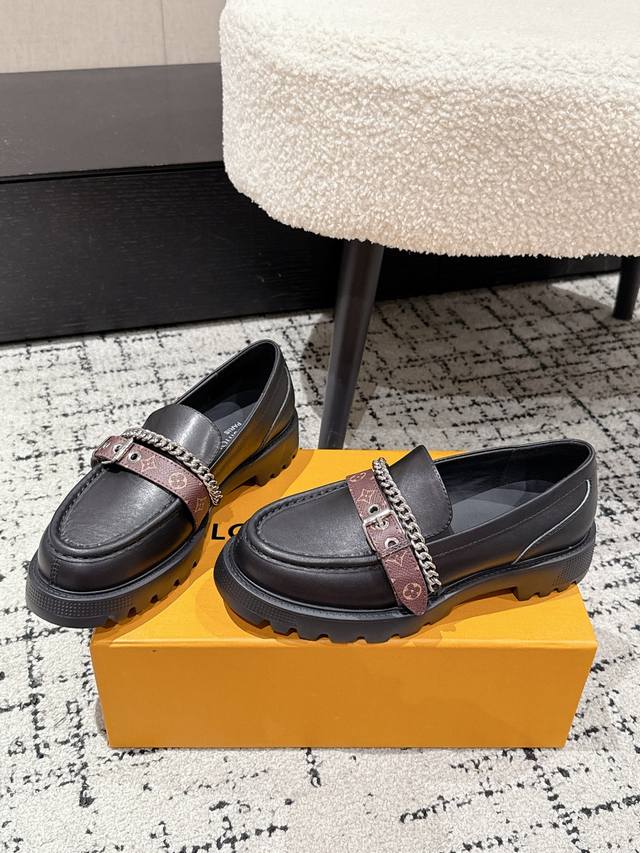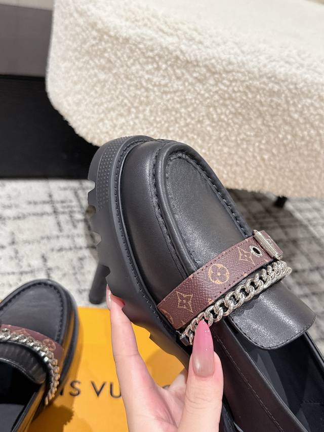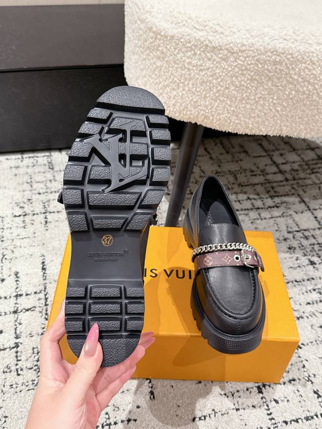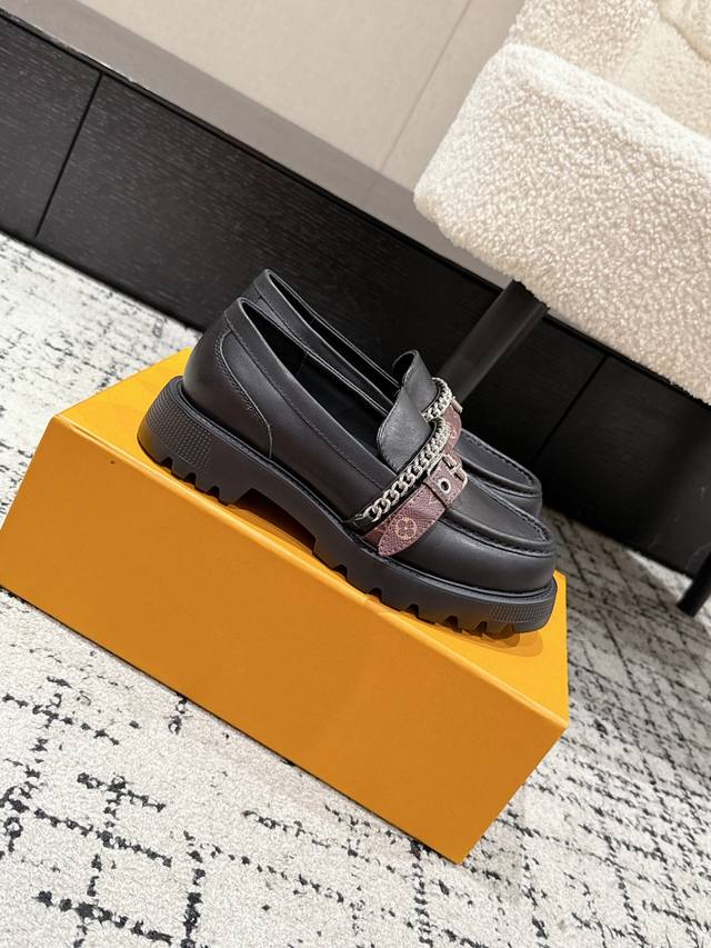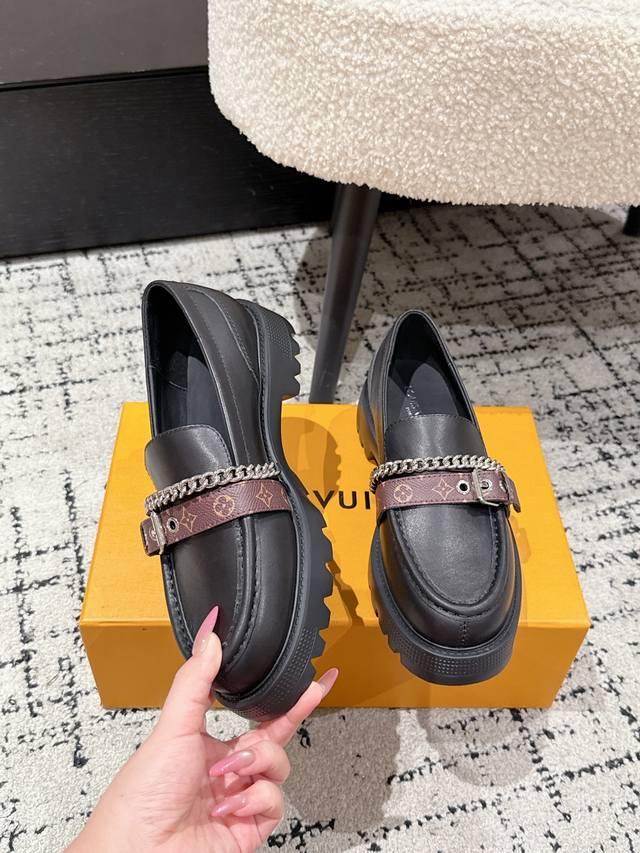 Louis Vuiteeon Lv 25 Autumn District Platform Loafers with Chain and Monogram Canvas Design. This platform loafer is incredibly popular this year, offering a height boost and setting a fashionable trend! This District loafer features a trendy look crafted from smooth cowhide leather, adorned with a rugged chain, Monogram canvas trim, and Louis Vuitton-inscribed buckle. The lightweight Eva outsole boasts a thick, textured pattern, with refined details on the forefoot and heel. Upper: Cowhide Lining: Cowhide Outsole: Original Eva outsole Size: #35-42 Sizes 40 and 41 are custom-made and non-refundable .