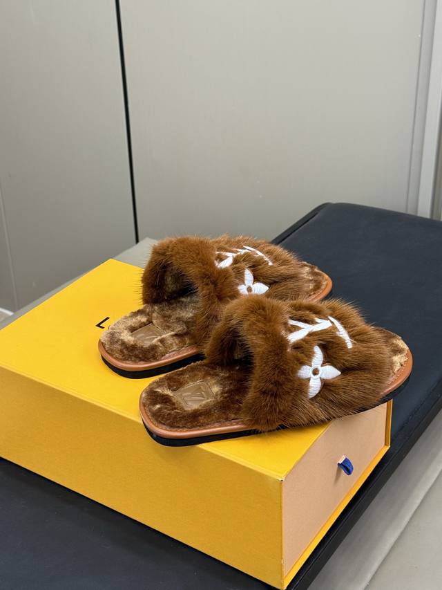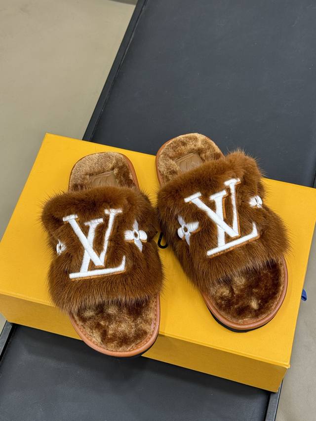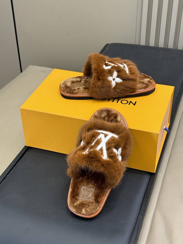 Louis Vuitt Classic Home Slippers. Made of mink fur, exuding luxury. Lightweight and comfortable, genuine mink, with an unparalleled feel. Top-quality, sizes 35-42, sizes 40, 41, 42 are available for custom orders.