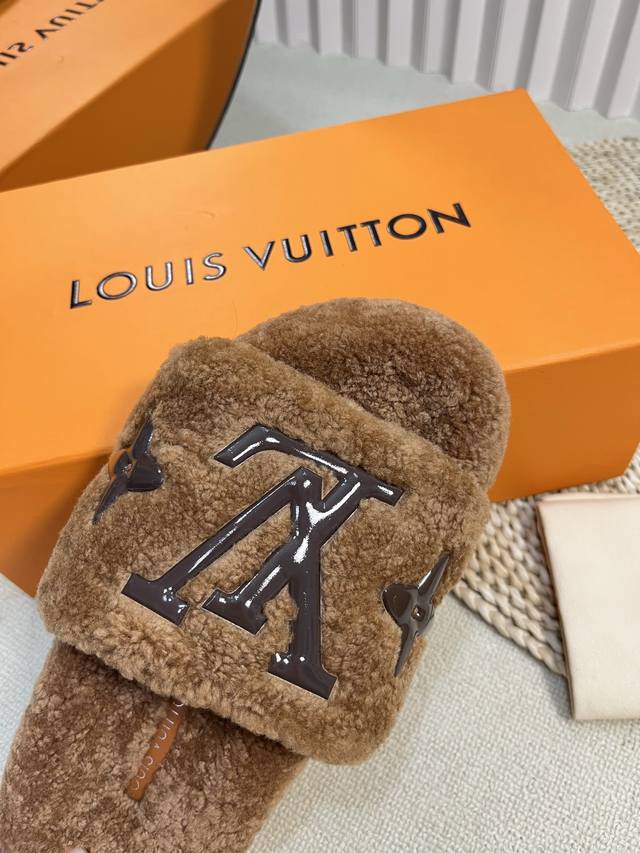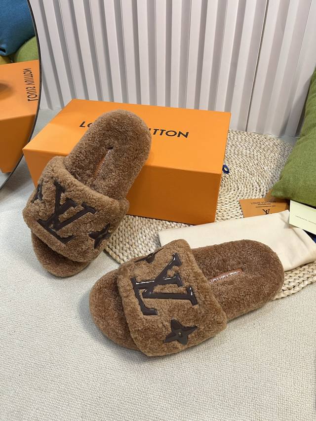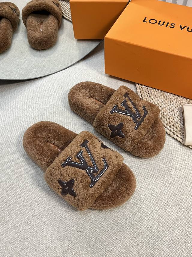 Louis Vuitto* new candy-colored wool slippers Lv high quality closed eyes buy! Thickened real fur is softer and more comfortable to step on, using imported fur and lambskin leather original label, original high-density foam bottom