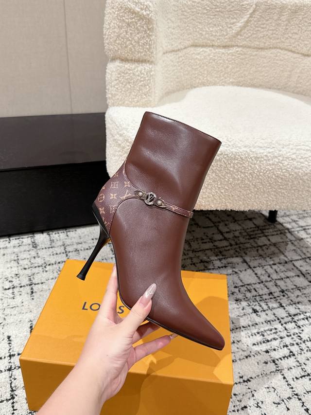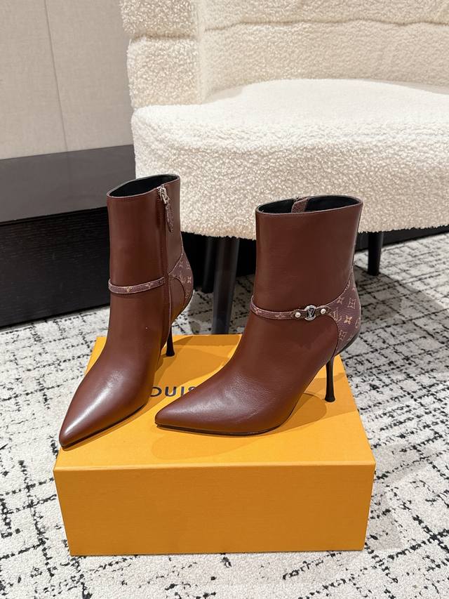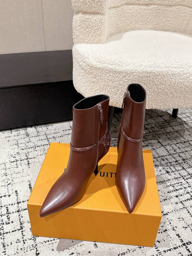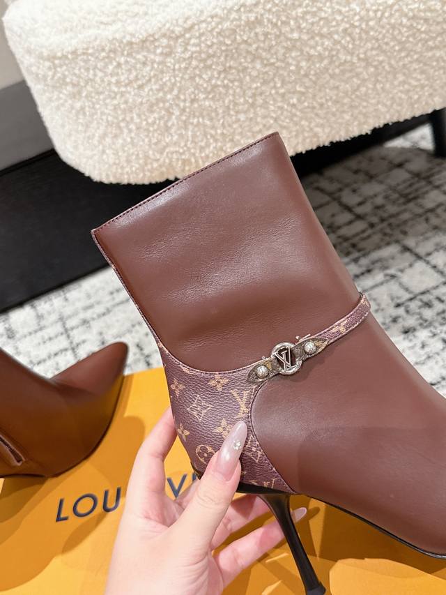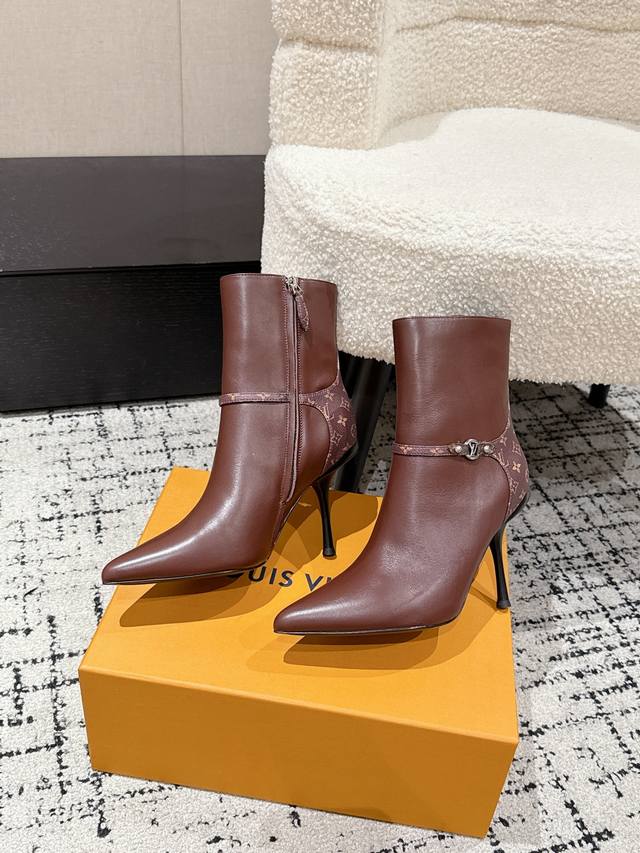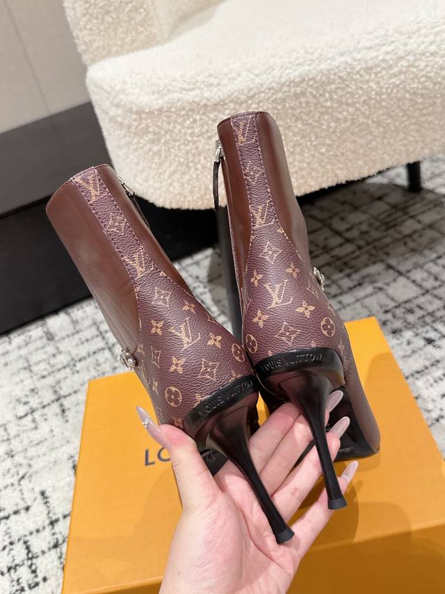Louis Vuitton 25 Early Autumn New Arrival Lv Legacy Ankle Boots Pointed Toe High Heeled Ankle Boots with Side Zipper and Monogram Canvas Belt