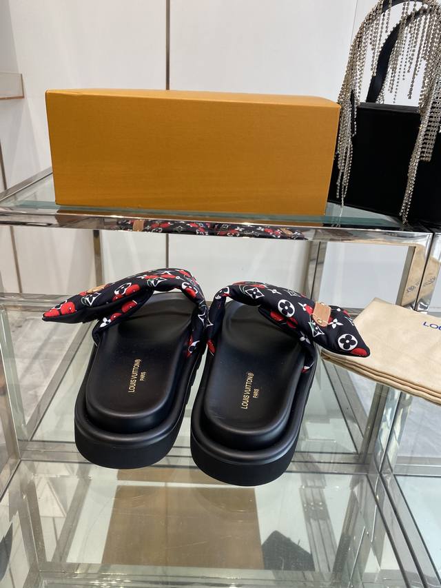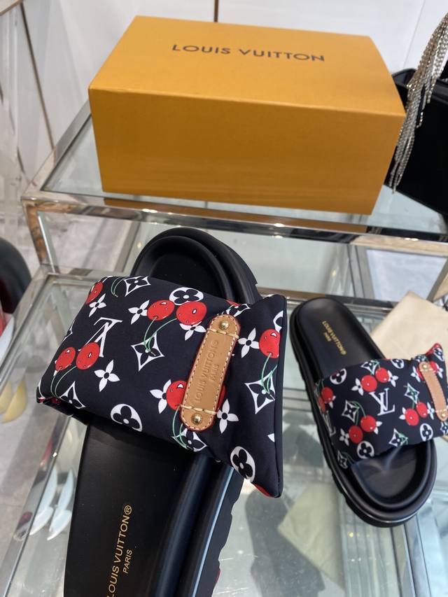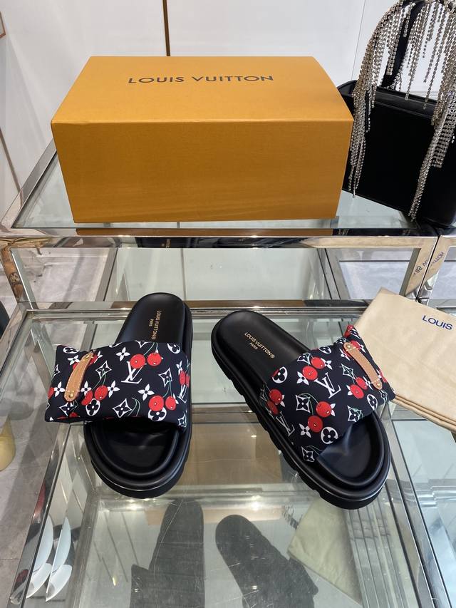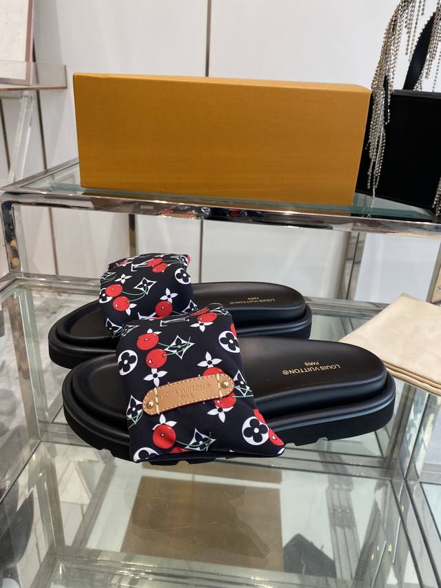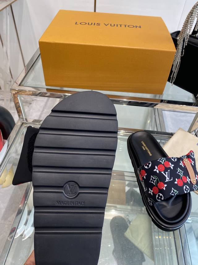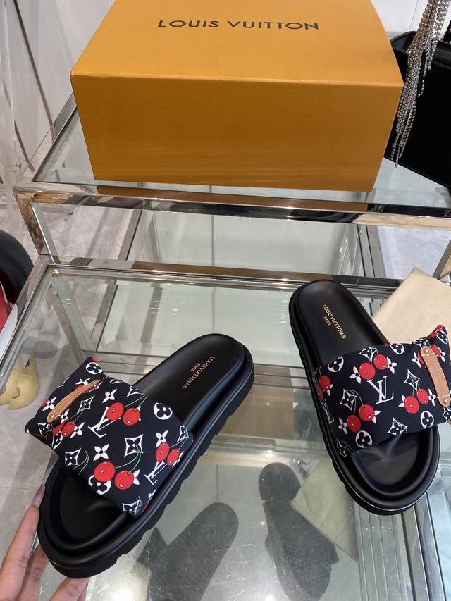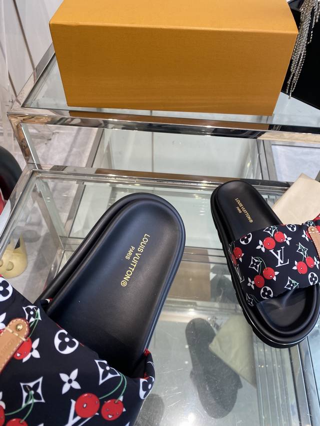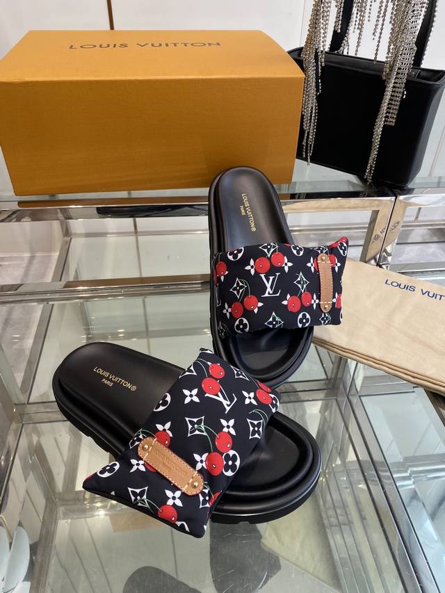 Louis Vuitton 25Ss Cherry Series Summer New Sandals with Adjustable Velcro Fit, Full of Beachy Style. Original mold, Lv metal