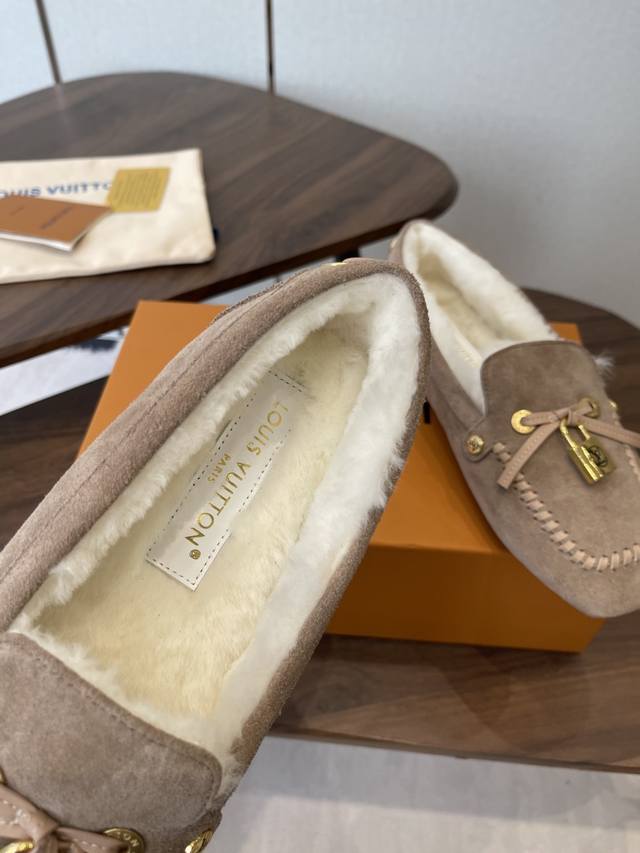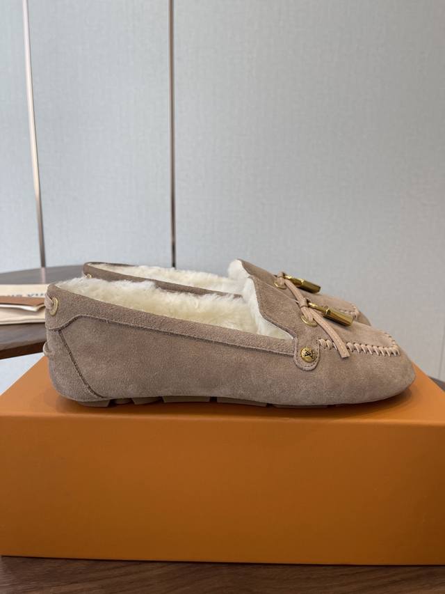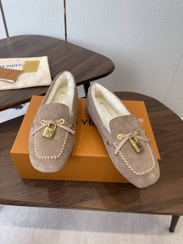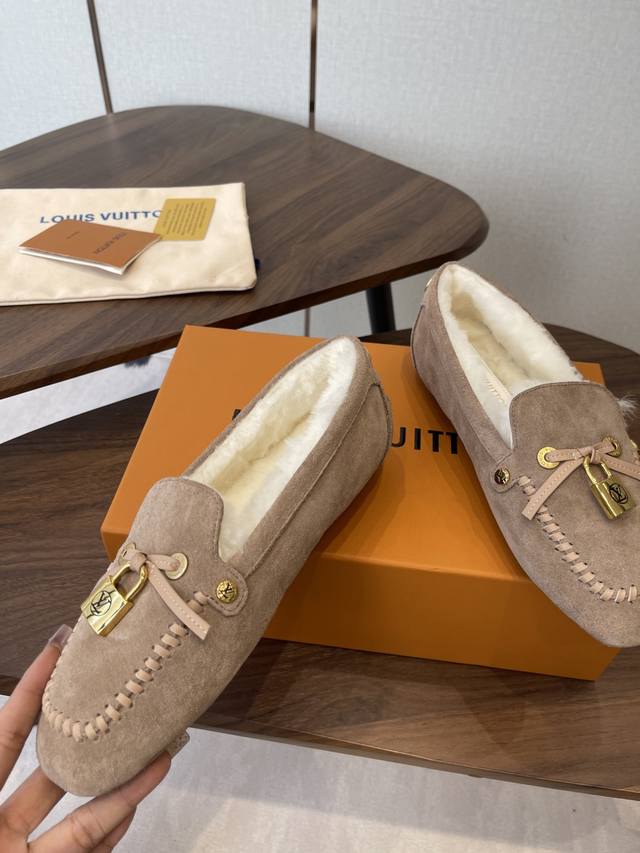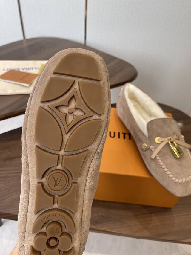 Louis Vuitton 25Ss flat loafers/driving shoes, featuring a lightweight and comfortable moccasin construction made of premium cowhide, a hand-stitched upper, and a wool lining. Adorned with the Louis Vuitton Cicle logo and patterned lace tips. The butterfly-inspired design exudes luxury and sophistication, perfectly embodying the brand's luxurious style. The lining is made of water-dyed cowhide, and the outsole features original A-grade rubber granules. Sizes: 35-42, 40, 41, 42. Custom orders are non-refundable and non-exchangeable.