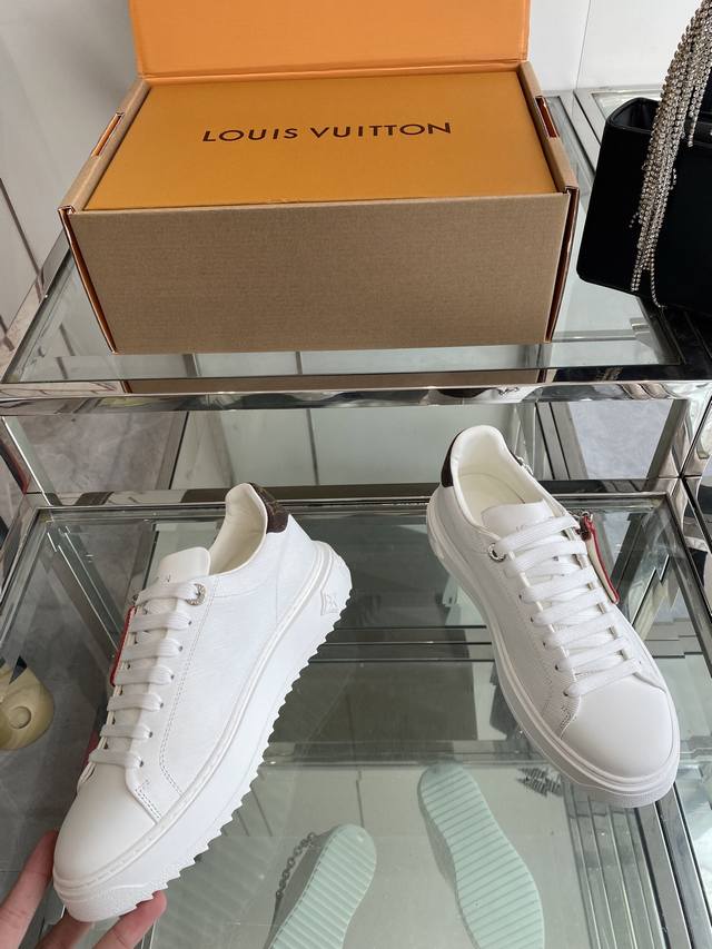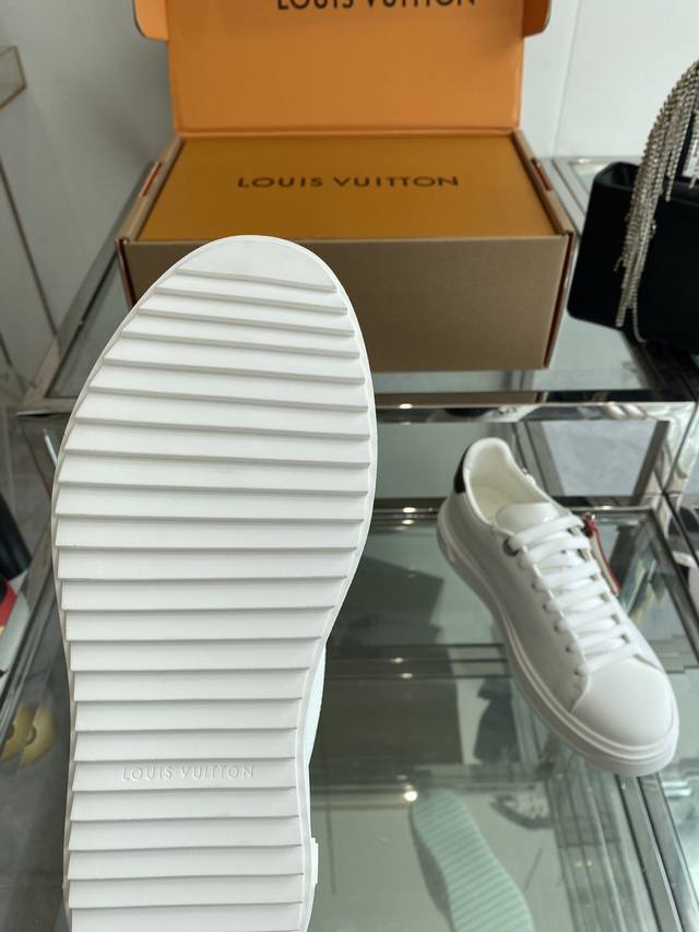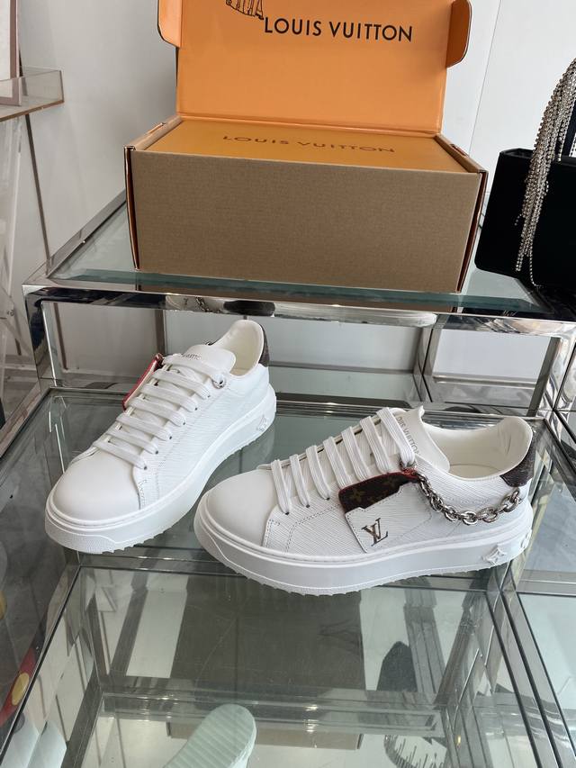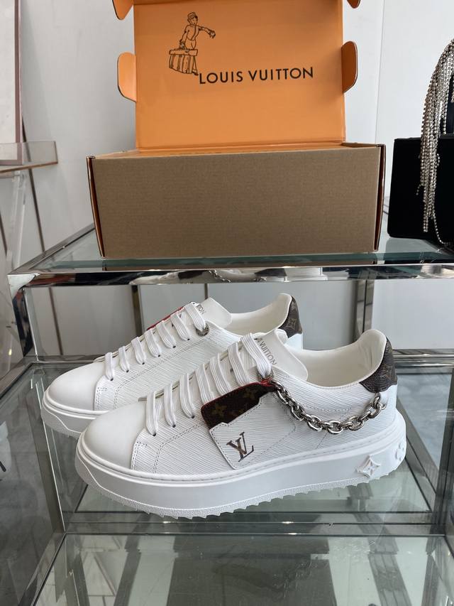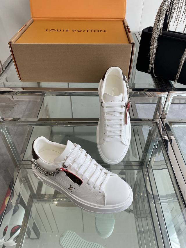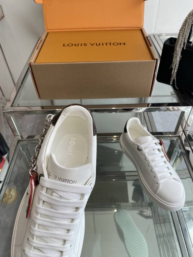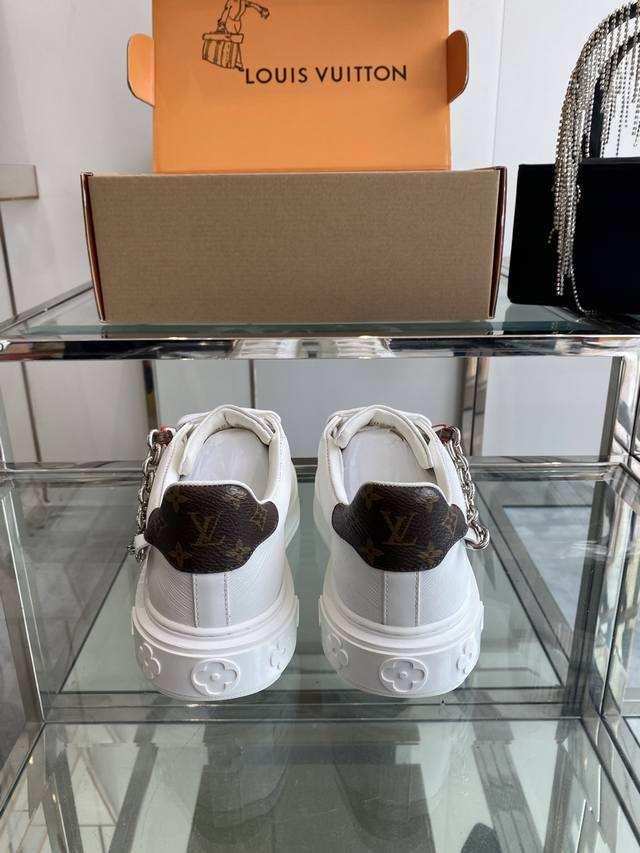 Louis Vuitton 25Ss New Monogram Chain Sneakers, White Sneakers, Super Popular with Fashion Bloggers and Influencers. Simple shoe design with a plaid pattern, embossed brand logo, metal buckles, monogrammed details, LV Circle rubber patch on the tongue, rich details, original custom silk cowhide upper, water-dyed cowhide lining, one-piece molding process, EVA insole, original mold, TPU outsole. Sizes: 35-41, 40, 41. Custom made.