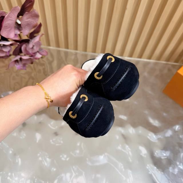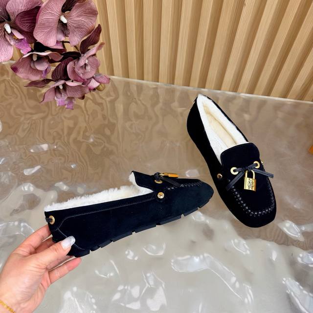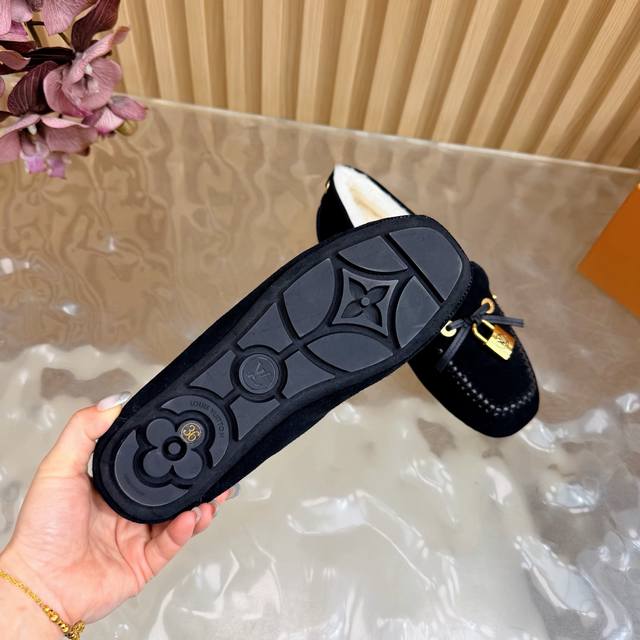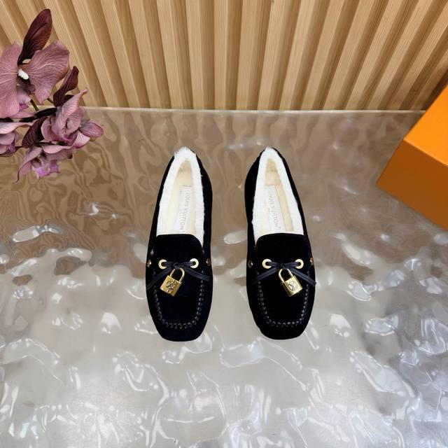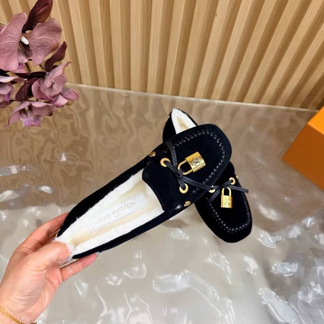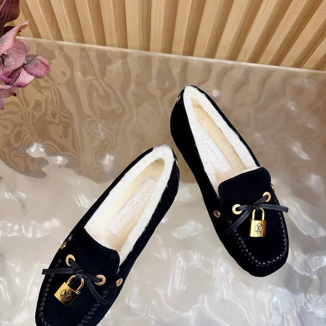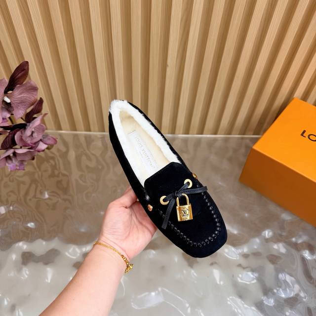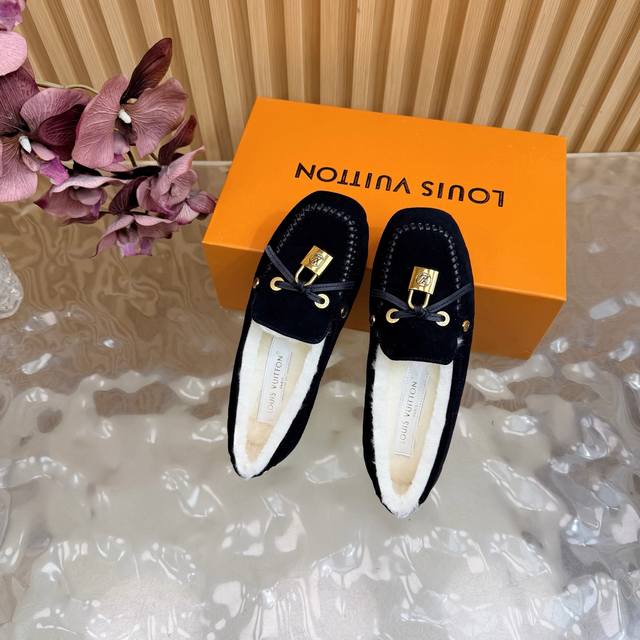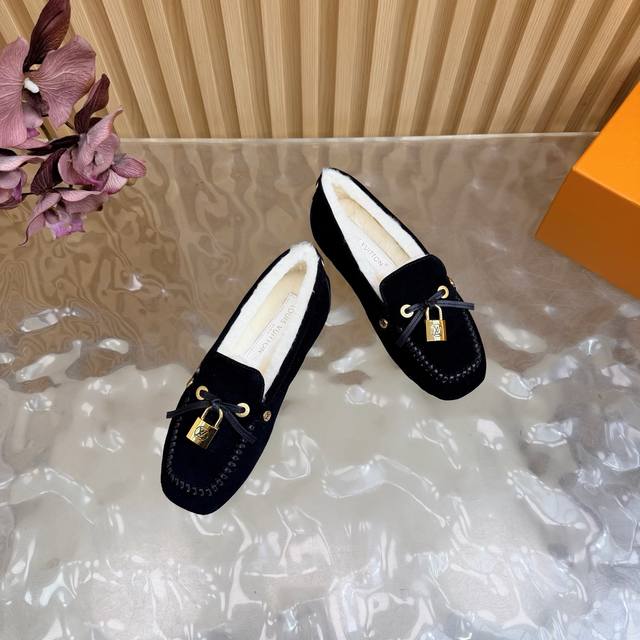 Louis Vuitton. A timeless classic, luxurious loafer with a classic gold clasp and wool lining. Encounter the art of Louis Vuitton loafers. From the classic, timeless brown to the bold, avant-garde silver and checkered pattern, each pair is crafted with top-quality leather. The upper is adorned with the iconic gold clasp, exuding effortless luxury with every click and closure. What I love most is that exquisite gold clasp! The click-clasp sound is incredibly sophisticated! Whether paired with suit trousers for a sharp, professional look, jeans for a casual vibe, or even a skirt, it's perfect! Material: Premium suede; Lining: Wool; Sole: Custom-made (original mold); Packaging: Exquisite boutique shoe box; Sizes: 35