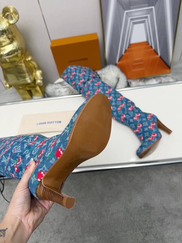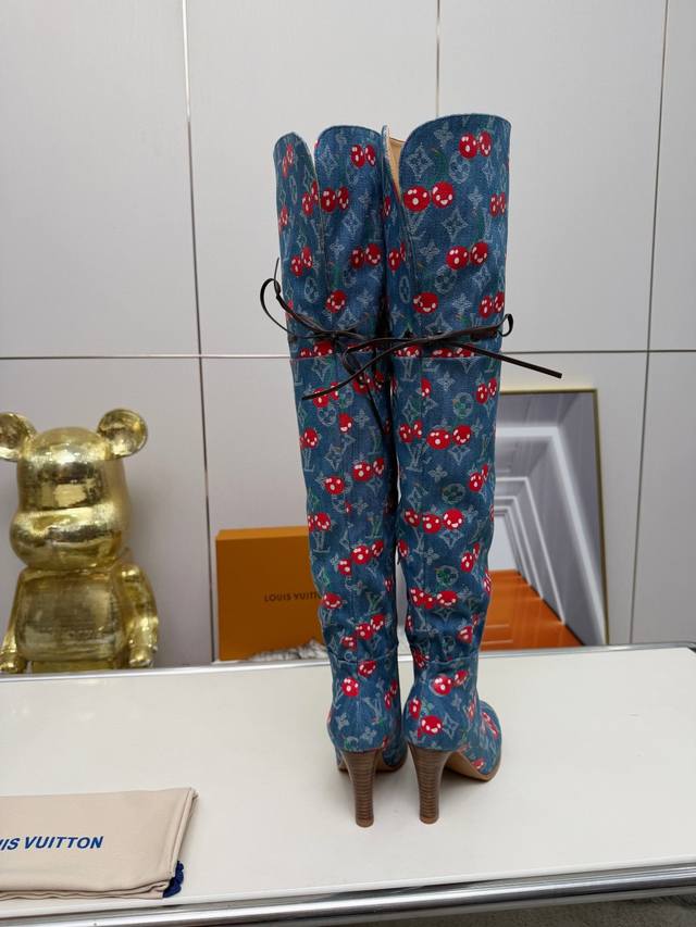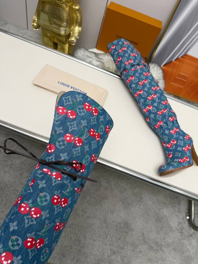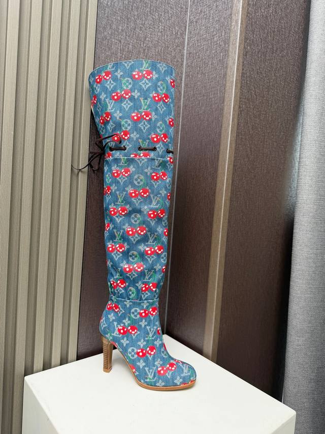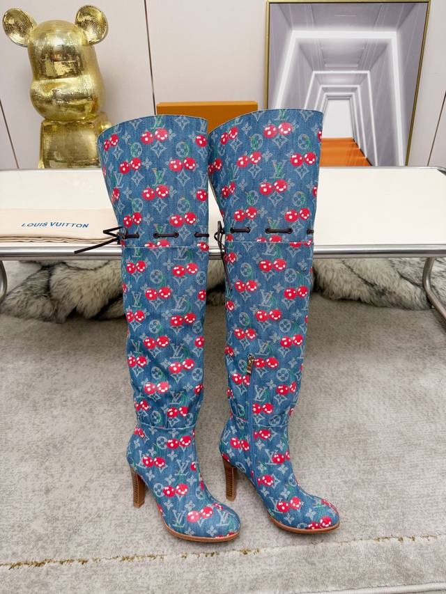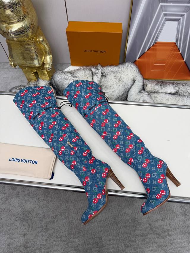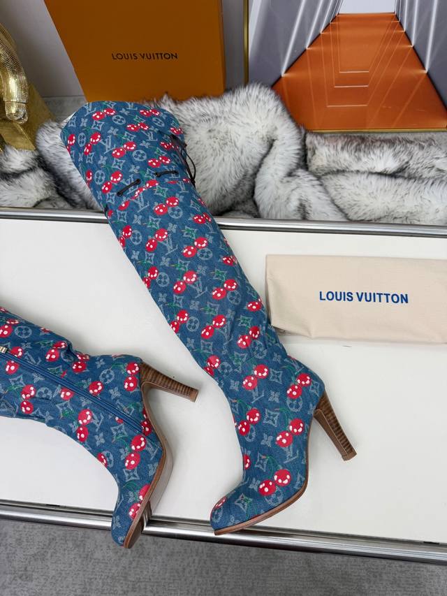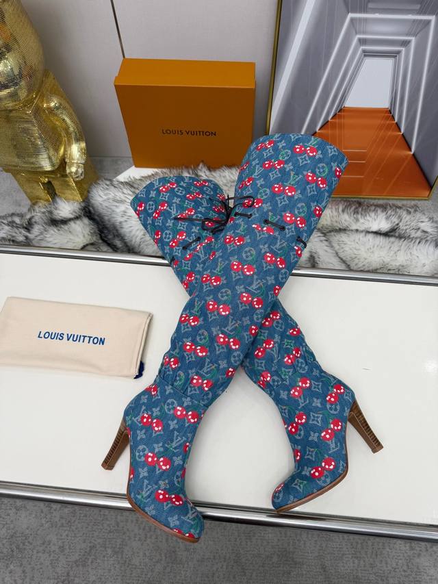 Louis Vuitton Cherry Series Women's Over-the-Knee Boots. Rubber Sole: Leather Sole: Sizes: 35-44, 42-44 (Custom Made). Design Style: Based on the brand's classic Monogram pattern, the boots are adorned with red cherry prints, blending the brand's logo with playful elements for a retro yet charming style. Details: Over-the-knee boots with a side zipper for easy on and off, and an adjustable lace-up design at the boot shaft; the chunky wooden heel combines a retro feel with stability, enhancing both presence and comfort. Materials and Craftsmanship: Textured fabric with exquisite printing; the harmonious and layered color combination of the Monogram and cherry patterns showcases the brand's high-end shoemaking craftsmanship.