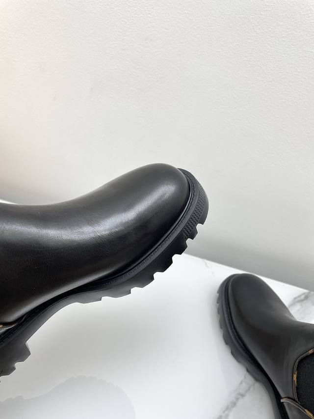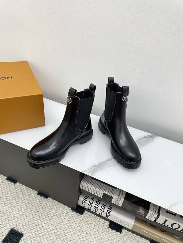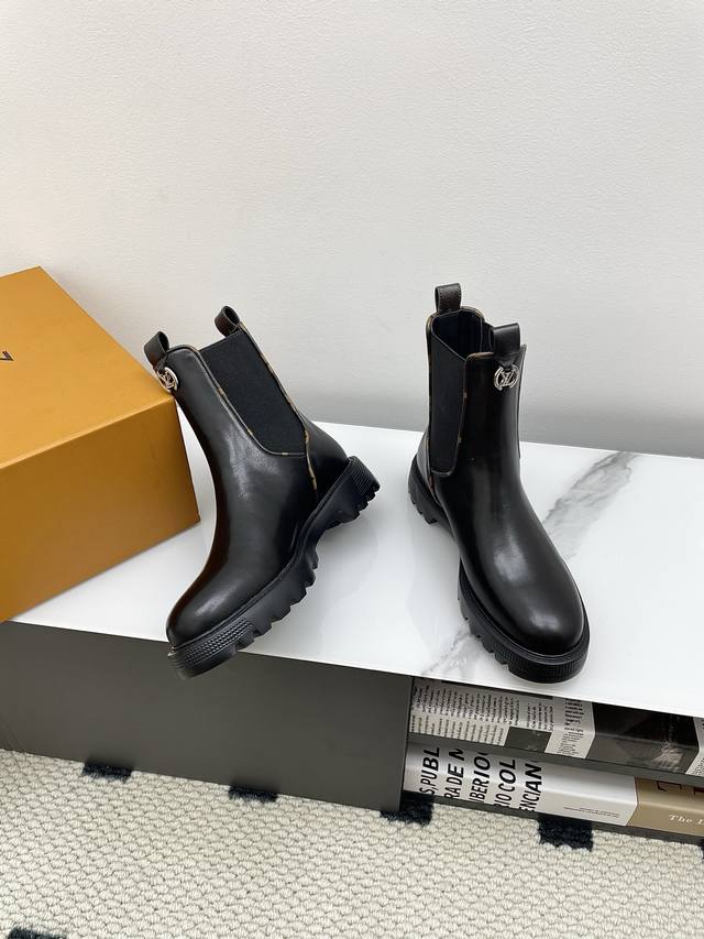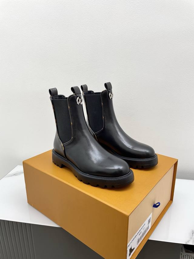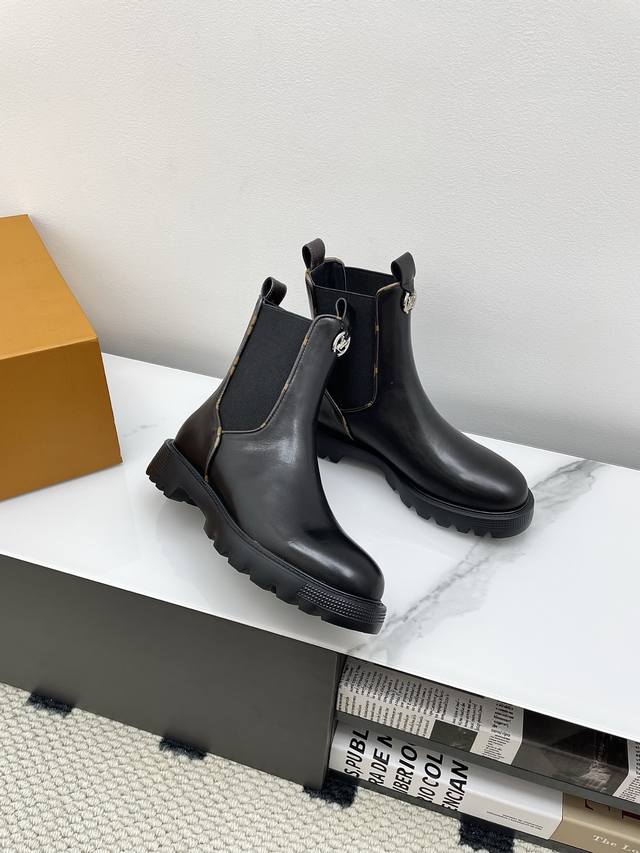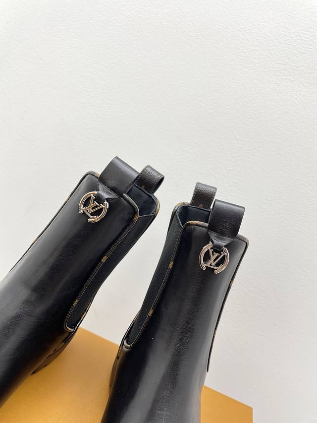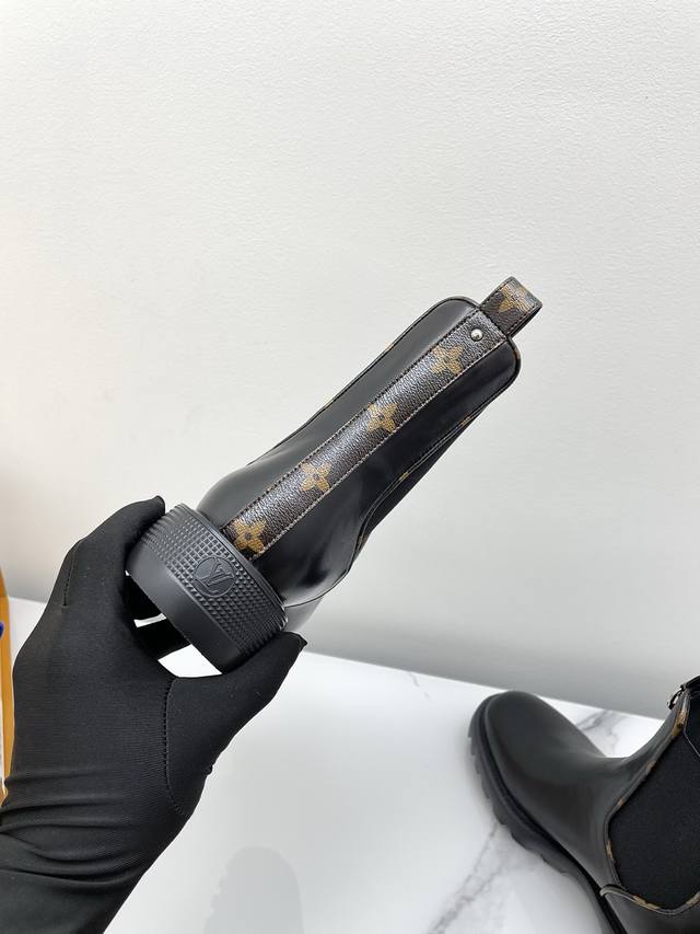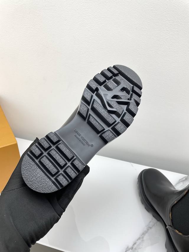 Louis Vuitton District Ranger 2025 Fall/Winter Chelsea Boots (Retail Purchase). This District Ranger ankle boot embodies military inspiration and Louis Vuitton's travel heritage, featuring a supple calfskin upper adorned with metal chains and a Monogram canvas luggage tag-shaped charm. The Eva outsole boasts a finely textured pattern, thick yet lightweight. Material: Top-grain calfskin; Lining: Mixed sheepskin; Outsole: Original molded foamed rubber; Sole thickness: 3.5cm; Size: 35-40 (40 custom sizes available).
