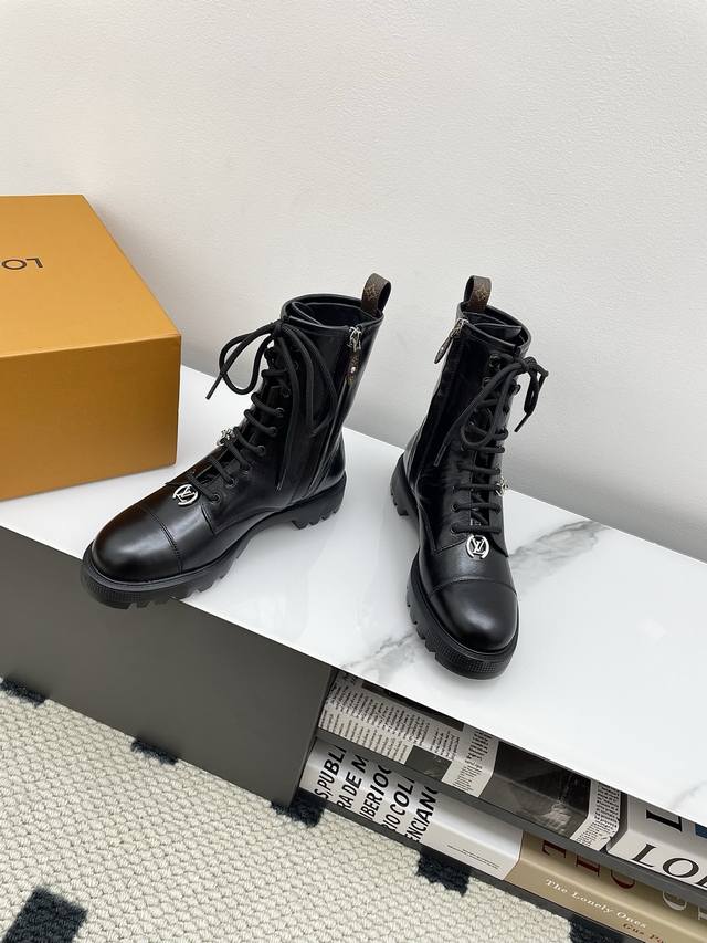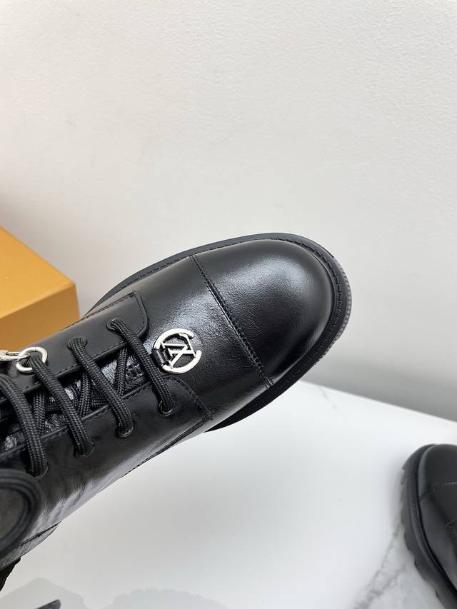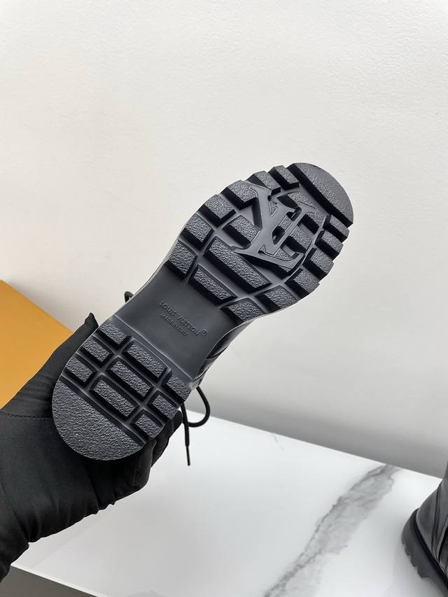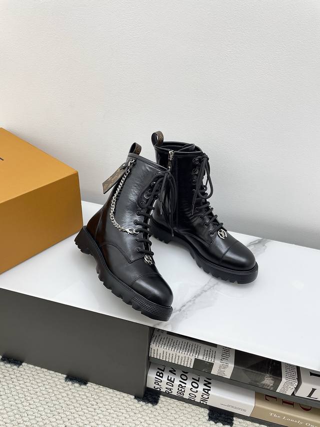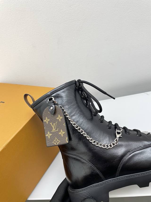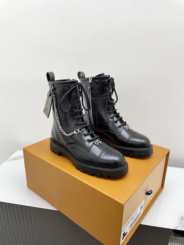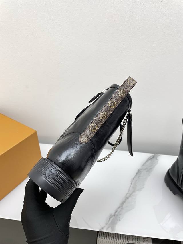 Louis Vuitton District Ranger 2025 Fall/Winter New Lace-up Dr. Martens Boots (Retail Purchase). This District Ranger ankle boot embodies military inspiration and Louis Vuitton's travel heritage, featuring a supple calfskin upper adorned with metal chains and a Monogram canvas luggage tag-shaped charm. The Eva outsole boasts a finely textured pattern, thick yet lightweight. Upper: Custom waxed leather (regular version uses smooth calfskin). Lining: Mixed sheepskin lining. Outsole: Original molded foamed rubber material. Sole thickness: 3.5cm. Size: 35-40 (40 custom available).