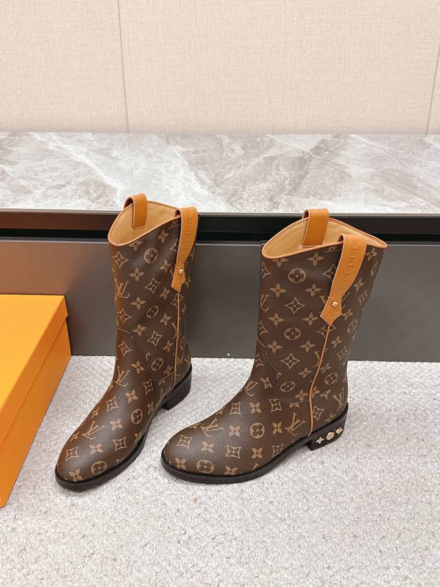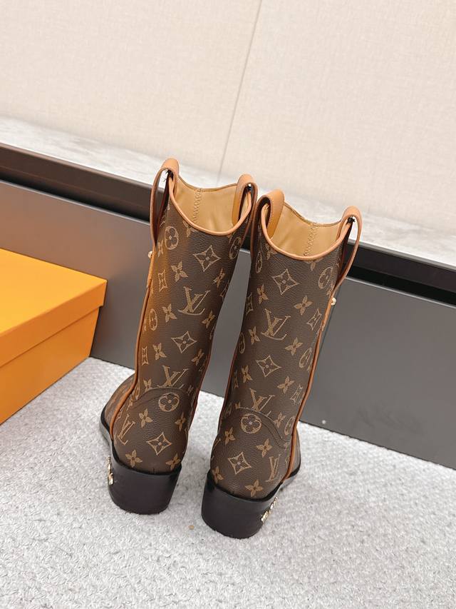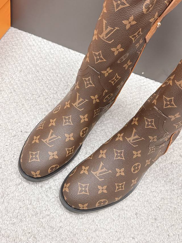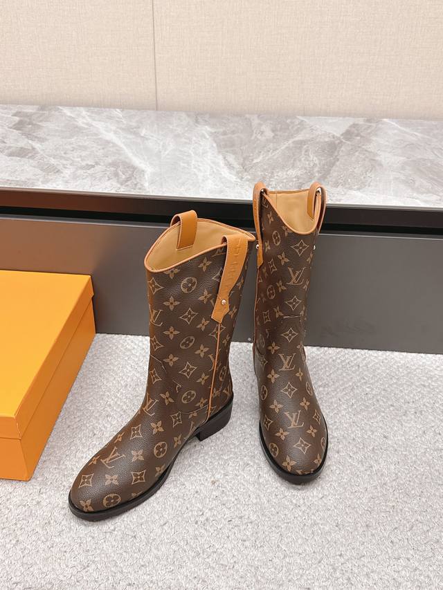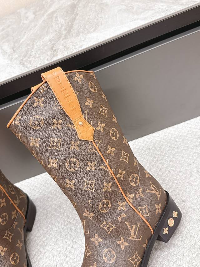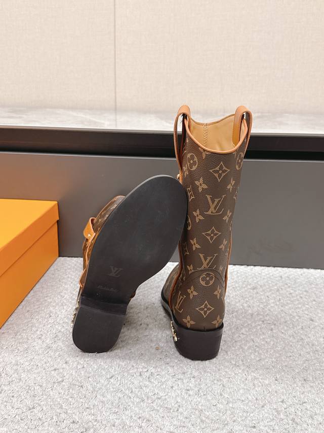 Louis Vuitton Fall/Winter Newest Western Cowboy Boots. Highly recommended by celebrities and fashion bloggers. A 1:1 replica, perfectly tailored for the latest trendy designs that have taken the internet by storm. These boots are cool and stylish on the feet. The unique design at the boot shaft is particularly eye-catching and flattering, slimming the legs. Upper material: Grained calfskin. Lining material: Mixed sheepskin. Original mold. Eva outsole. Sizes: 35-40, 41, 42. Custom orders, no returns or exchanges.