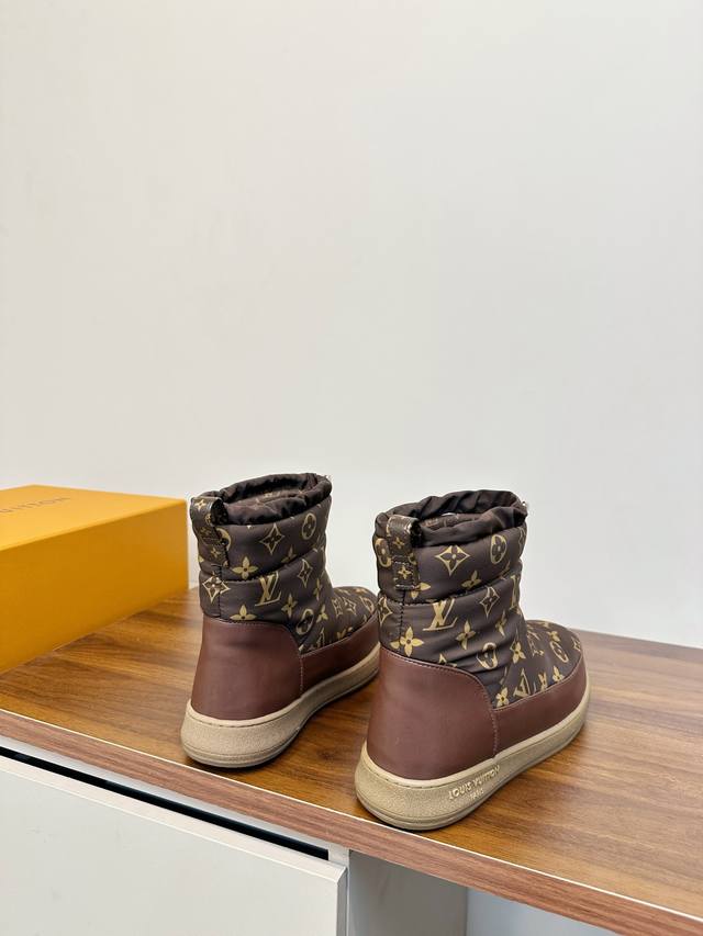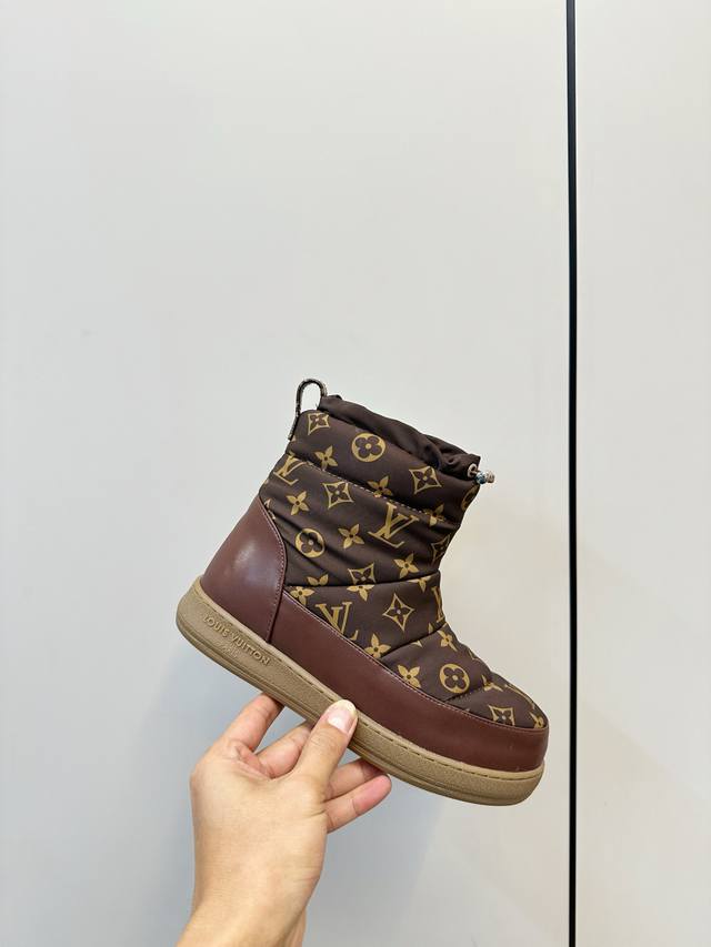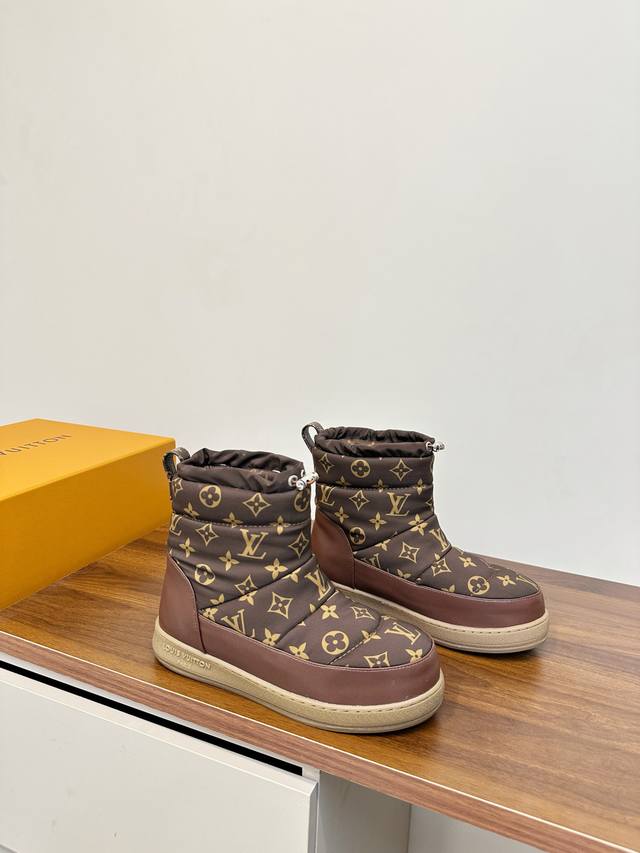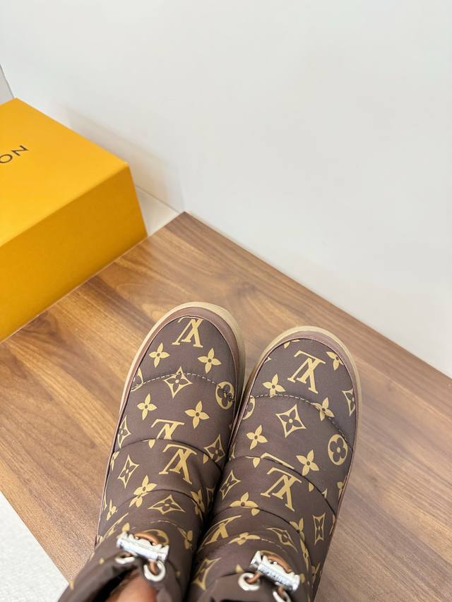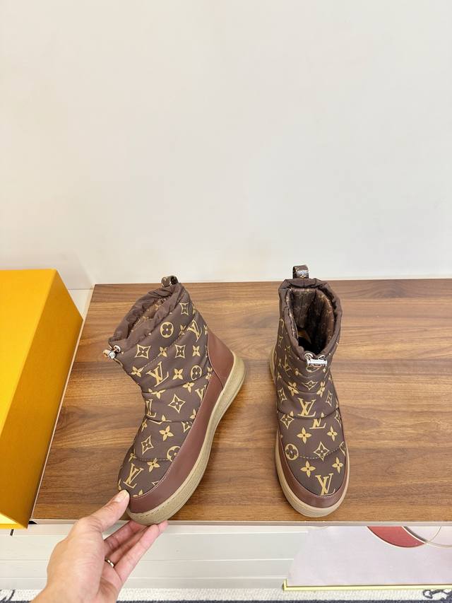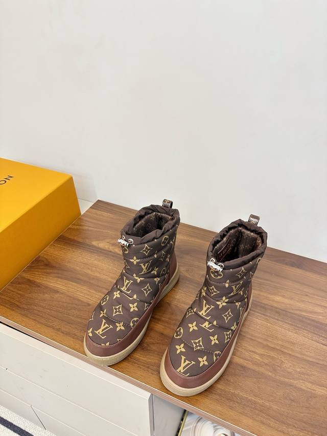 Louis Vuitton LV 2025 Fall/Winter Waterproof Down Snow Boots DDD LV 2025 Fall/Winter snow boots, featuring classic Monogram pattern patchwork, highly recognizable brand. Ddd Non-slip rubber sole, super safe for winter outdoor wear. Ddd Drawstring design on the boot shaft, warm and snug fit, maximum comfort! Ddd Overall simple and stylish, versatile for commuting or winter outings, easily matching various styles of clothing, fashionable and practical~ Ddd Sizes 35-40, 40.41 custom made DDD