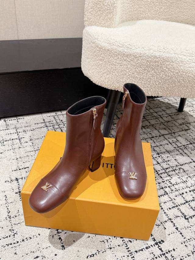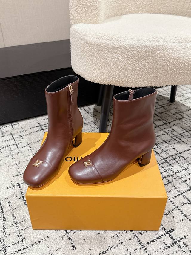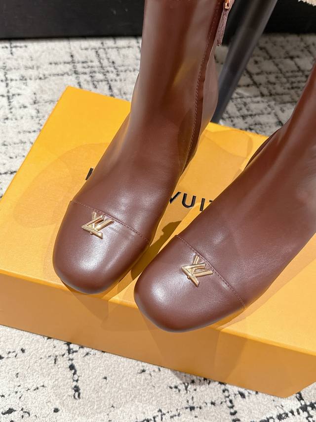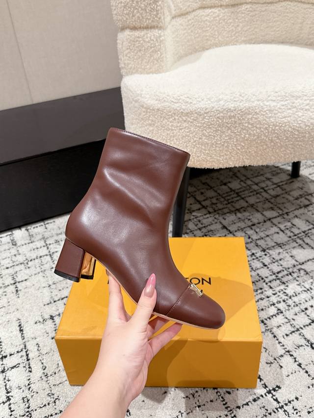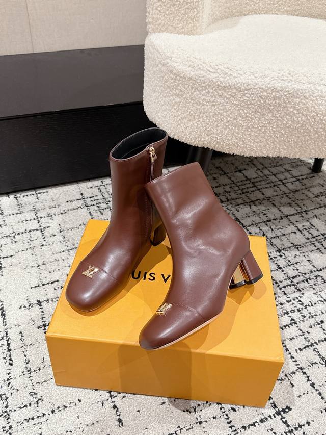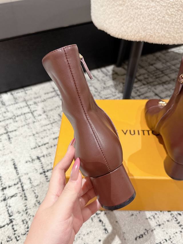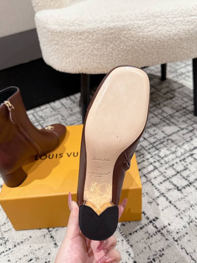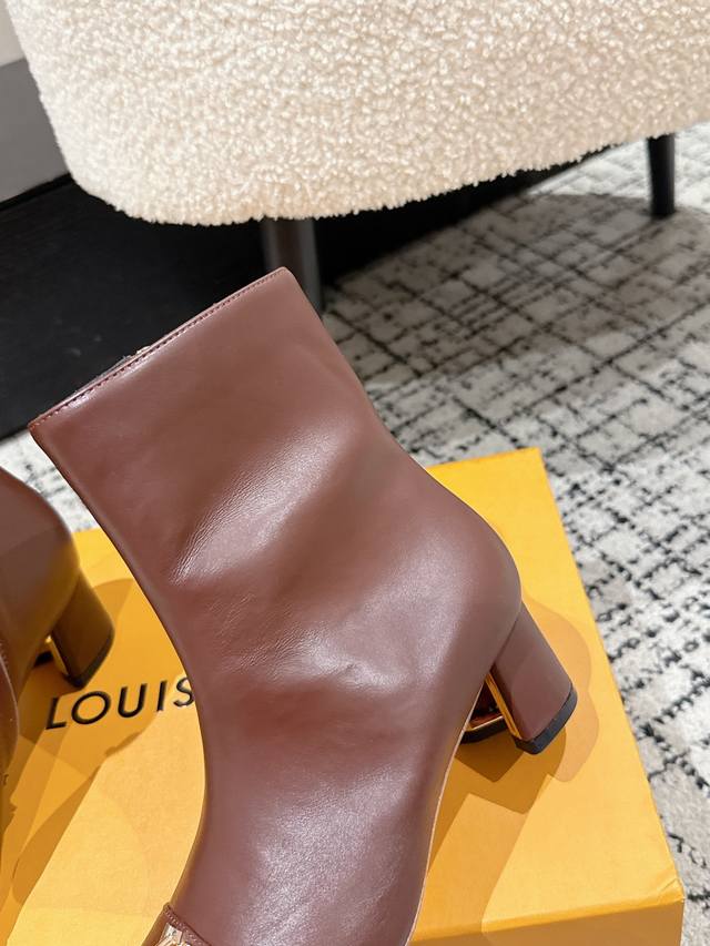 Louis Vuitton LV 25 Fall/Winter Newest Swing High-Heeled Ankle Boots with Side Zipper and Letter Buckle. Made from soft leather for easy on and off, these boots feature clean lines that exude elegance. The V-shaped openwork square heel and lustrous lining create a distinctive look, while the Lvtwist toe detail adds a touch of sophistication. The cute round toe with the LV logo is both refined and stylish, and the chunky heel provides exceptional comfort. A classic and versatile piece! Original molded V-shaped gold heel! Upper: Imported calfskin; Lining: Sheepskin; Sole: Italian Grade A genuine leather; Heel height: 5.5cm; Size: #35-41 (40.41 is custom-made and non-refundable).