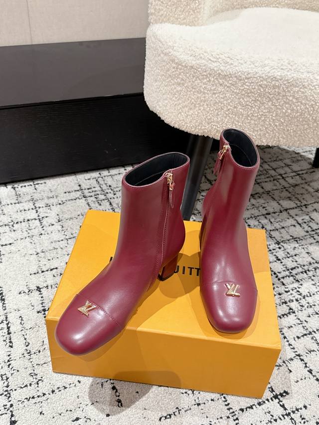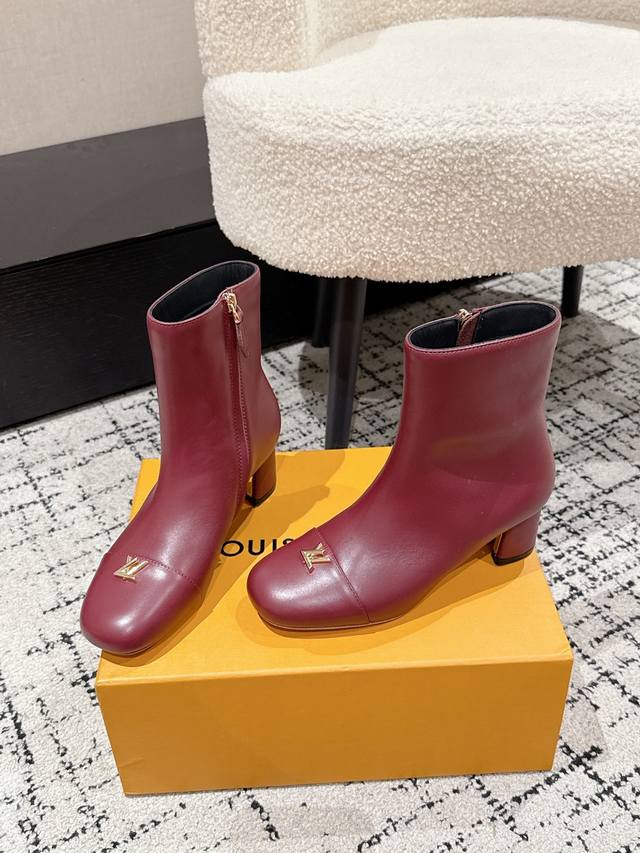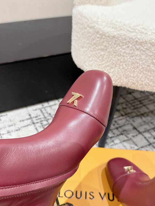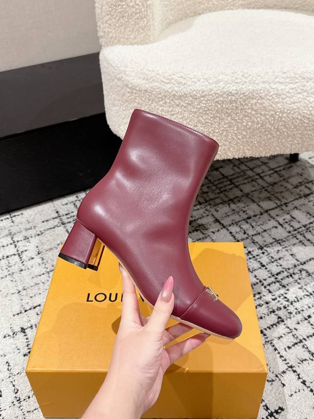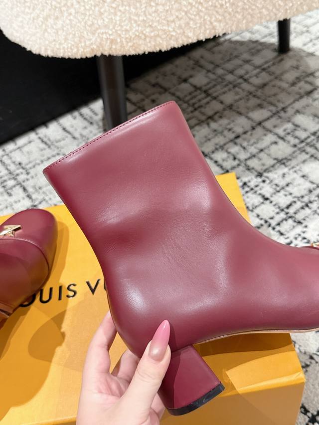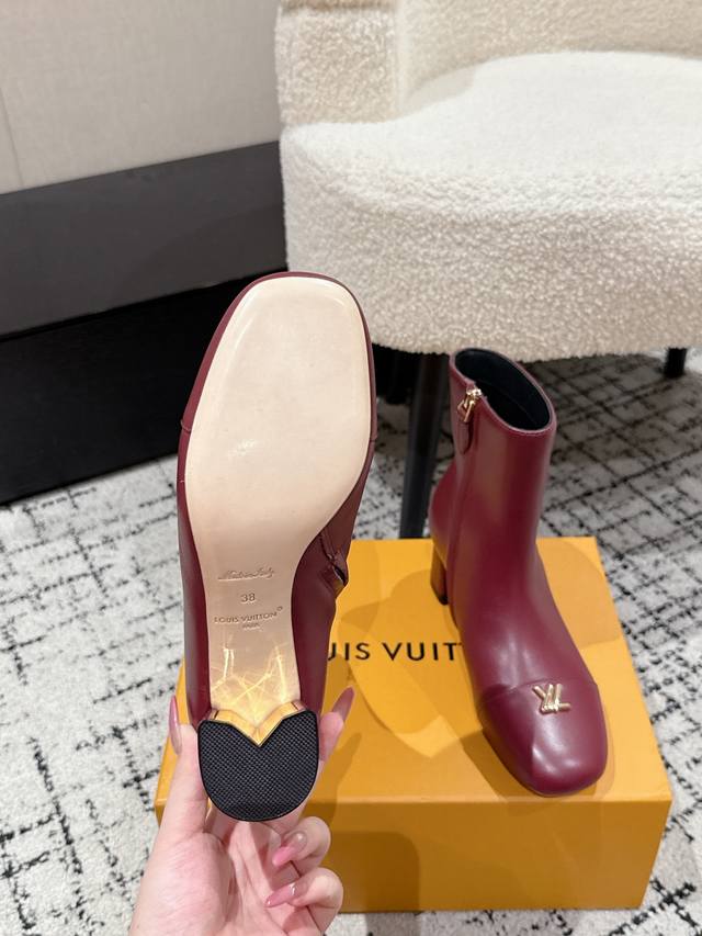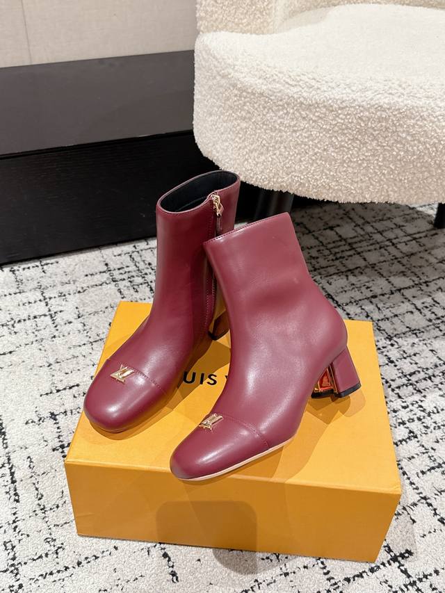 Louis Vuitton LV 25 Fall/Winter Newest Swing High-Heeled Ankle Boots with Side Zipper and Letter Buckle. Made from soft leather for easy on and off, these boots feature clean lines that exude elegance. The V-shaped openwork square heel and lustrous lining create a distinctive look, while the Lvtwist toe detail adds a touch of sophistication. The cute round toe with the LV logo is both refined and stylish, and the chunky heel provides exceptional comfort. A classic and versatile piece! Original molded V-shaped gold heel! Upper: Imported calfskin; Lining: Sheepskin; Sole: Italian Grade A genuine leather; Heel height: 5.5cm; Size: #35-41 (40.41 is custom-made and non-refundable).