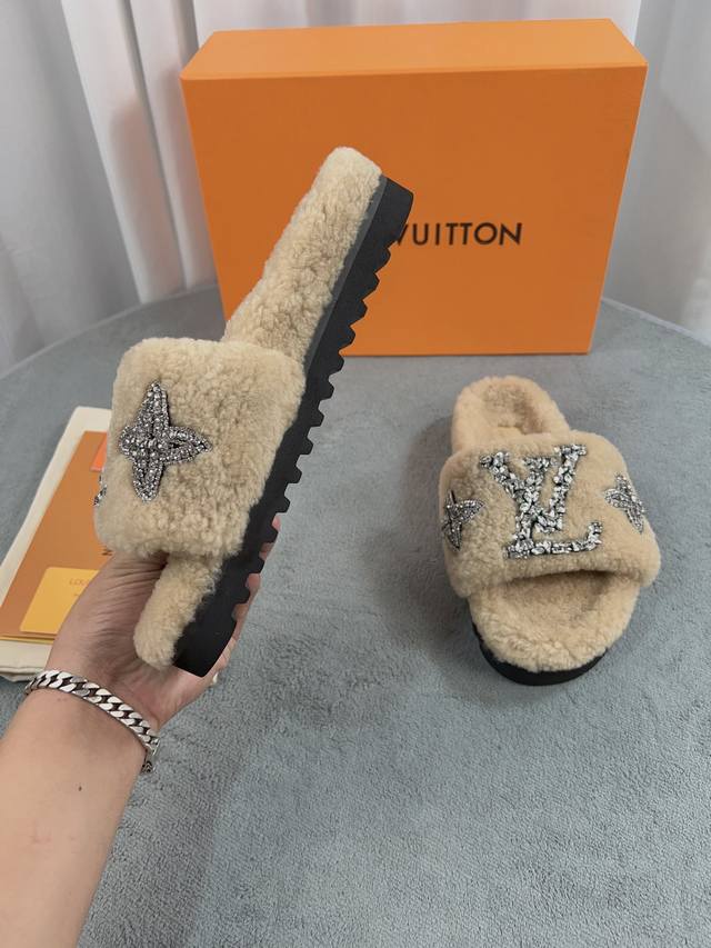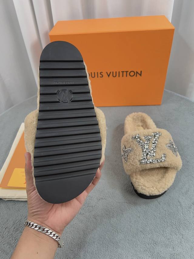 Louis Vuitton (LV) hot-selling new wool slippers! Made from top-quality pure wool, these slippers are incredibly warm, feeling like walking on clouds. The classic LV monogram embellishments are exquisite and sophisticated! Hand-stitched rhinestones add a touch of luxury and elevate the price of these slippers! The sole is an original molded EVA foam non-slip outsole, very comfortable and non-slip, with a certain thickness for excellent comfort! Upper: Original Australian wool; Lining: Australian wool; Insole: Australian wool; Outsole: Original foam sole; Height: 3.5cm; Packaging: Original drawer box; Sizes: 35-46 (34 & 46 are custom-made and non-refundable); Color: Official website synchronized color batch.