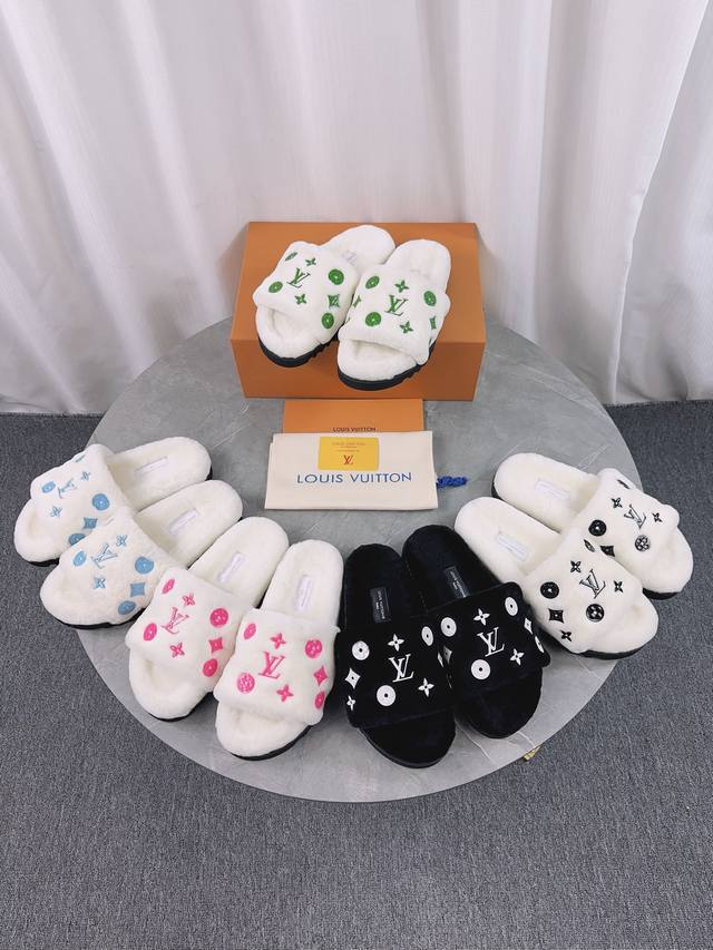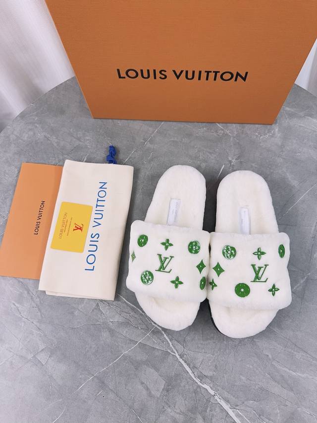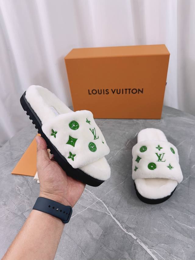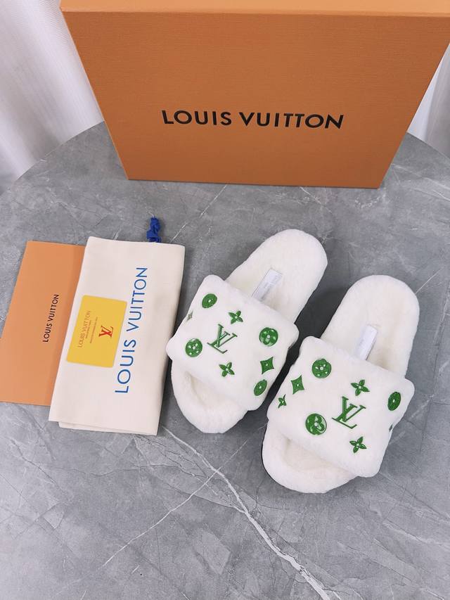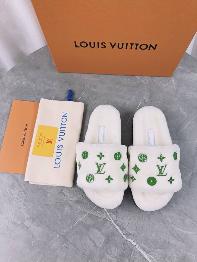 Louis Vuitton (LV) new wool slippers are now available! Made from top-quality pure wool, these slippers are incredibly warm, feeling like walking on clouds. The classic LV monogram embellishments add a touch of sophistication and luxury, significantly enhancing their value. The sole features an original molded EVA foam anti-slip material, ensuring excellent comfort and preventing slipping. Specifications: Upper: Original Australian wool; Lining: Australian wool; Insole: Australian wool; Outsole: Original foam sole; Height: 3.5cm; Packaging: Original drawer box; Sizes: 35-40, 34, 40, 41 (custom orders are non-refundable); Color: Official website color matching.