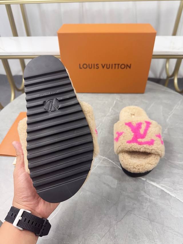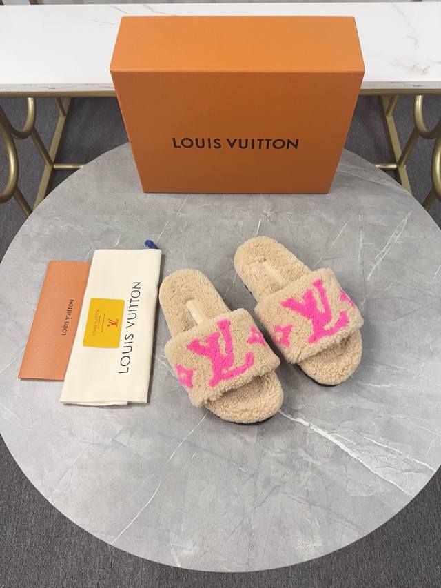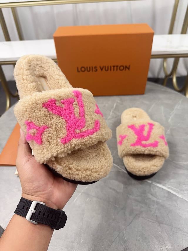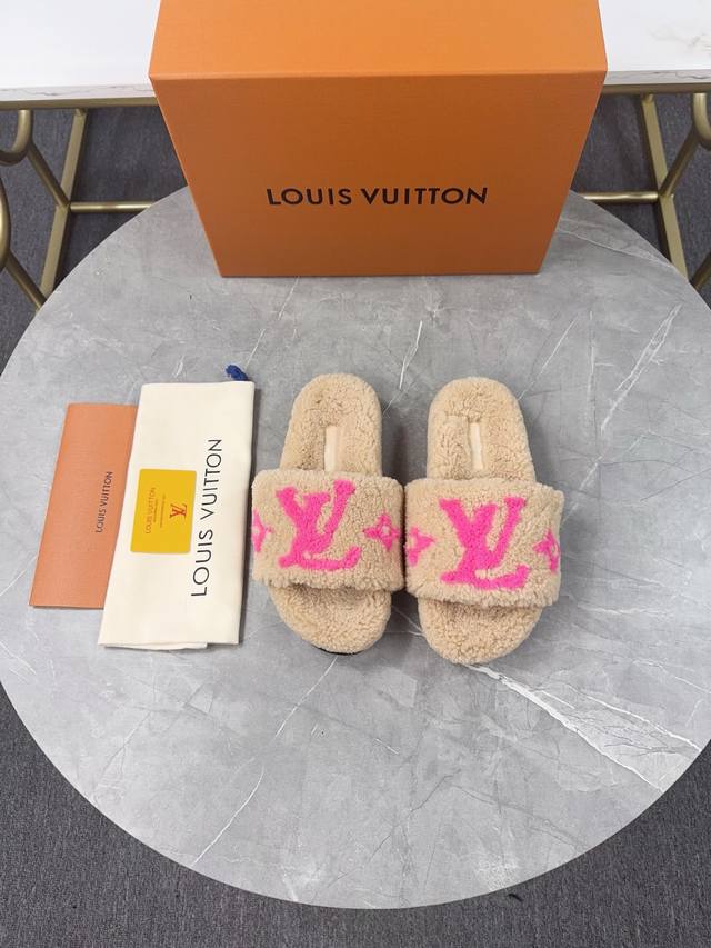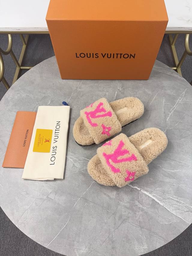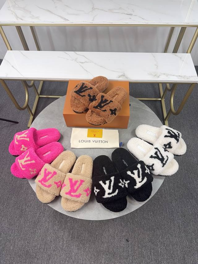 Louis Vuitton (LV) New Wool Slippers - Soft and Fine Wool, Top Quality Pure Wool Straight Hair! Super warm, wearing them feels like walking on clouds. The classic LV monogram embellishments are exquisite and sophisticated, instantly elevating the value of these slippers! The sole is an original molded EVA foam non-slip outsole, very comfortable and non-slip, and the sole has a certain thickness for excellent comfort! Upper: Original Australian Wool Lining: Australian Wool Insole: Australian Wool Outsole: Original Foam Sole Height: 3.5cm Packaging: Original Drawer Box Sizes: 35-40, Sizes 34 and 40 are custom-made and non-refundable Colors: Official website synchronized colors