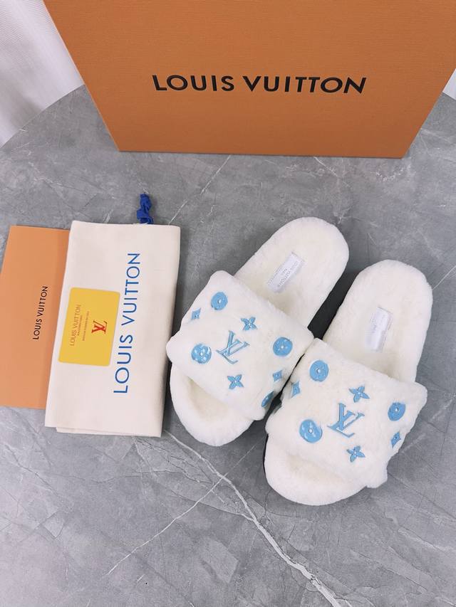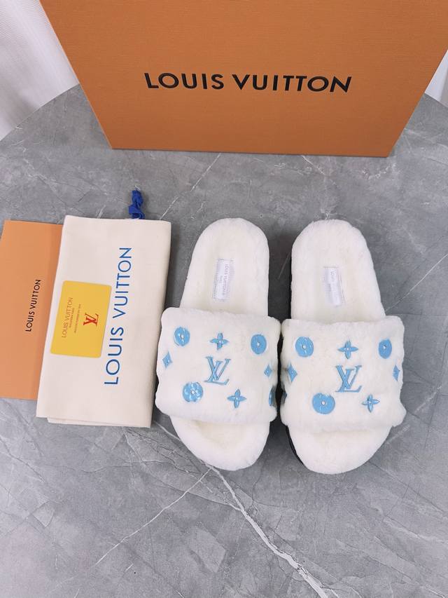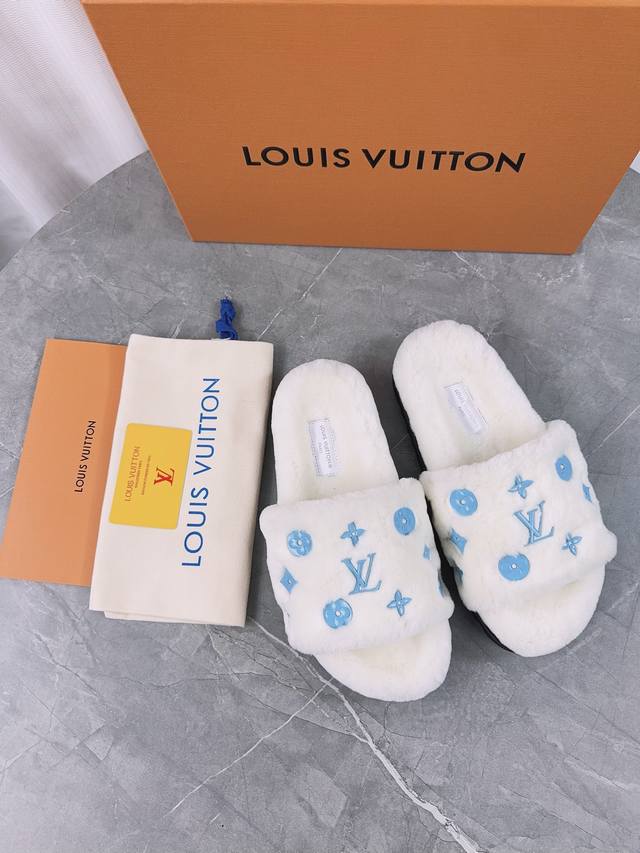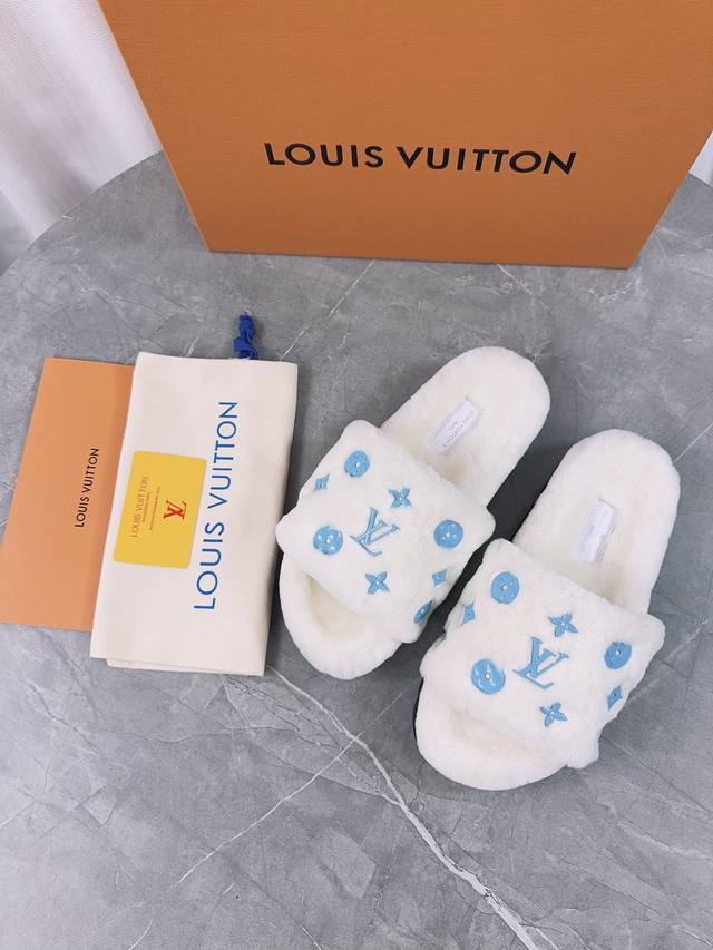 Louis Vuitton (LV) New Wool Slippers - Soft and Fine Wool, Top Quality Pure Wool Straight Hair! Super warm, wearing them feels like walking on clouds. The classic LV monogram embellishments are exquisite and sophisticated, instantly elevating the value of these slippers! The sole is an original molded EVA foam non-slip outsole, very comfortable and non-slip, and the sole has a certain thickness for excellent comfort! Upper: Original Australian Wool Lining: Australian Wool Insole: Australian Wool Outsole: Original Foam Sole Height: 3.5cm Packaging: Original Drawer Box Sizes: 35-40, 34, 40, 41 (Custom orders are non-refundable) Color: Official website synchronized color batch: