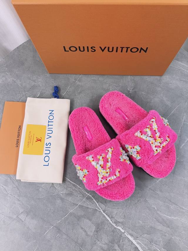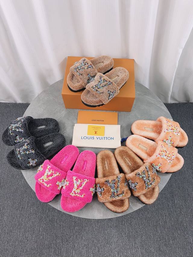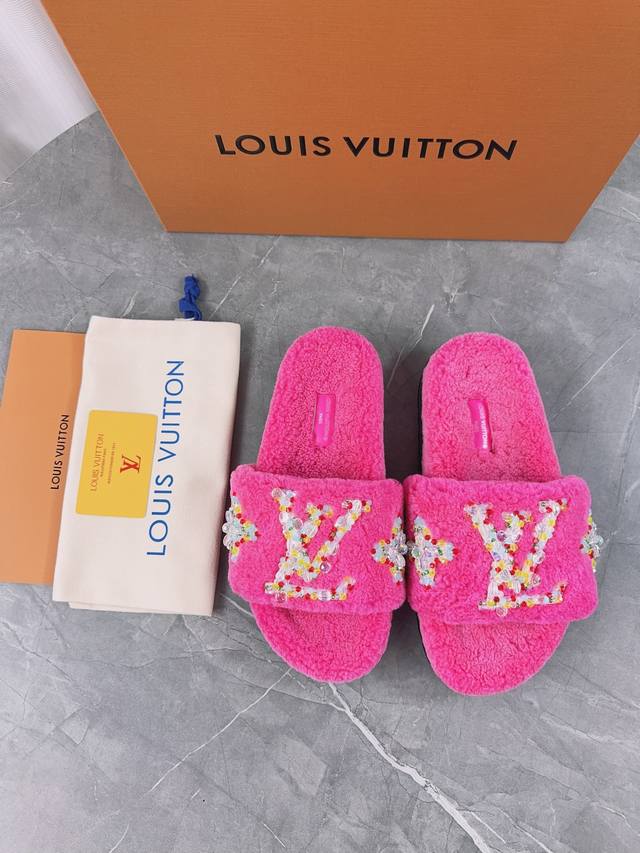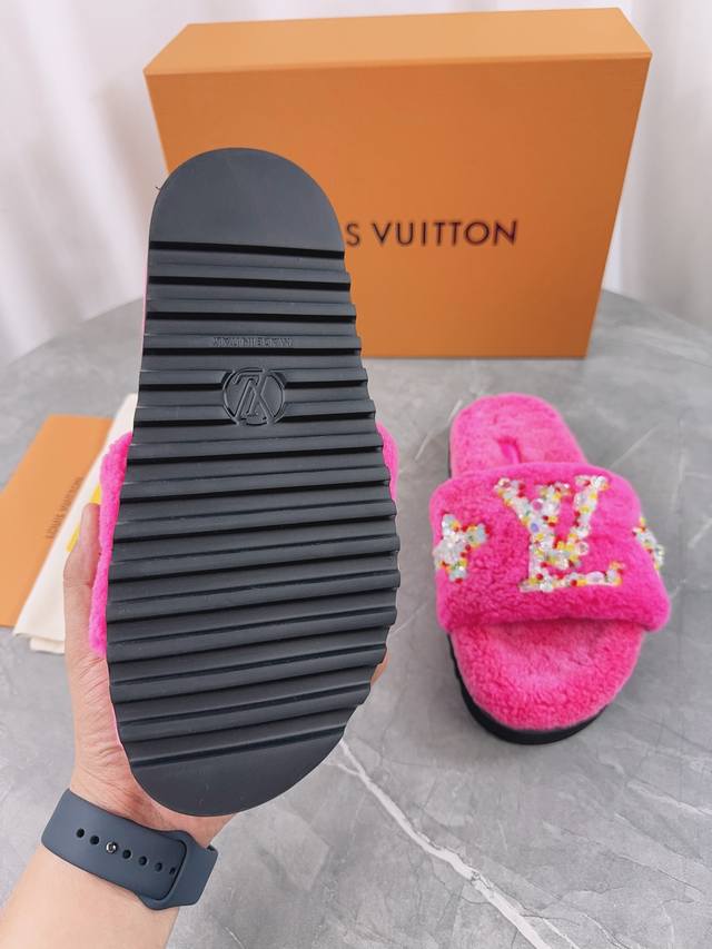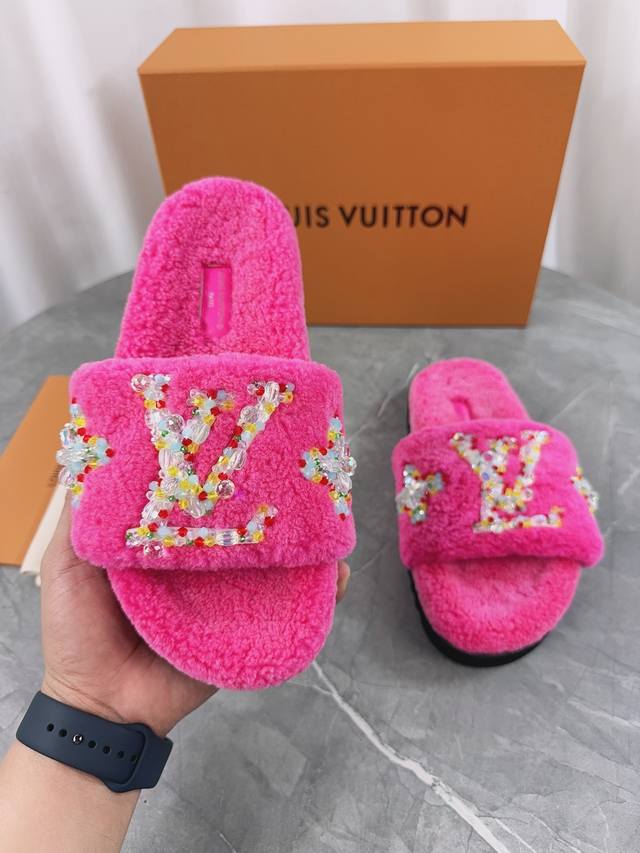 Louis Vuitton (LV) New Wool Slippers - Soft and Fine Wool, Top Quality Pure Wool Straight Hair! Super warm, wearing them feels like walking on clouds. The classic LV monogram embellishments are exquisite and sophisticated, instantly elevating the value of these slippers! The sole is an original molded EVA foam non-slip outsole, very comfortable and non-slip, and the sole has a certain thickness for excellent comfort! Upper: Original Australian Wool Lining: Australian Wool Insole: Australian Wool Outsole: Original Foam Sole Height: 3.5cm Packaging: Original Drawer Box Sizes: 35-40, 34, 40, 41 (Custom orders are non-refundable) Color: Official website synchronized color batch: