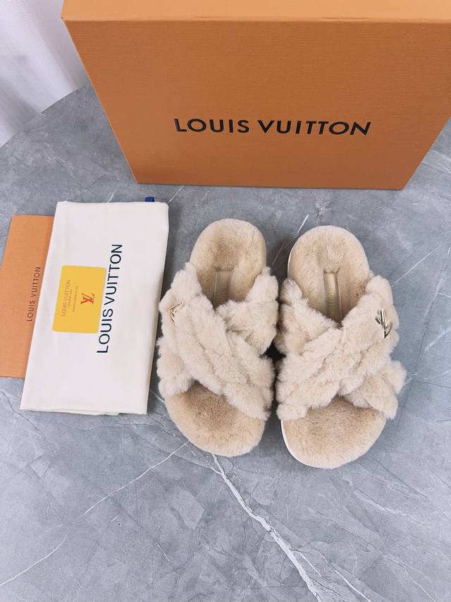 Louis Vuitton (LV) New Wool Slippers - Soft and Fine Wool, Top Quality Pure Wool Straight Hair! Super warm, wearing them feels like walking on clouds. The classic LV monogram embellishments are exquisite and sophisticated, instantly elevating the value of these slippers! The sole is an original molded EVA foam non-slip outsole, very comfortable and non-slip, and the sole has a certain thickness for excellent comfort! Upper: Original Australian Wool Lining: Australian Wool Insole: Australian Wool Outsole: Original Foam Sole Height: 3.5cm Packaging: Original Drawer Box Sizes: 35-40, 34, 40, 41 (Custom orders are non-refundable) Color: Official website synchronized color batch: