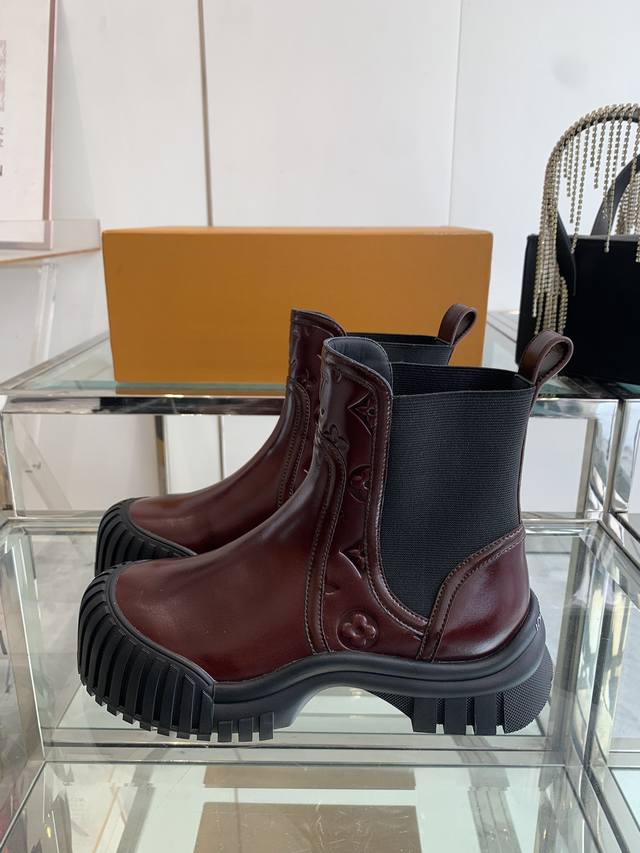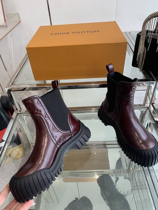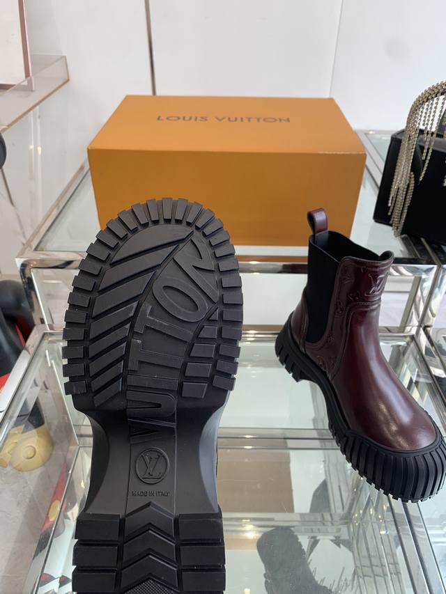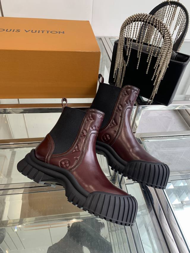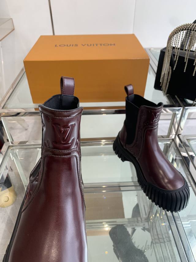 Louis Vuitton Lv Ruby Flat Chelsea Ankle Boots. These flat Chelsea ankle boots feature cowhide leather paired with a thick, vertically ribbed rubber outsole. They interpret the classic Chelsea boot design with avant-garde touches. The Lv Circle rubber logo on the front and the Louis Vuitton logo on the heel both highlight the brand's style. Features include: cowhide leather elastic side panels; rubber outsole with Lv Circle logo; Louis Vuitton logo on the heel; Monogram logo; and patent canvas heel strap. Sizes: 35-40; 40 custom-made.