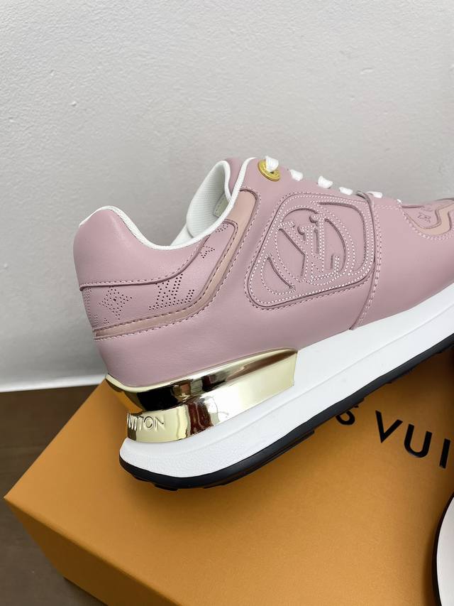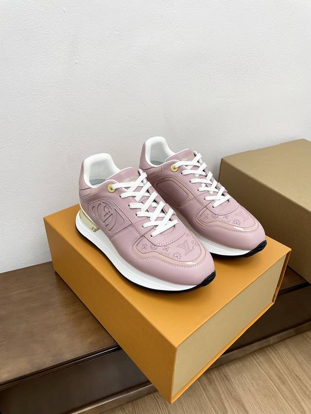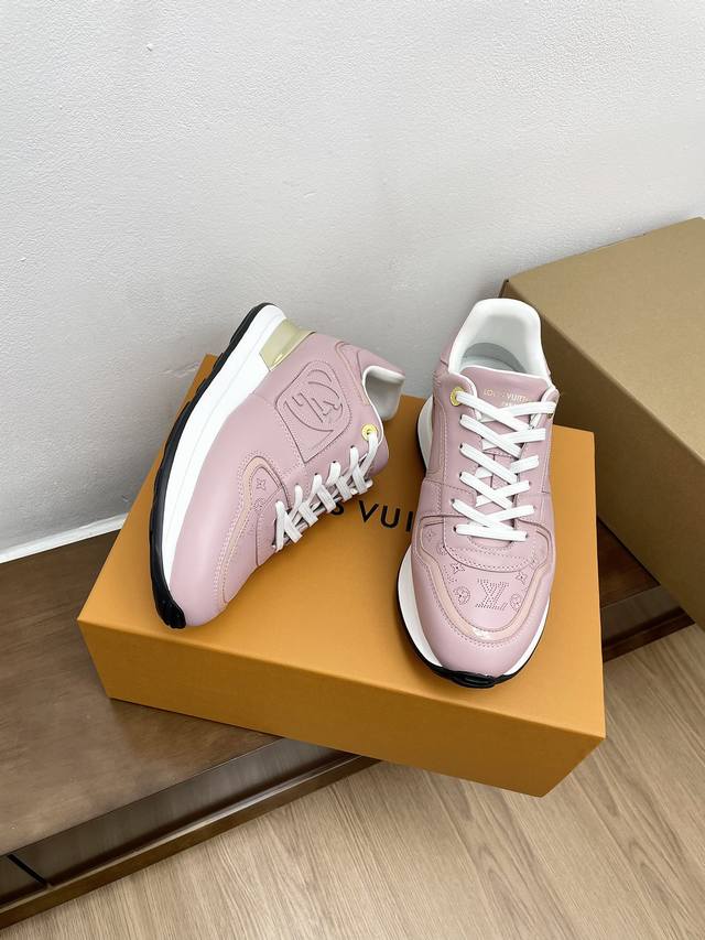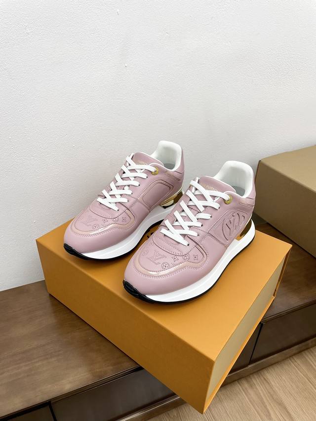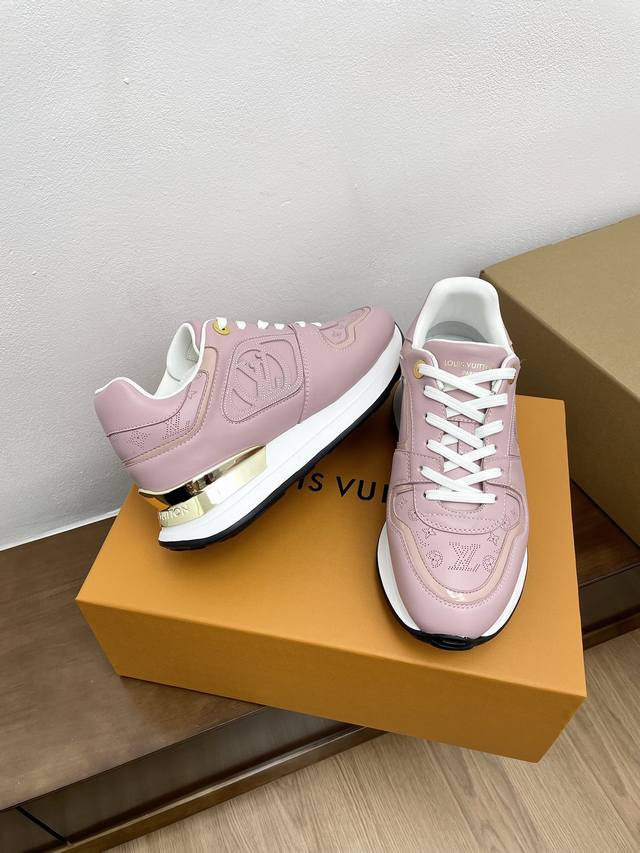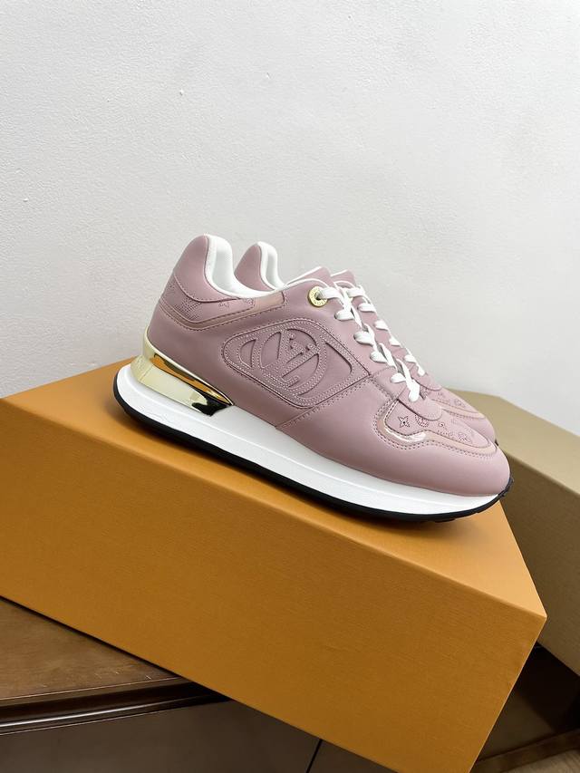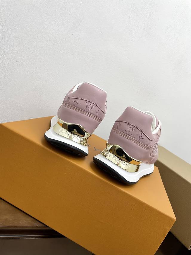 Louis Vuitton Neo Run Away series casual sneakers, sourced directly from the original manufacturer. This Neo Run Away sneaker upgrades the classic Run Away sneaker with two-tone cowhide leather, continuing the running shoe inspiration with clean lines. Features include a wedge outsole, Louis Vuitton lettering on the side, and a patterned lace clip at the heel, all contributing to sophisticated details. Comes with exquisite boutique packaging. Material: Original custom imported top-grain cowhide. Lining: Custom imported breathable mesh. Outsole: Original molded ultra-lightweight foam + TPU material. Sole thickness: 5cm. Size: Women's 35-41, 40, 41 (custom made).