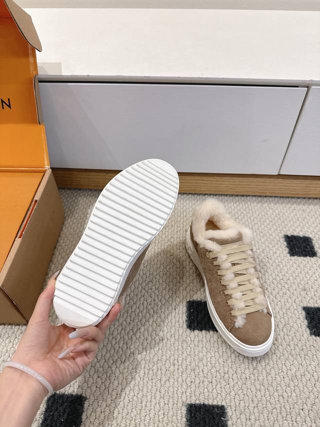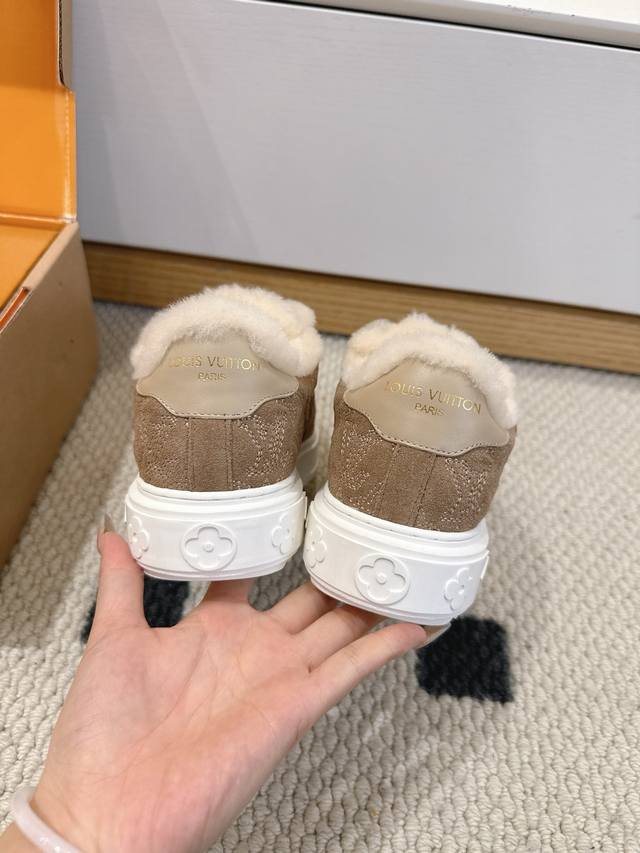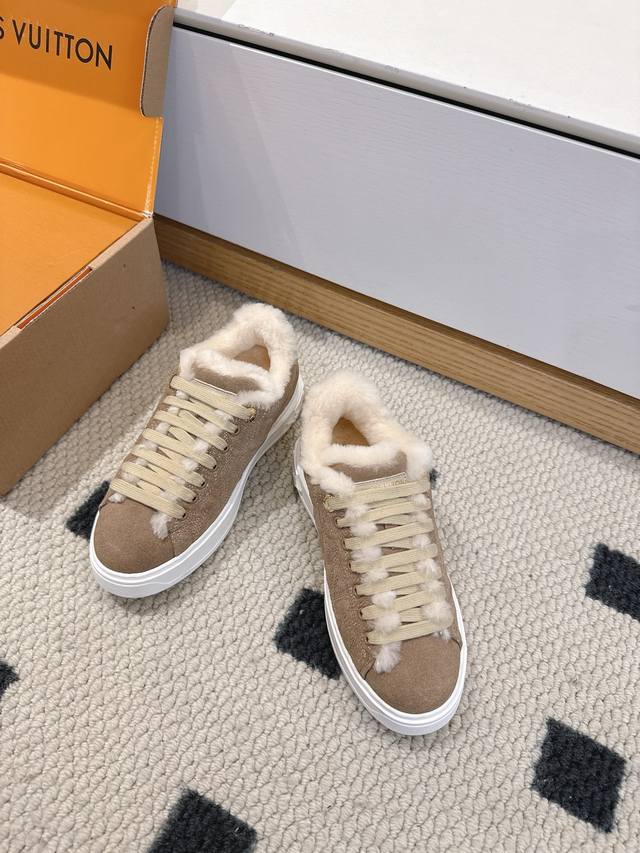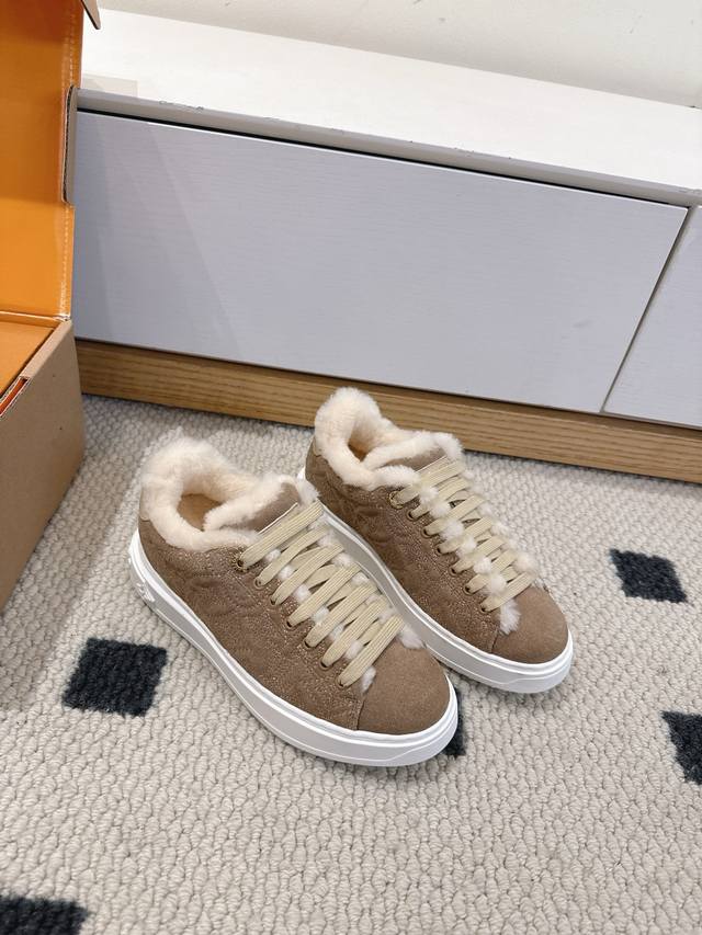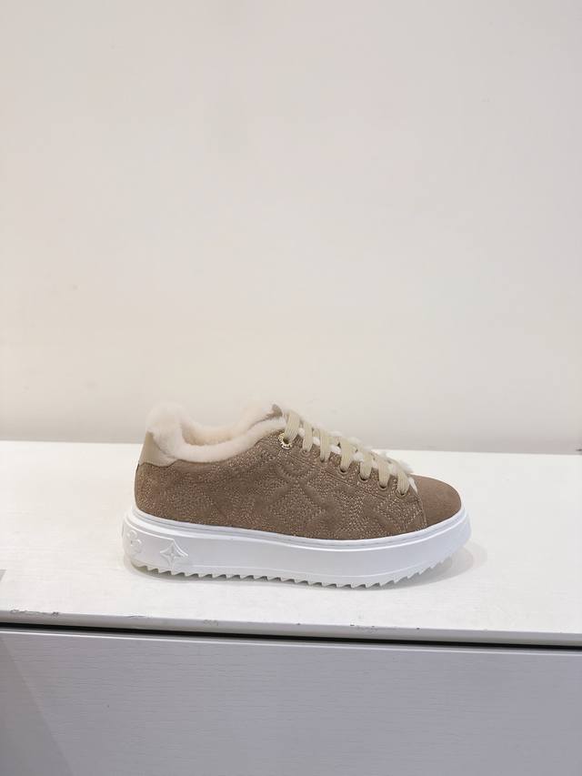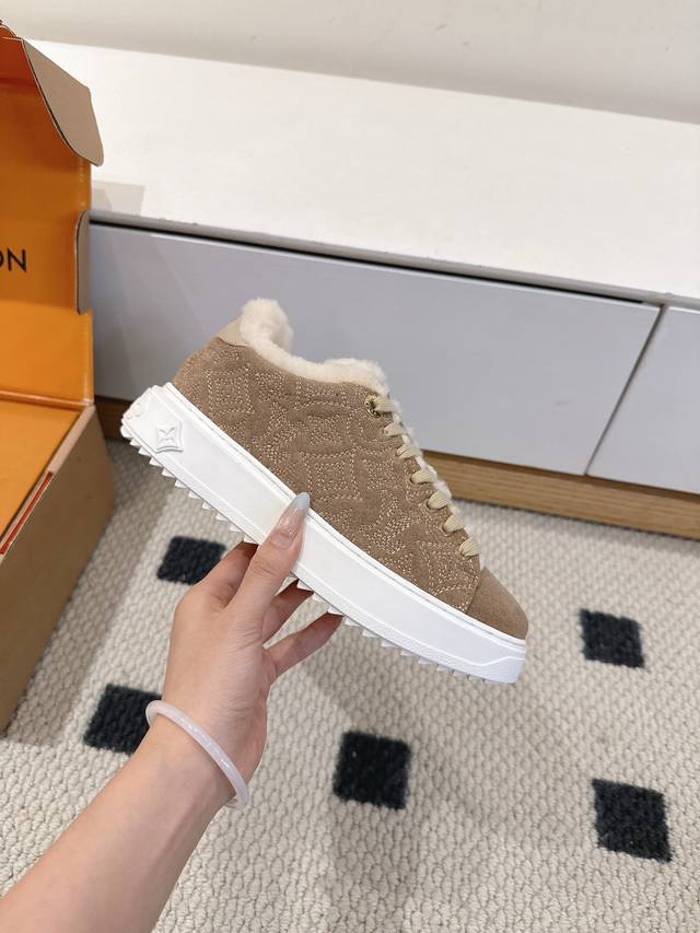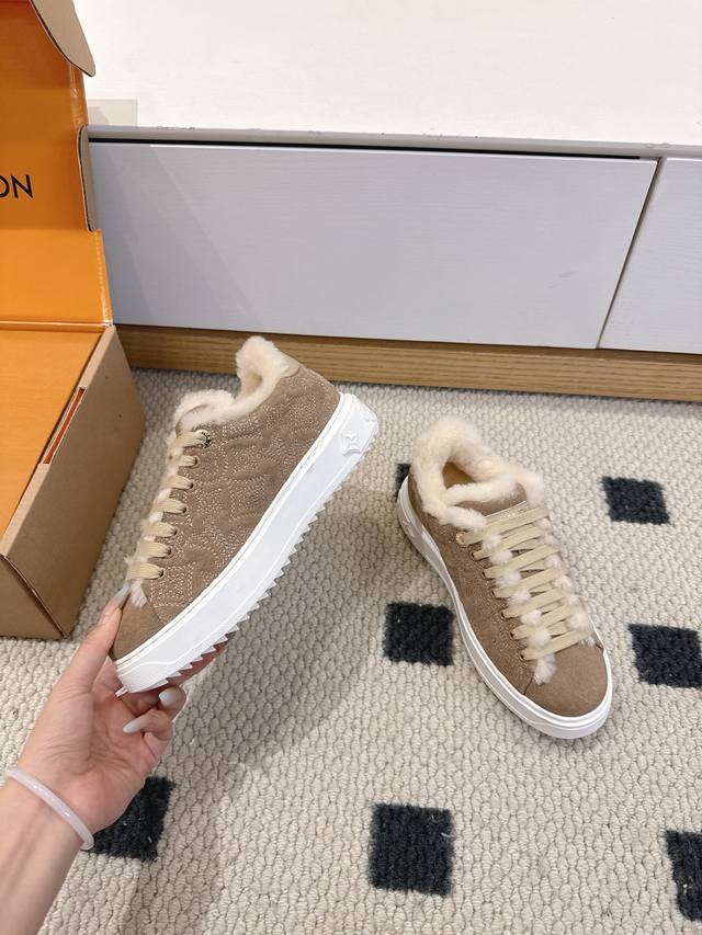 Louis Vuitton Time Out Casual Sneakers, White Sneakers with Fleece Lining DDD This Time Out sneaker combines cowhide leather with Monogram denim, echoing the season's leather goods collection. The denim luggage tag is secured to the upper with leather straps, showcasing Louis Vuitton's travel heritage. Striking eyelets and embossed brand logo on the tongue add sophisticated details DDD Original cow suede upper DDD Wool lining DDD Original molded outsole DDD Sizes: 35-40, 40 custom-made DDD