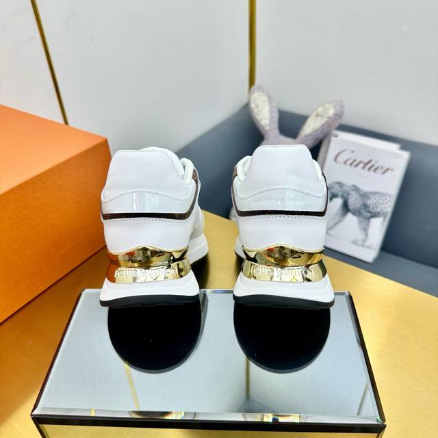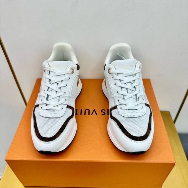 Louis Vuitton's official website is launching the Fall/Winter couple's collection. Inspired by running shoes, this Neo Run Away sneaker incorporates LV's iconic must-have into a trendy design. This version is a 1:1 replica of the original, crafted from two-tone calfskin to highlight its clean lines and distinctive wedge outsole. Key details include the LV initials on the side and a gold-plated heel stabilizer engraved on the back, along with a hidden insole. Sizes 35-42 and 39-46 are available. Full packaging included. High-quality replica. New and returning customers are welcome to inquire.