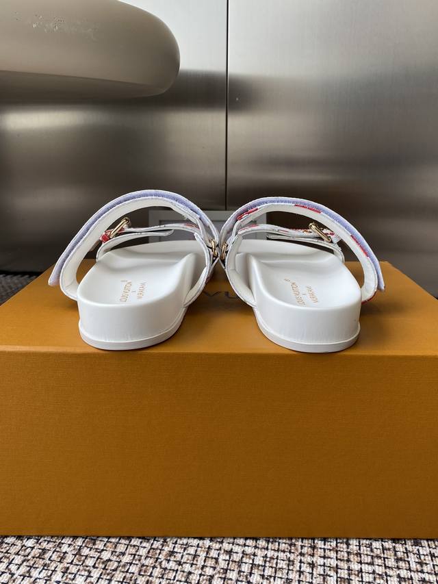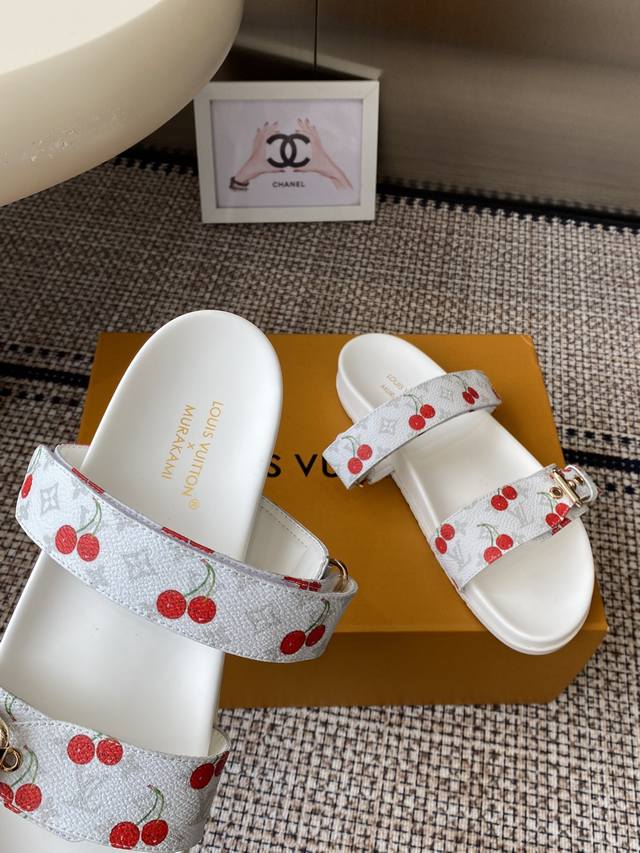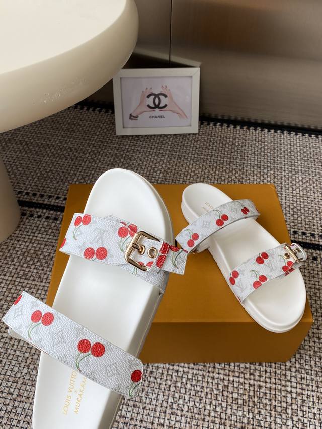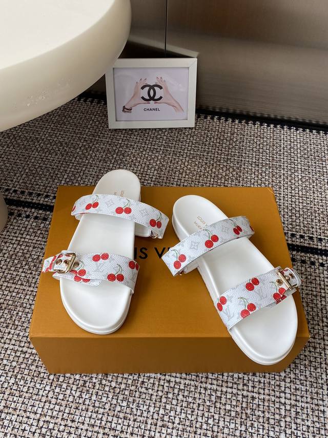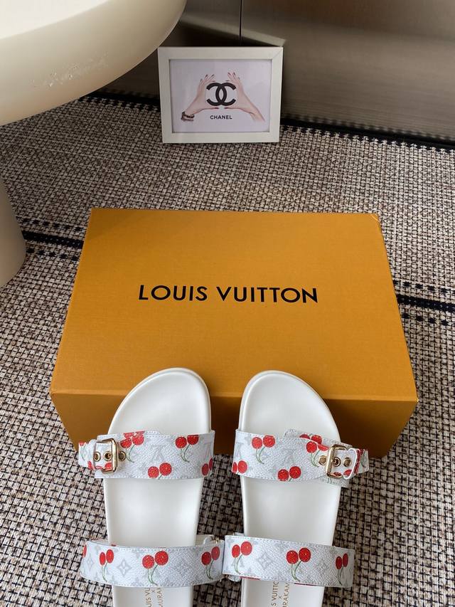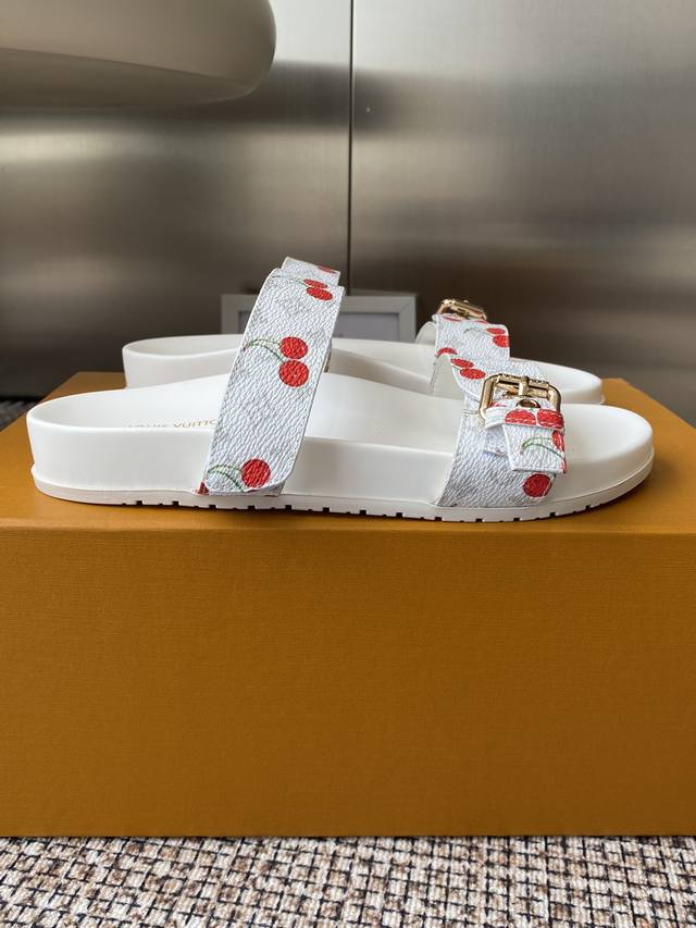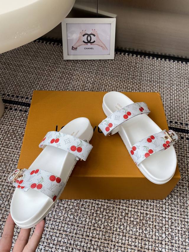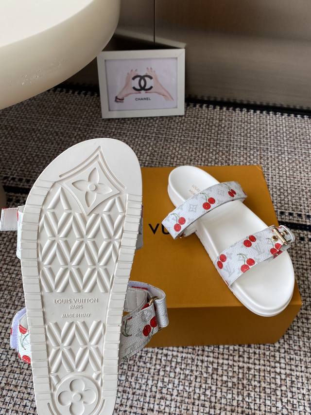 Lv 2025Ss Cherry Series new slippers with adjustable buckle design, full of beach style, original mold, Lv metal logo decoration, custom cowhide upper, imported jacquard fabric, original old flower leather, water-dyed sheepskin lining, three-layer combination outsole, water platform + wear-resistant velvet + rubber sole