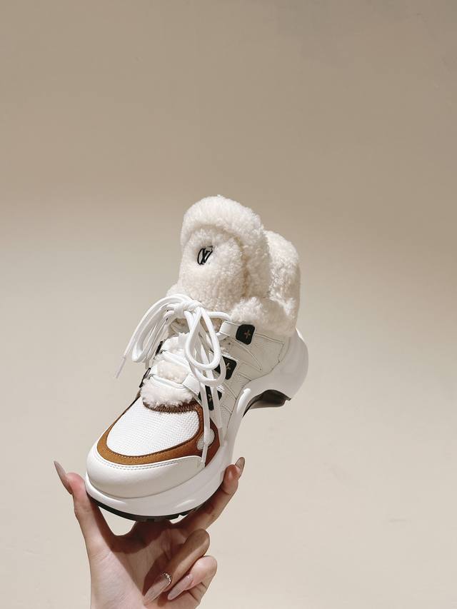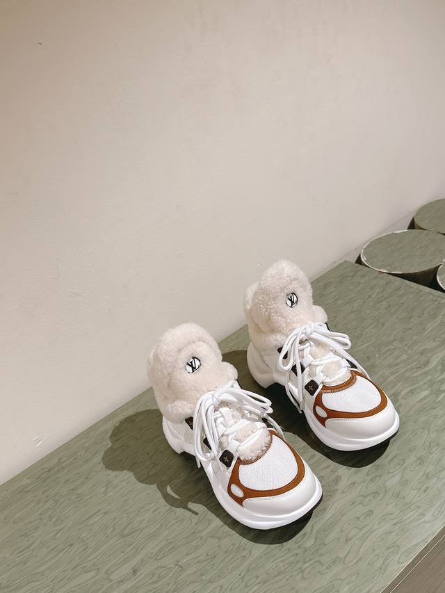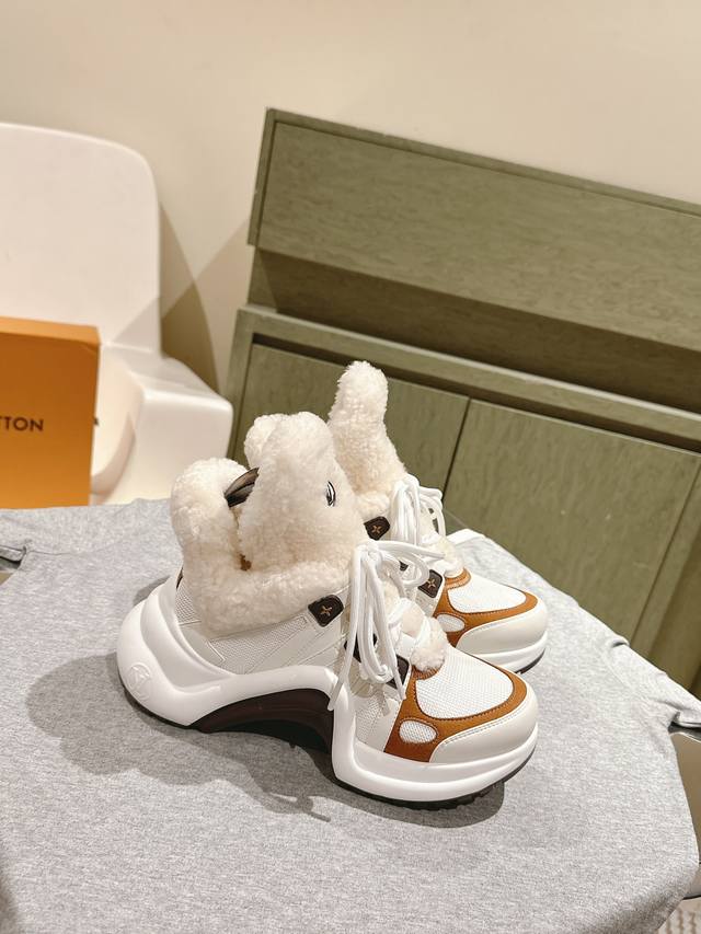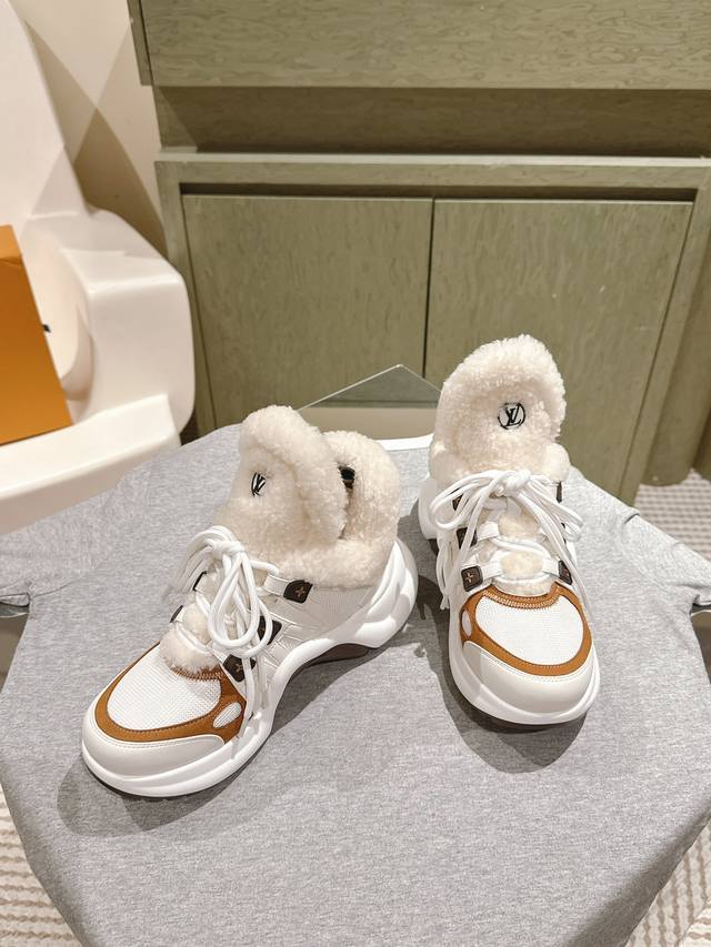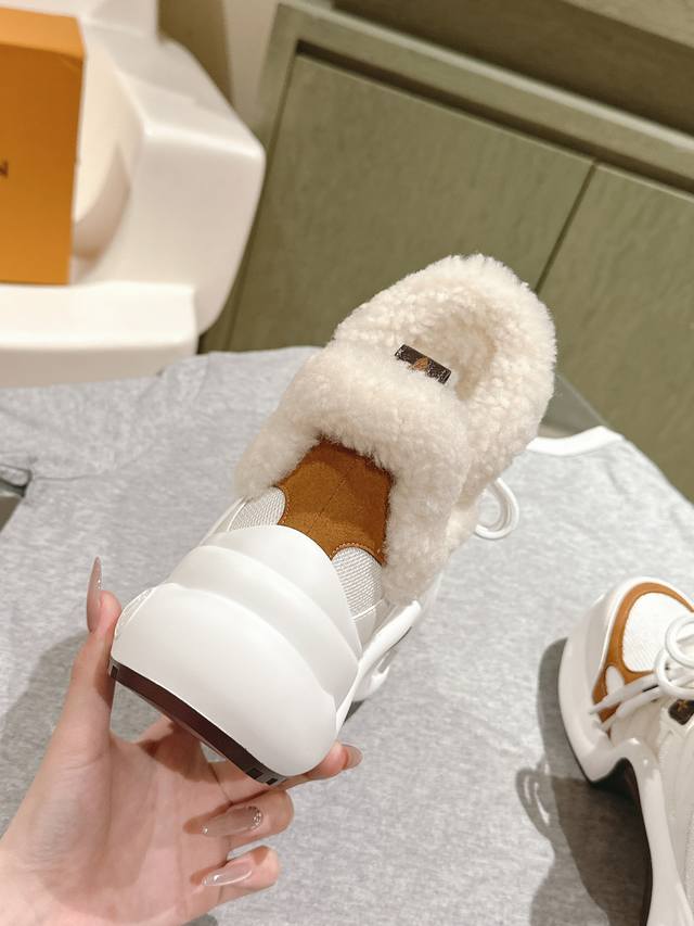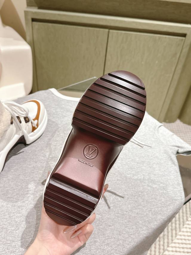 Lv Arch Bridge Sneakers ~ Exclusive Retail Match, Wool Lined Warmth Guarantee Upper: Original cowhide leather, wool lining! Durable and wear-resistant outsole: Original molded TPU, shock-absorbing, wear-resistant, excellent rebound, makes your feet look incredibly slim. Lightweight and comfortable! 6.5cm height increase. Sizes: 35-41. Full package. Sizes 40 and 41 are custom-made, no returns or exchanges.