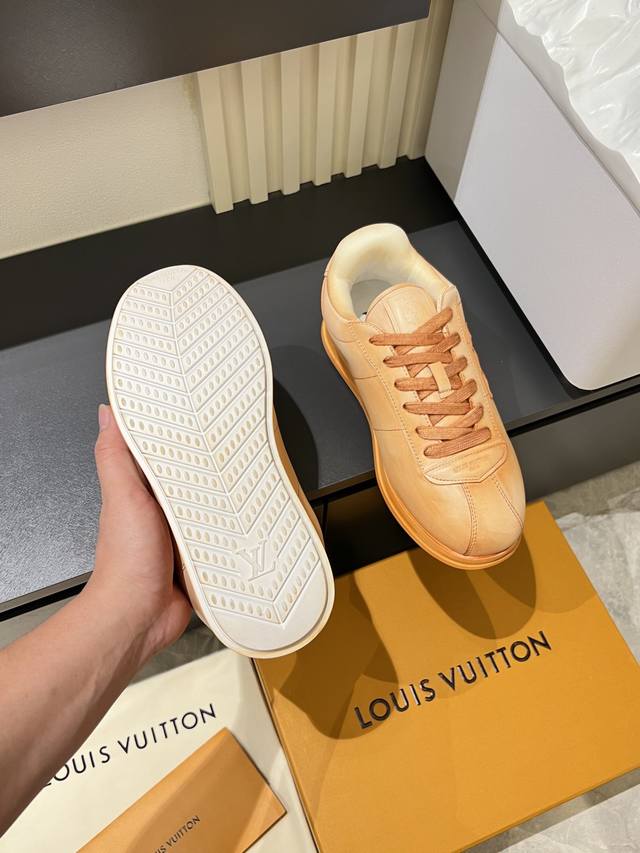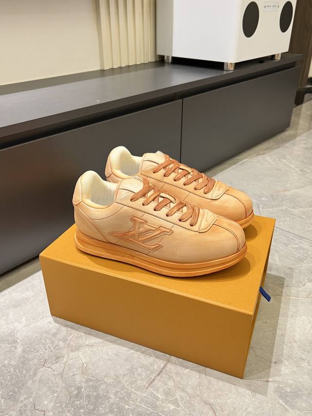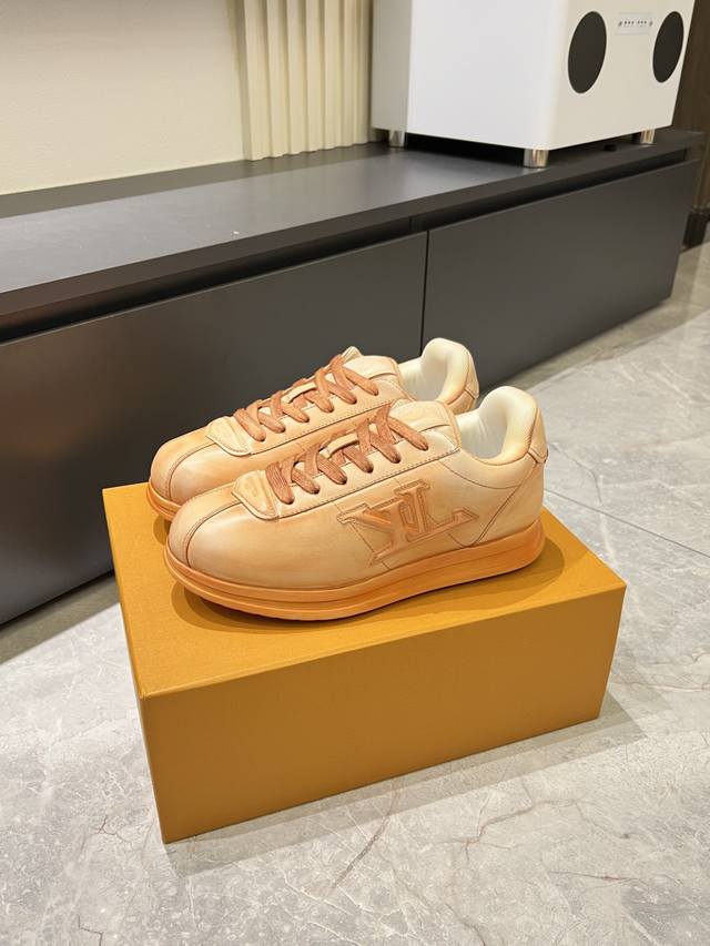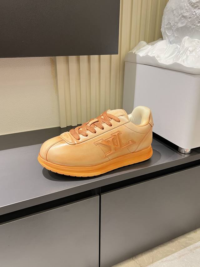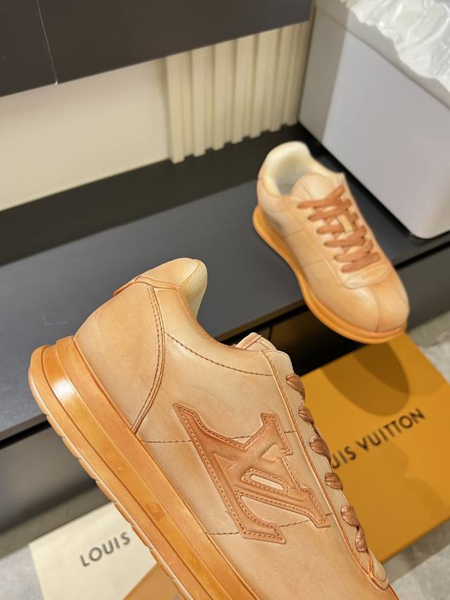 Lv Buttersoft sneakers, designed by Pharrell Williams, are inspired by the classic sneaker trend of the 1960s. The upper is made of sheepskin and cowhide leather, with padding for a softer and more comfortable feel. The sides feature embossed Lv logos, a lobster, and a portrait, showcasing the brand's craftsmanship through meticulous details. The white rubber outsole offers excellent grip and durability, making it suitable for both everyday wear and trendy occasions! Size: 38-44, 45 (custom orders available)