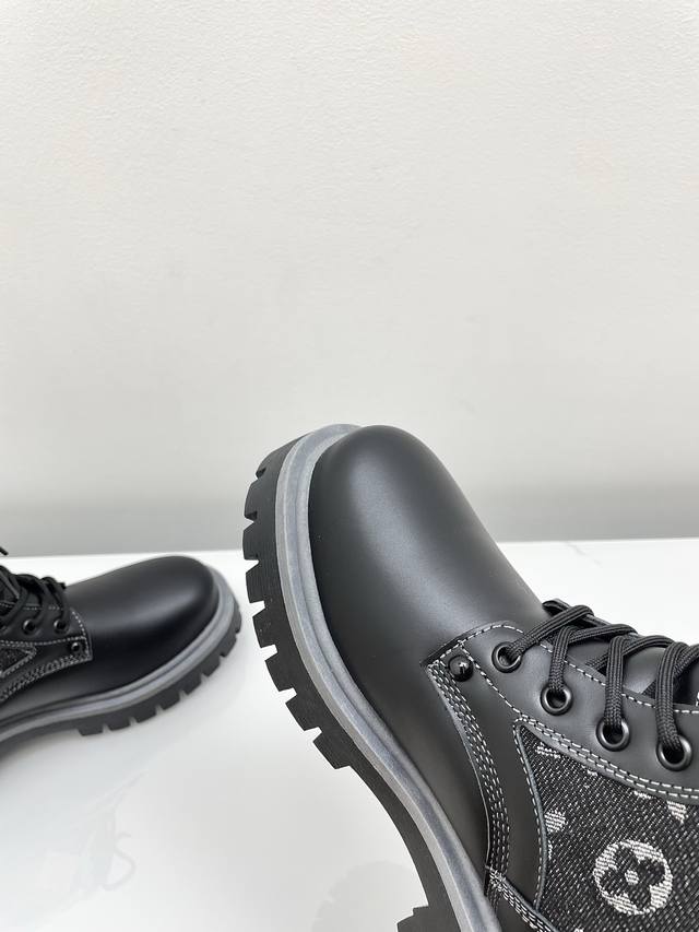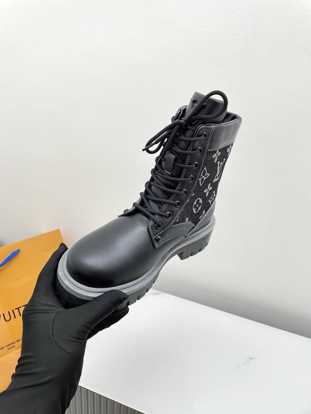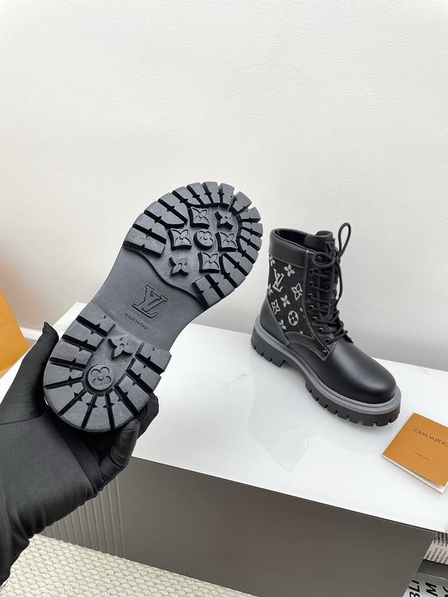 Lv Couple Style Autumn/Winter New Thick-Soled Lace-Up Ankle Boots with Monogram Pattern! Upper: Original Custom Imported Top Layer Cowhide Lining: Original Custom Leather Outsole: Original Mold-Made Non-Slip Rubber Material Sole Thickness: 4.5cm Size: Women's 35-41, Men's 39-45, Women's 40-41, Men's 45. Custom orders, no returns or exchanges.