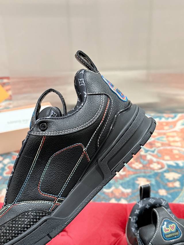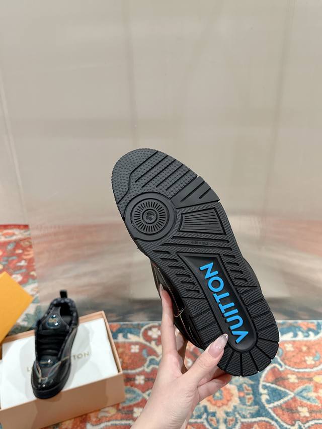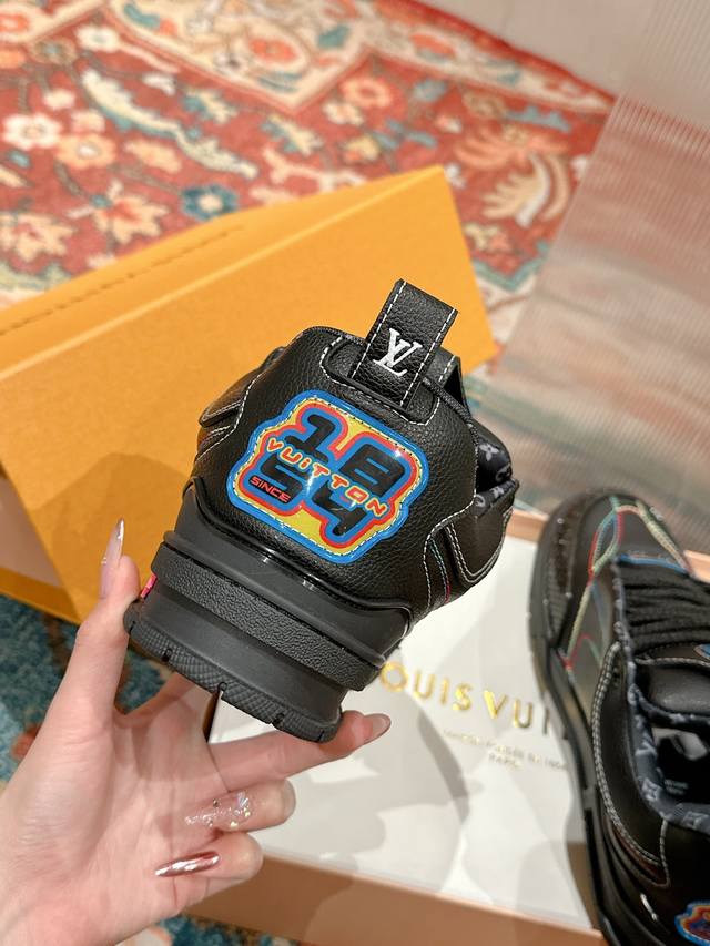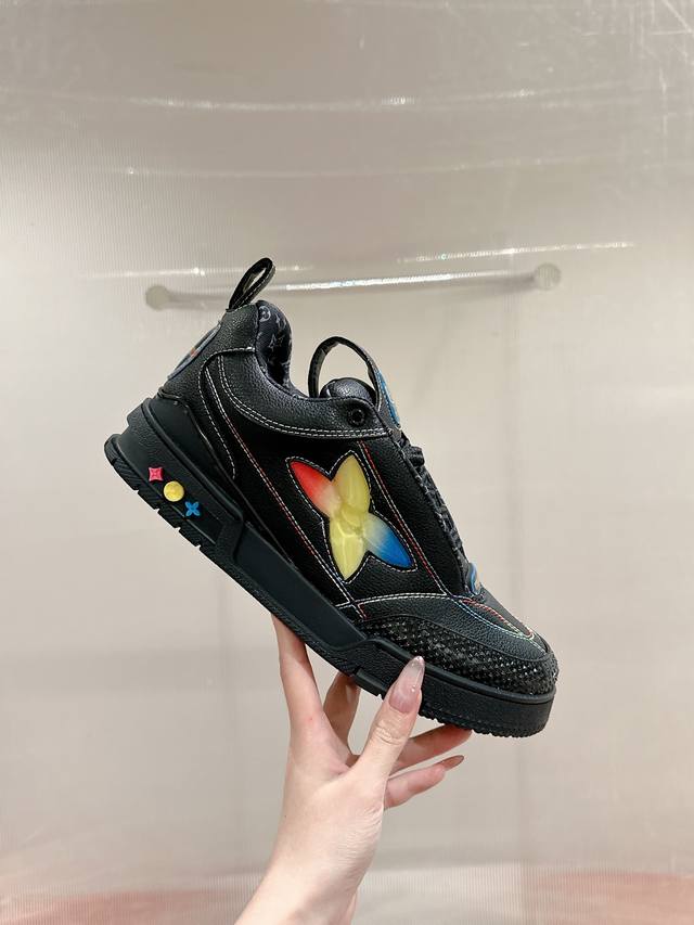 Lv (Louis Vuitton) Skate Series Latest Colorway Tariner Sneakers, Clover Skate Shoes, Couple Retro Basketball Shoes. This Lv Skate sneaker features vibrant details on the grained cowhide leather upper, echoing the seasonal leather goods and ready-to-wear collection. The side of the sneaker features a gradient Monogram floral pattern. The padded tongue and Mini Monogram fabric lining collar showcase inspiration from 1990s skate shoes. Material: Original custom top-grain cowhide. Lining: Imported breathable mesh. Outsole: Original molded anti-slip TPU material. Sole thickness: 3.5cm. Size: Women's 35-40, Men's 39-44, Women's 40, Men's 45-46. Custom orders are non-refundable.