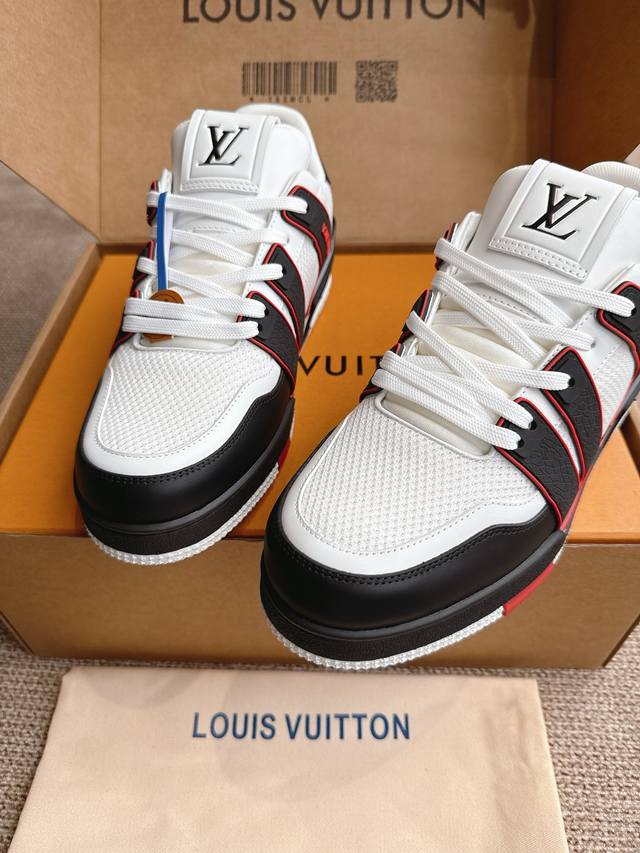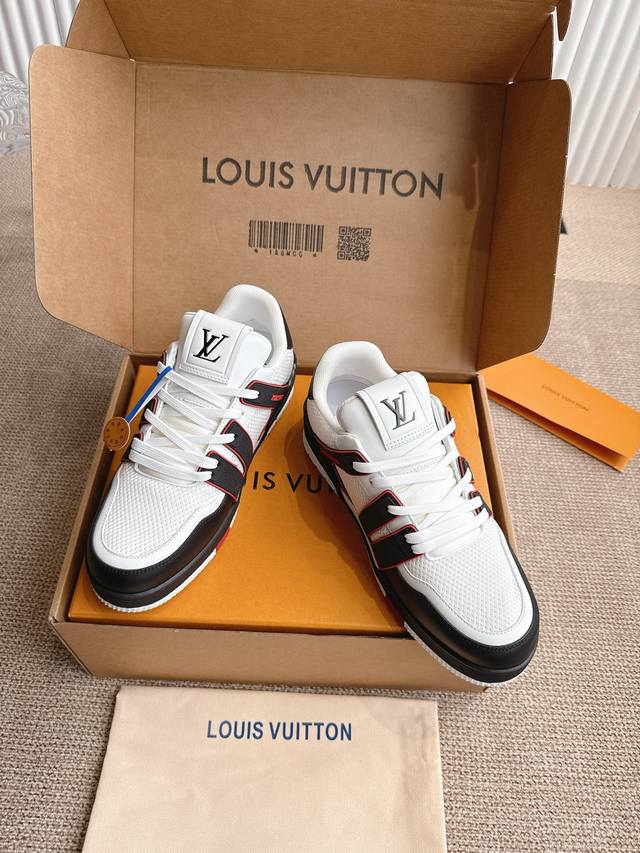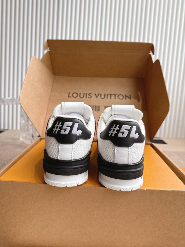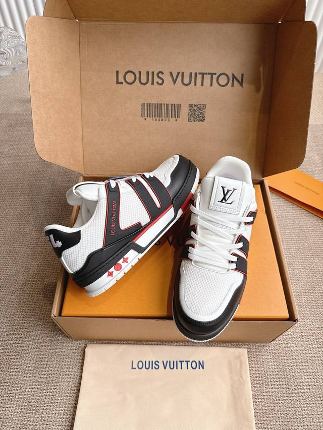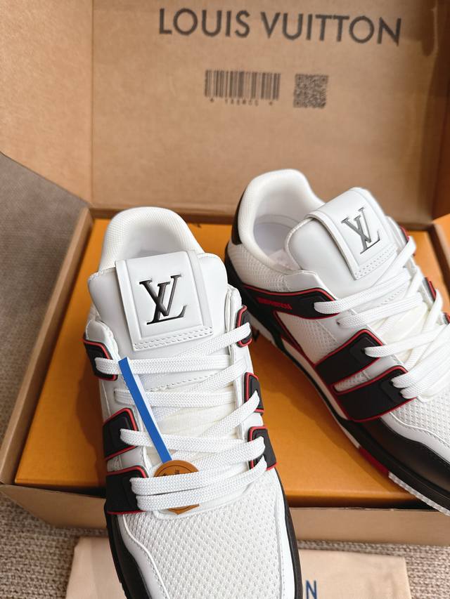 introduce the loose silhouette of the ready-to-wear collection to Virgilabloh's Lvtrainer sneaker design, making a striking appearance on the Spring/Summer menswear runway. The cowhide leather upper is combined with rugged fabric laces, and colorful beads highlight the brand's classic elements. Lv letters are marked on the tongue, and Monogram flowers are located on the outsole.