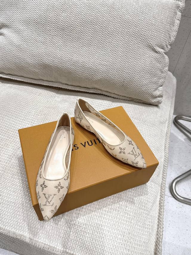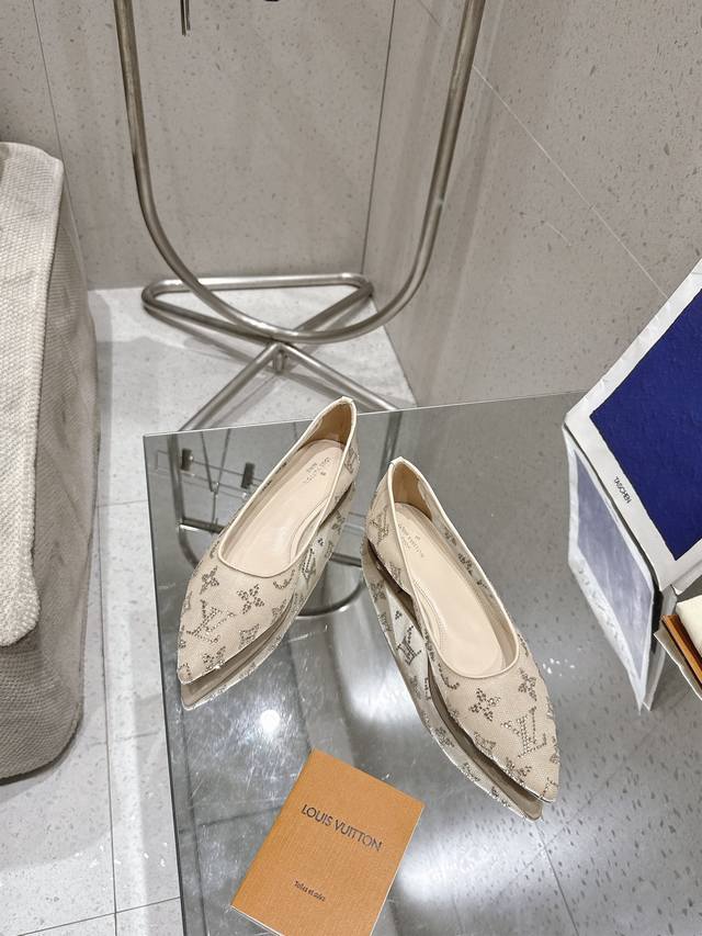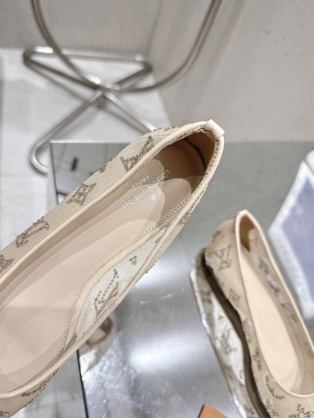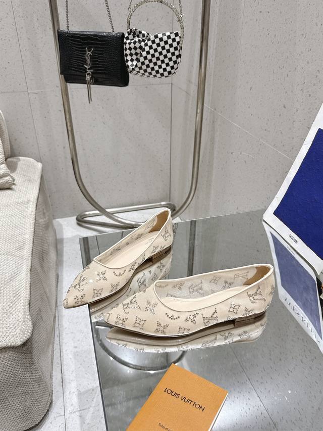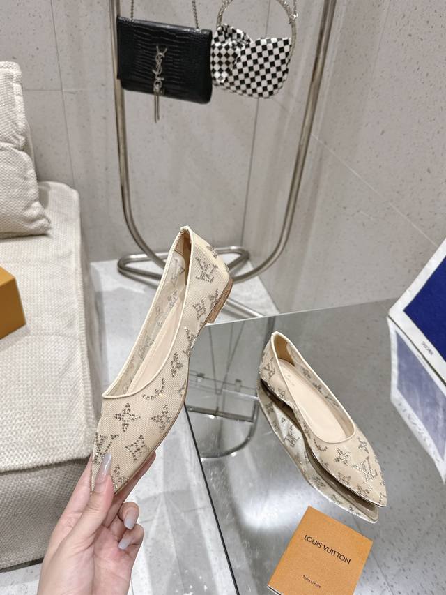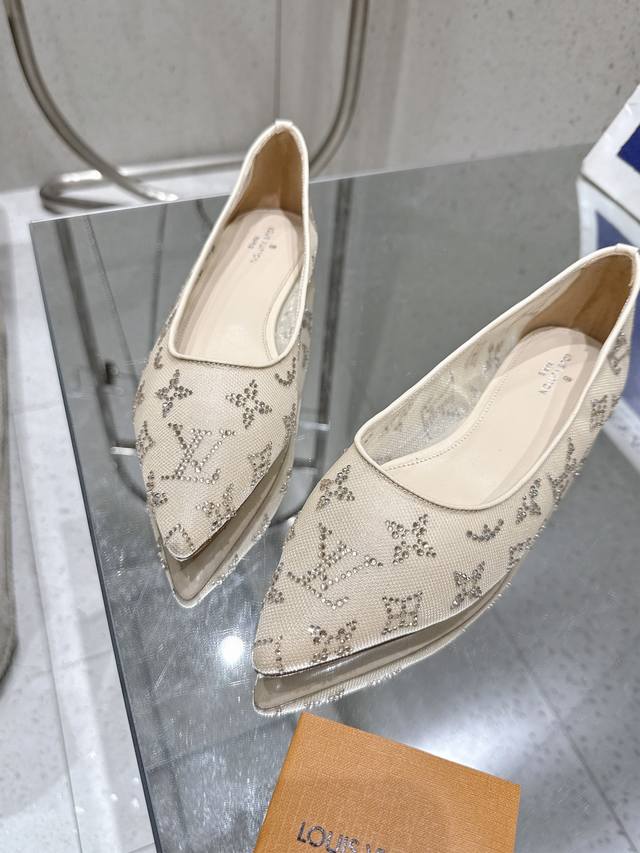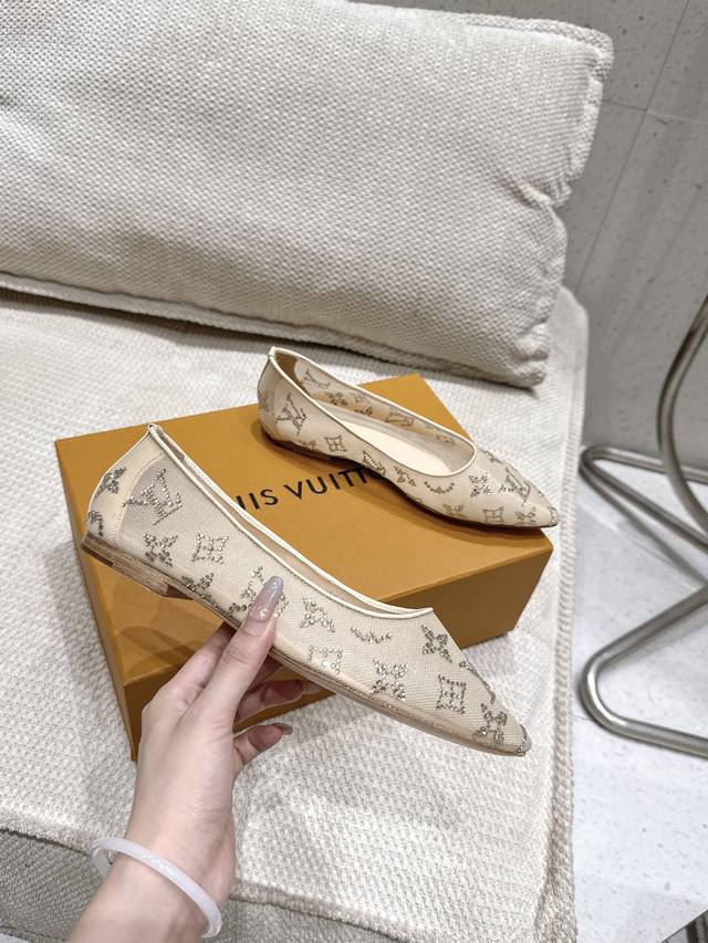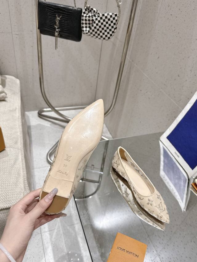 Lv Mesh Rhinestone Single Shoes DDD Loui & Vuitto 2025 New Top-Tier Version DDD This Gala high heel features a mesh upper embroidered with a dazzling rhinestone Monogram pattern, making it an elegant choice for evening outings. The smooth lines of the upper complement the slender heel perfectly. The delicate leather outsole is adorned with metallic LV lettering. DDD Upper: Mesh with Rhinestones DDD Lining: Sheepskin lining + Sheepskin insole DDD Outsole: Italian genuine leather outsole DDD Heel Height: Flat DDD Sizes: 35-41 Sizes 40 and 41 are custom-made and non-refundable DDD